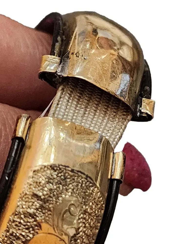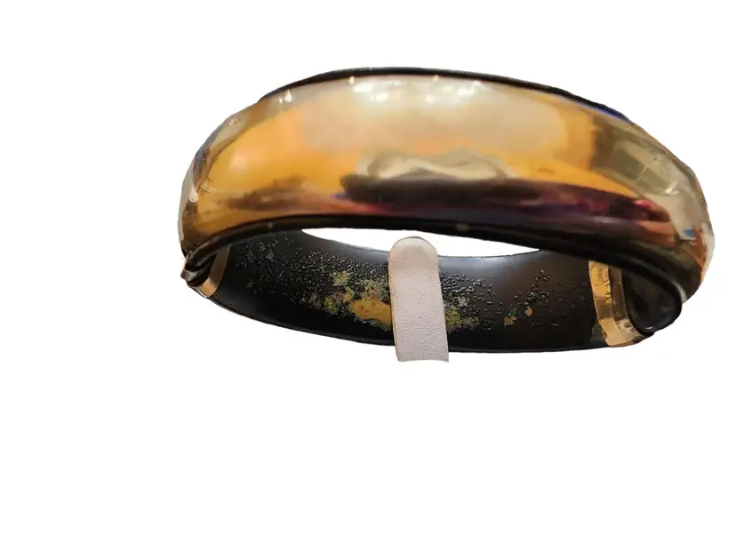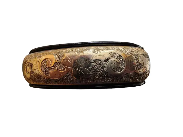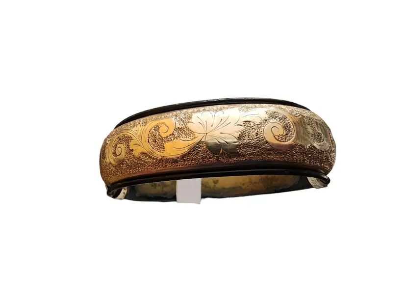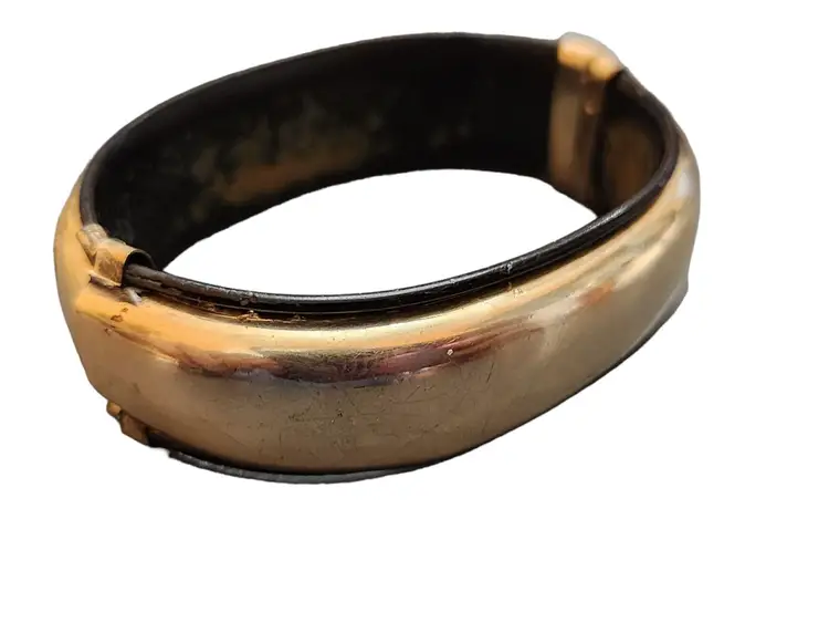 Size: Inner circumference is almost 2.25" Color: Gold Condition: Good; Edges stick out a bit on one side of each side. There are some light dents and some missing enamel on the inside of the bangle. Era: Circa 1900s Signed: None