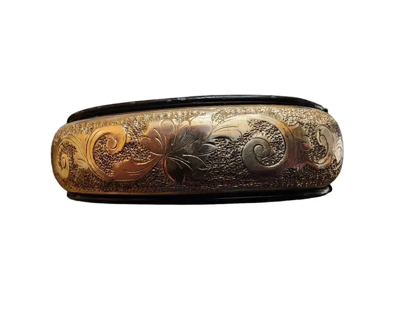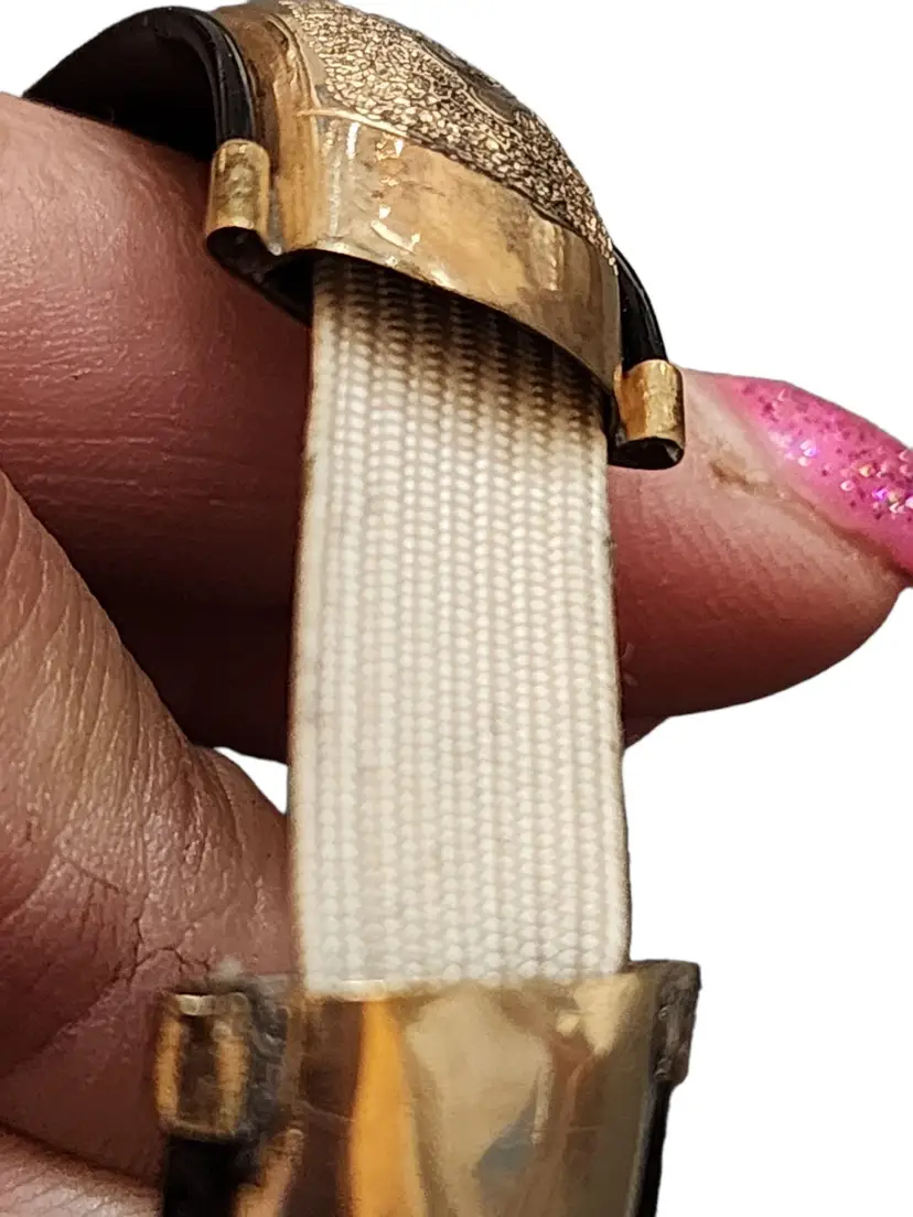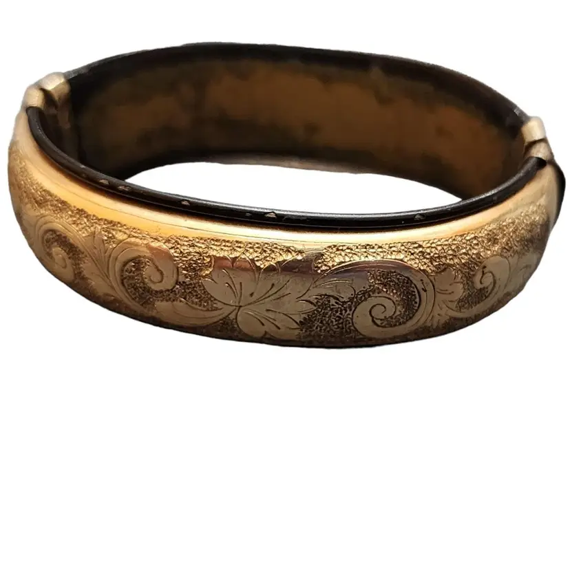 This antique Victorian gold-filled bracelet features intricate, beautiful detailing and a stretch elastic inside for easy wearing.