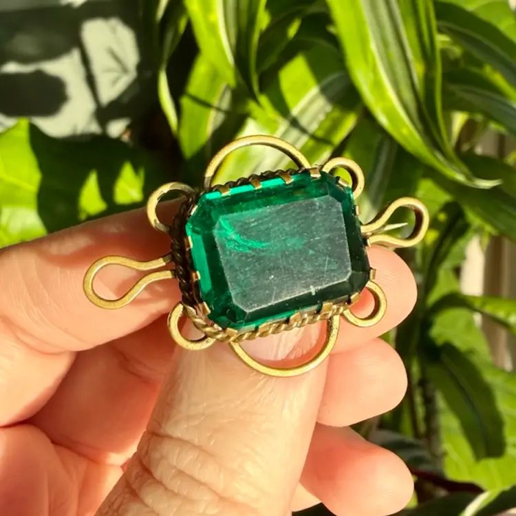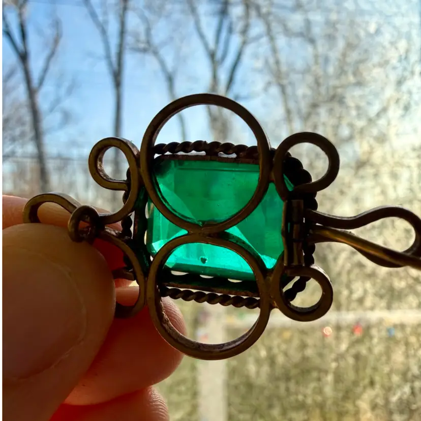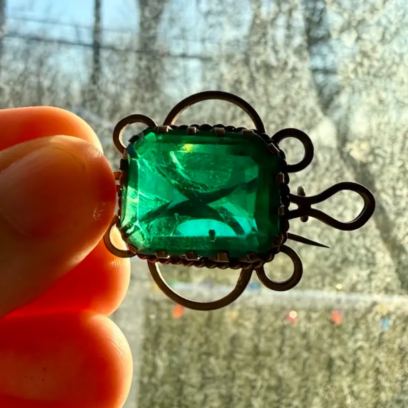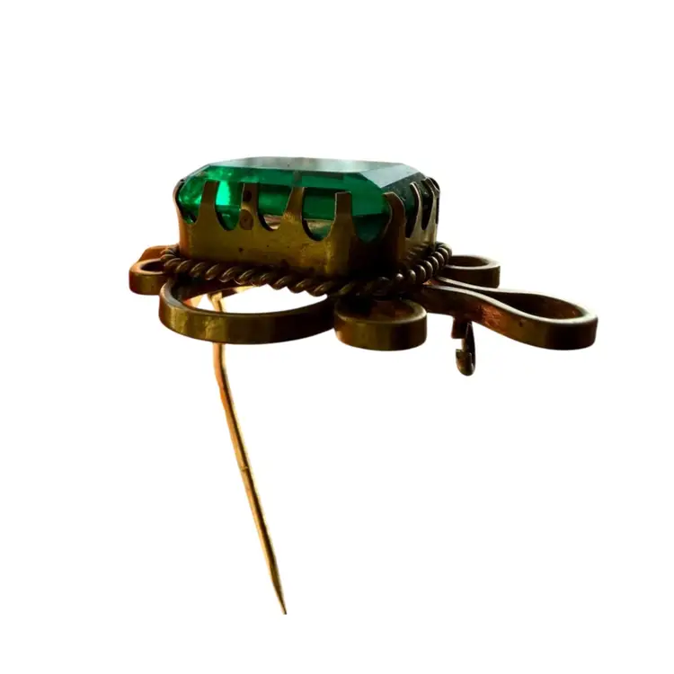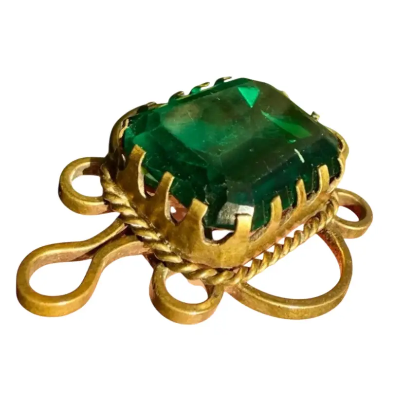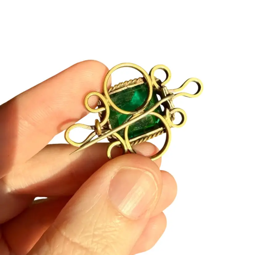 1 1/8”x1 5/8”. Antique Victorian brooch dating to approximately the late 1800’s. Features a large faceted emerald-green glass paste stone set in an ornate gold-tone wirework and rope-twist frame. The stone shows age-appropriate surface wear and an internal bubble or ash fleck, consistent with antique glass paste jewelry. Original C-clasp closure with long pin, typical of 19th-century construction. *NOTE pin doesn’t stay in c-clasp, needs to be re-worked. Unmarked. A striking and substantial piece with beautiful hand-worked details, allowing the large stone to be the focal point of the piece. Please review all photos closely as they are part of the description.