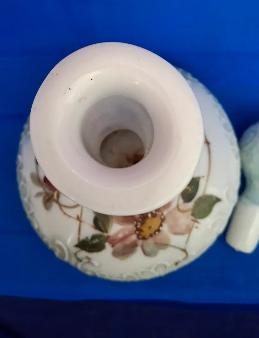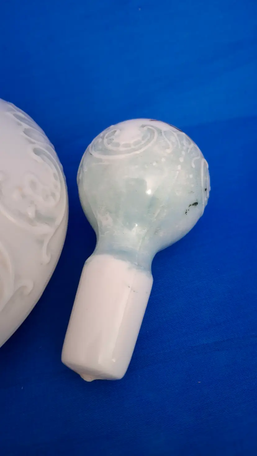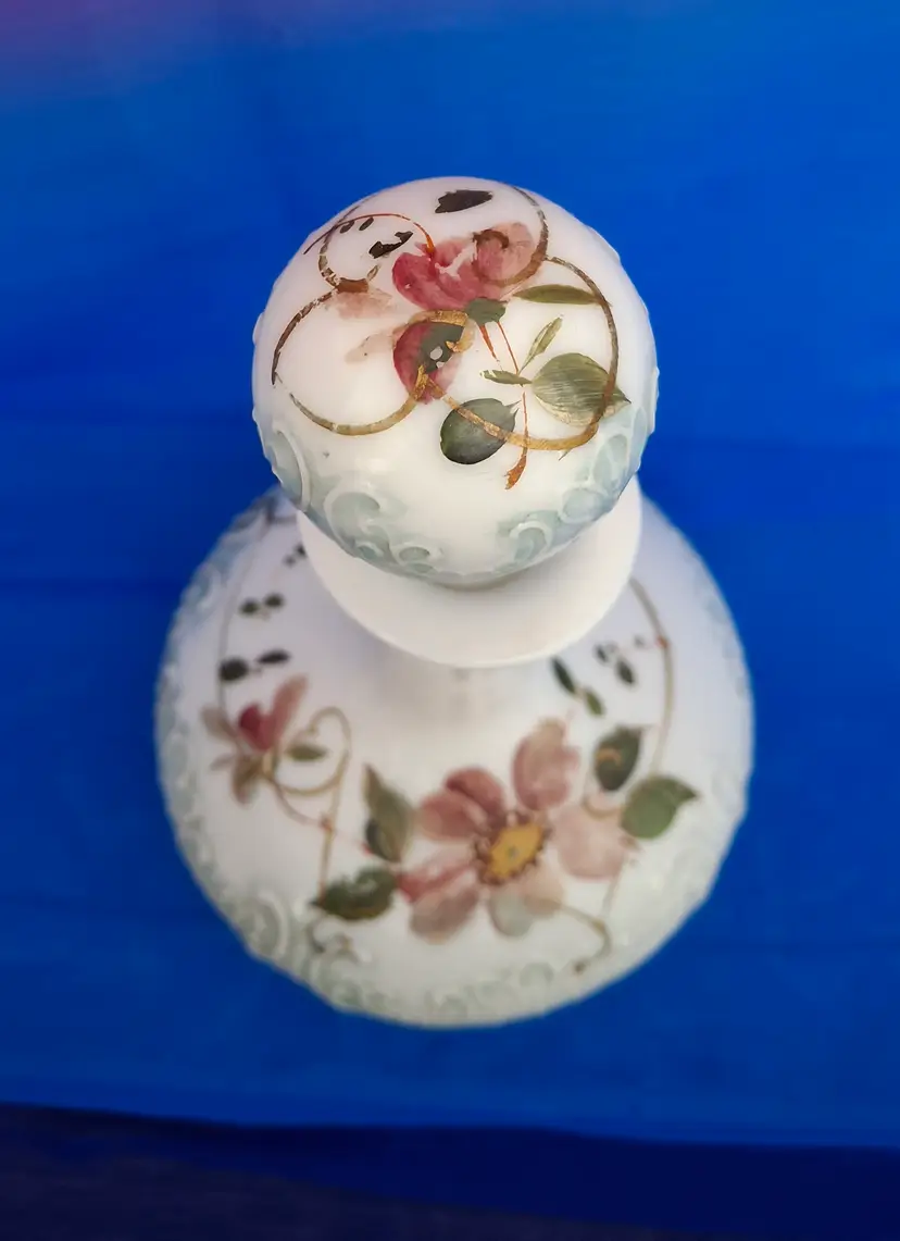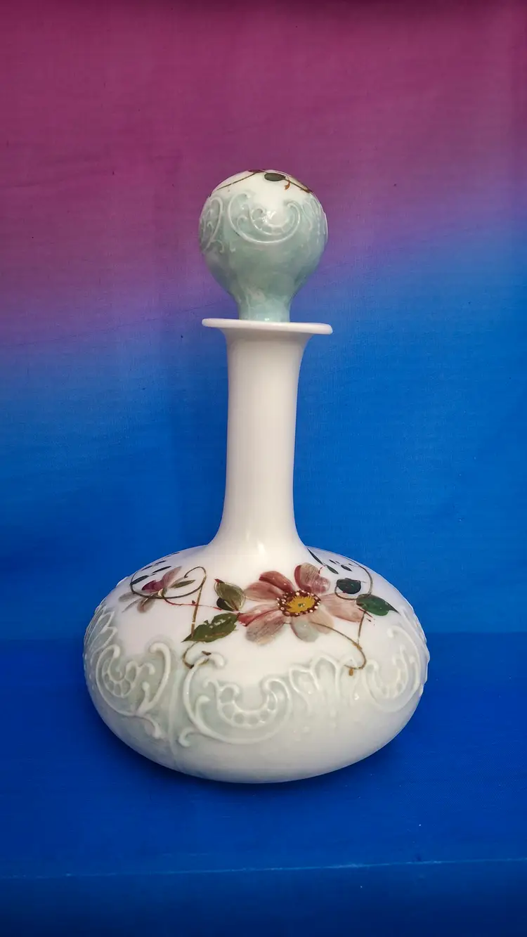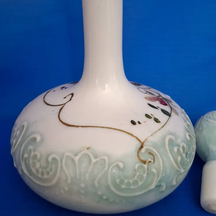 Antique Victorian Hand-Painted Milk Glass Barber Perfume Bottle is 6" wide x 9 3/4" tall. This is a beautifully embossed bottle with stopper and hand-painted with a floral design. A lot of the paint is in place which is fabulous for a piece this old. No chips, cracks or repairs. Please view the pictures and feel free to ask questions. Thank you for visiting my shop.