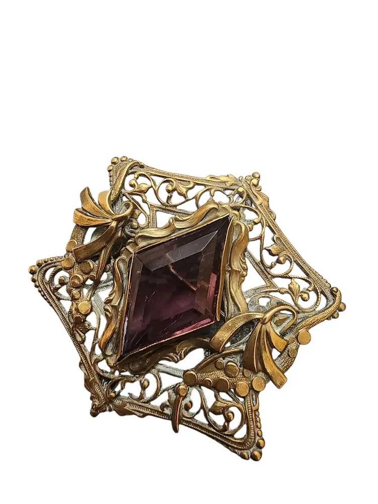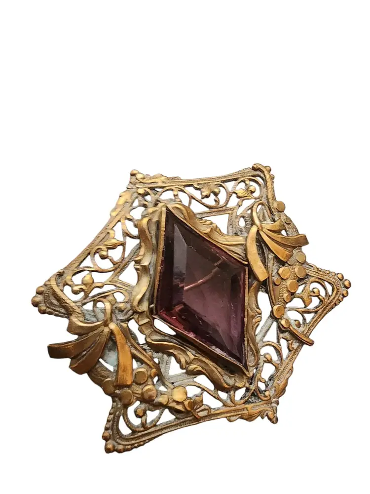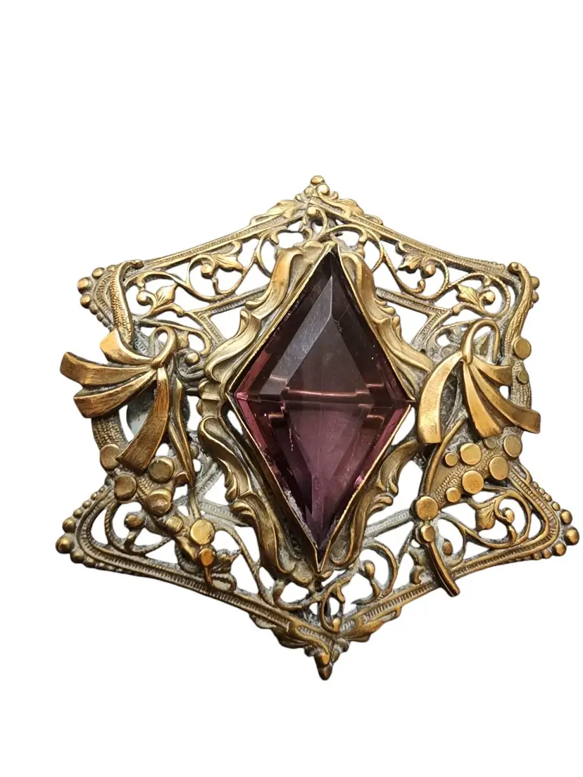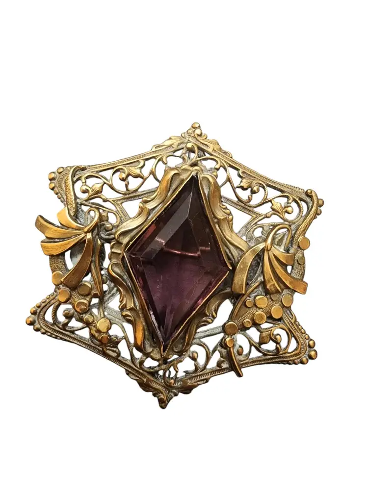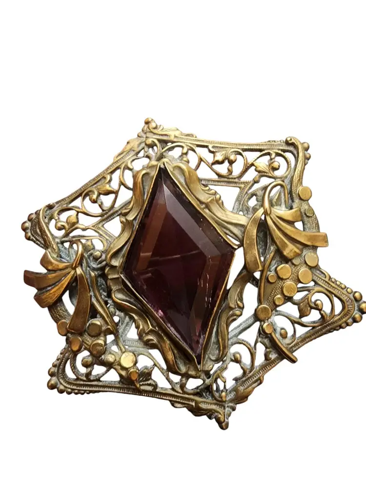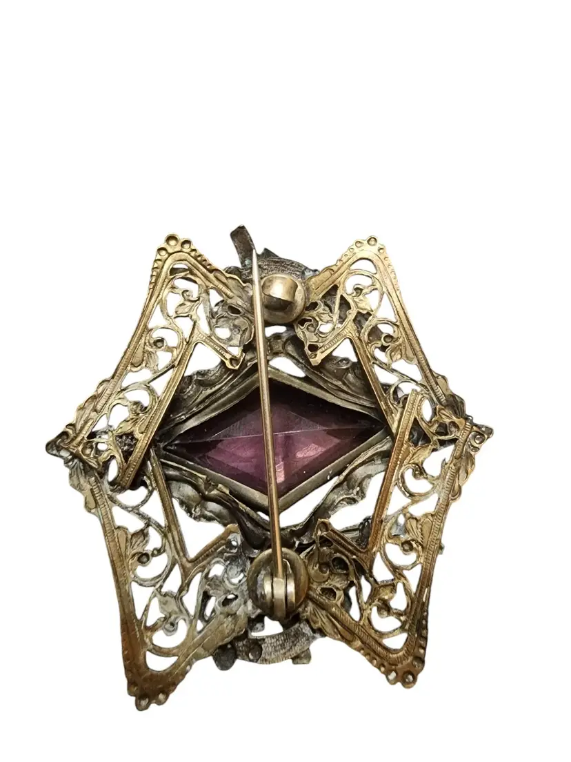 Size: 3.75" by 3.5" Color: Gold, Purple Condition: Very good Signed: None Details: Beautiful design, multi-faceted stone, bezel set. The glass has a few flea bites, and there is a little bit of verdigris. Secured with c clasp closure.