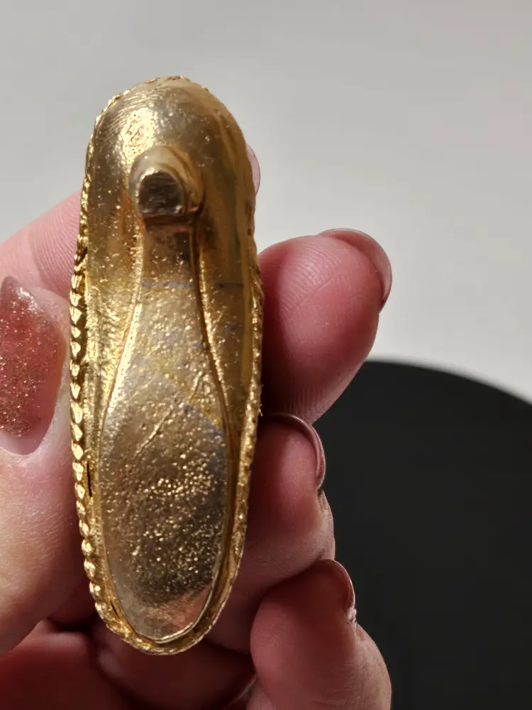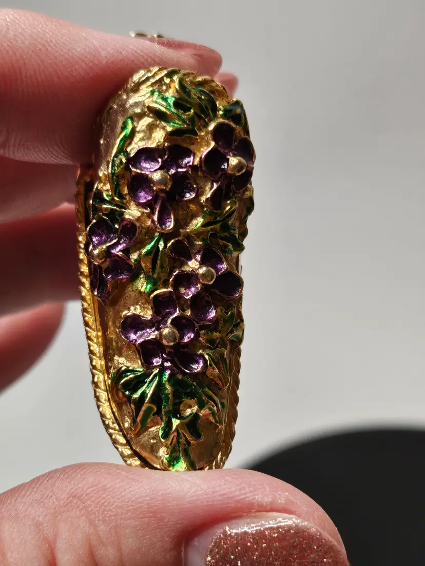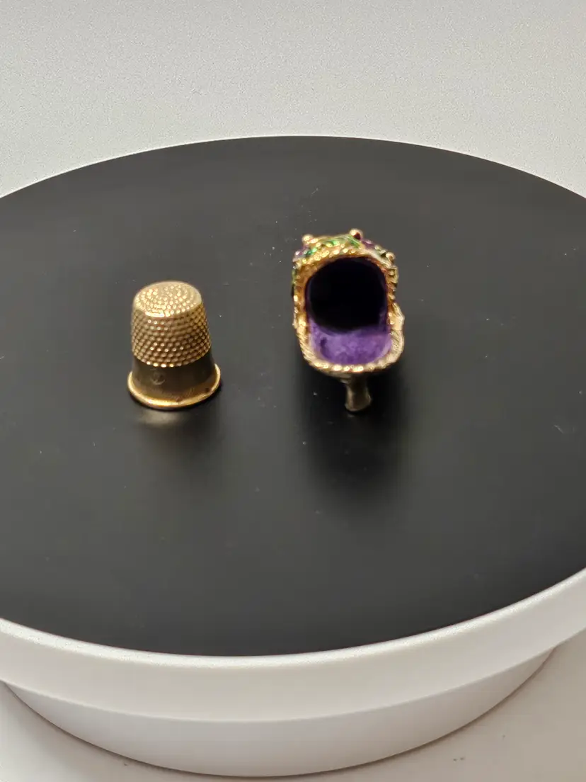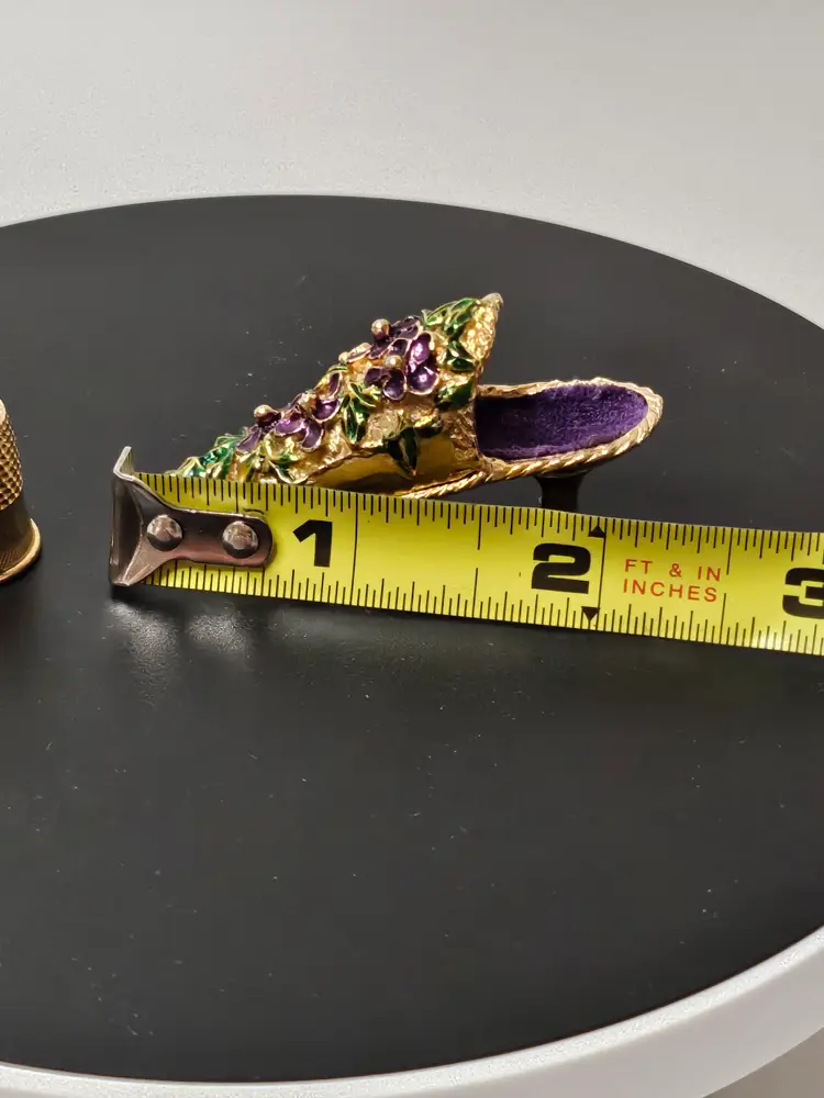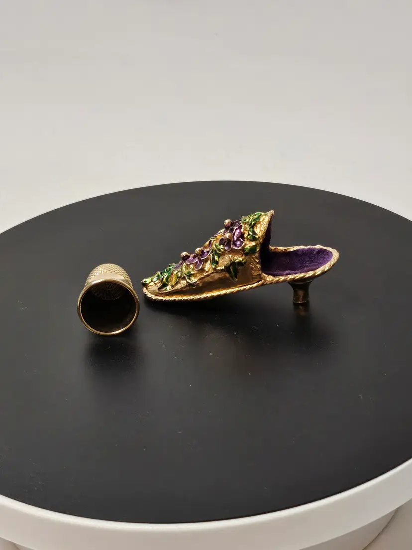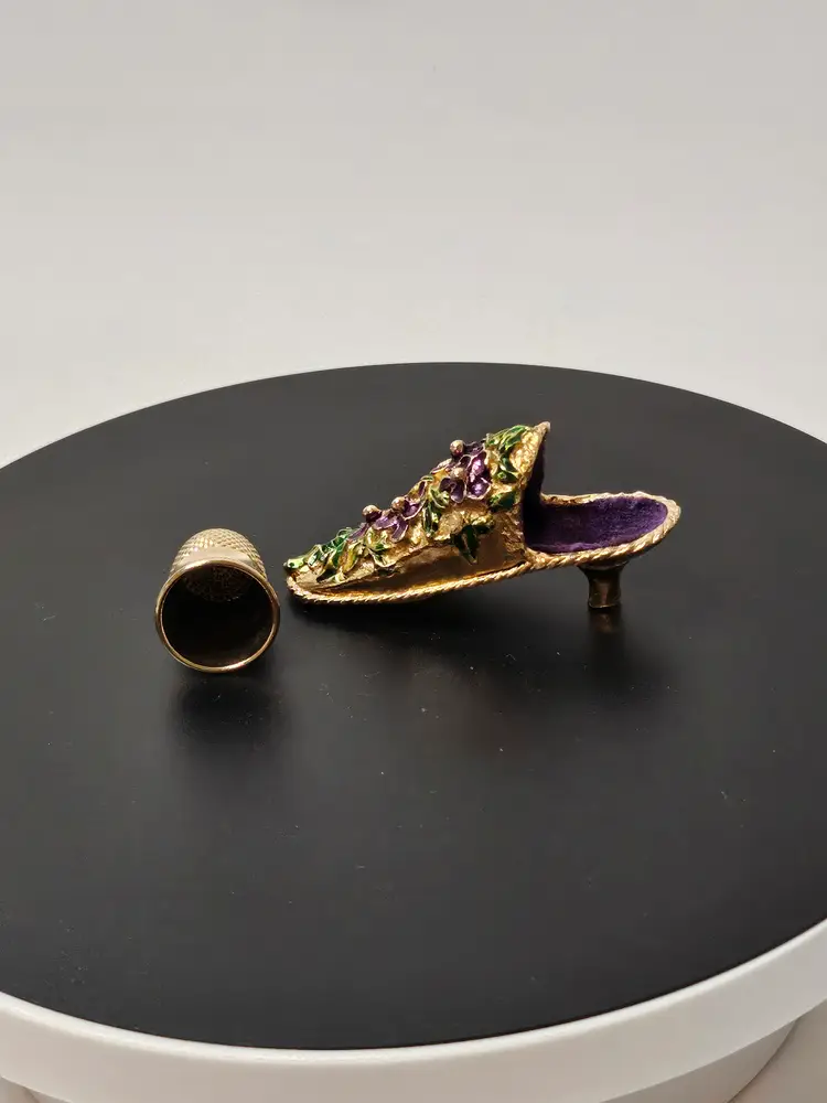 This Antique Victorian Shoe Slipper Thimble Holder is a unique and elegant piece that holds thimbles in a shoe or slipper shape, adorned with intricate purple and gold tone floral designs typical of the Victorian era. Made of metal and originating from before 1930, this thimble holder showcases the fine craftsmanship and attention to detail of that time period, making it a charming addition to any antique sewing collection or a lovely decorative piece for those interested in vintage decor.