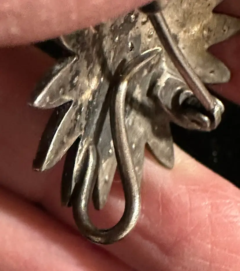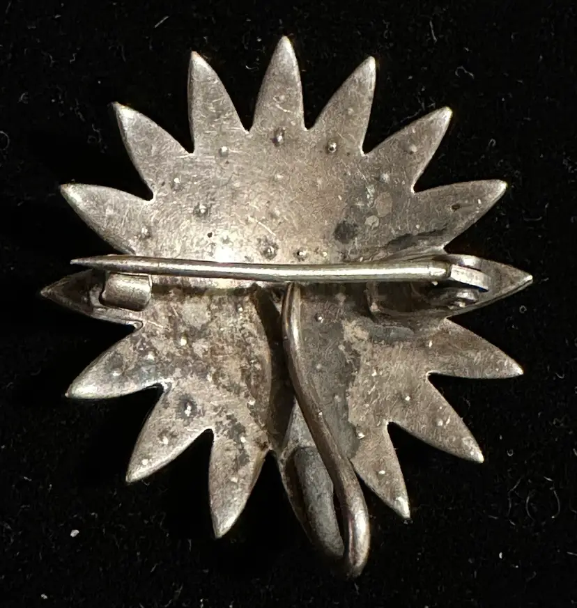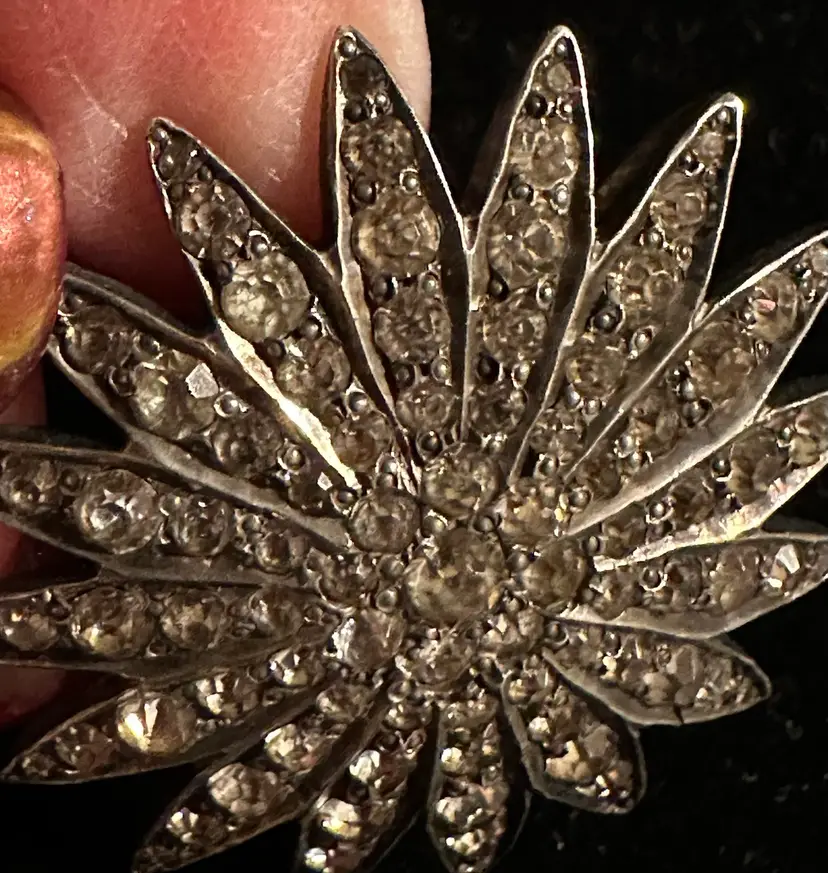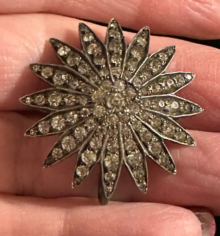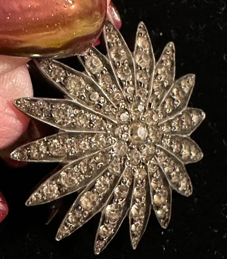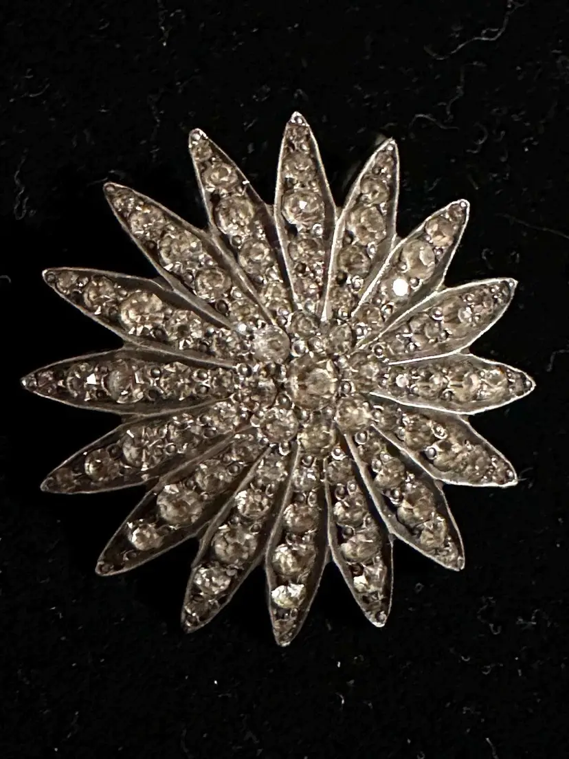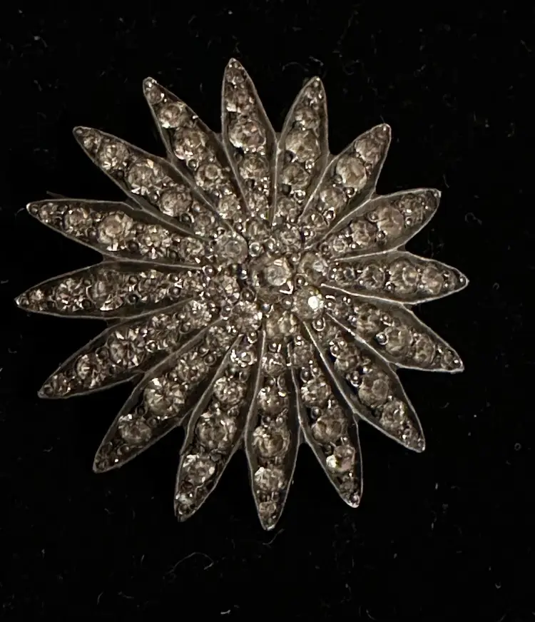Hard to find antique Victorian chatelaine pin. It is sterling silver and set with paste stones. The starburst pin measures 1.25” in diameter.
