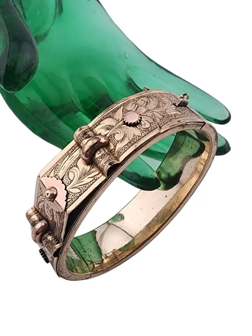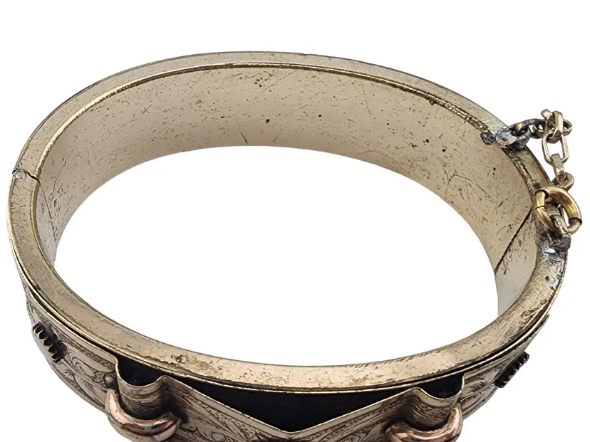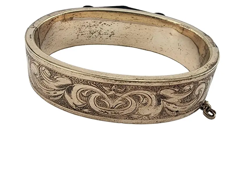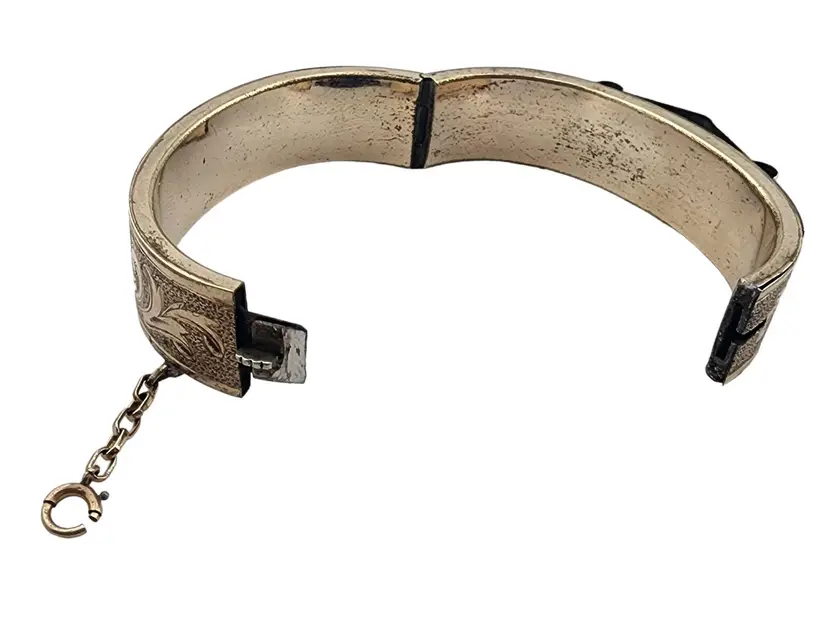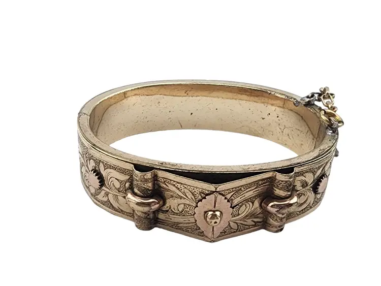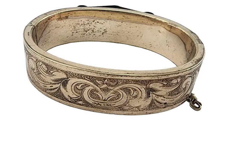 Size: Inner circumference 2.25" Color: Gold Condition: Very good Signed: None Details: Very ornate, chasing all around! It also has a short safety chain.