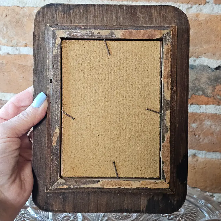Condition: This is an authentic vintage piece with age-appropriate wear. There are small chips on the wood at the bottom corners and top left edge. The back shows original nails holding the cardboard backing in place.