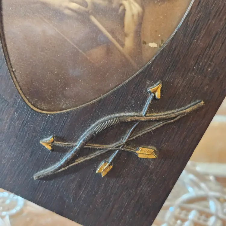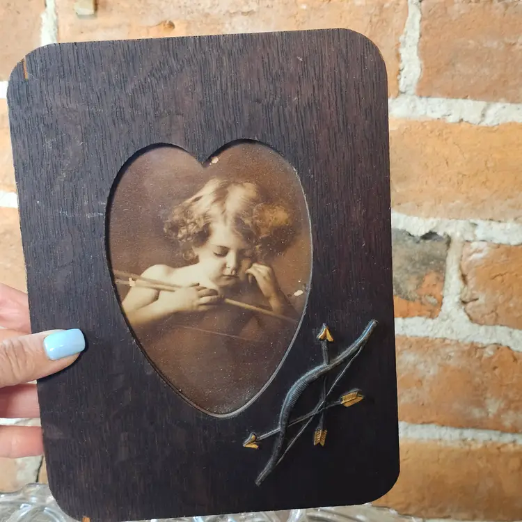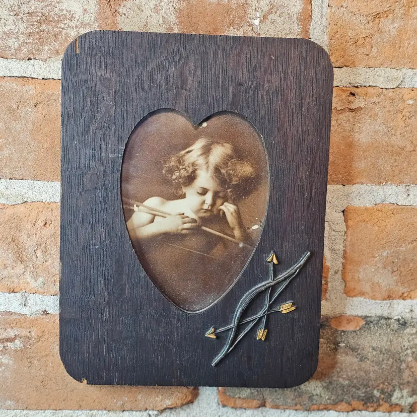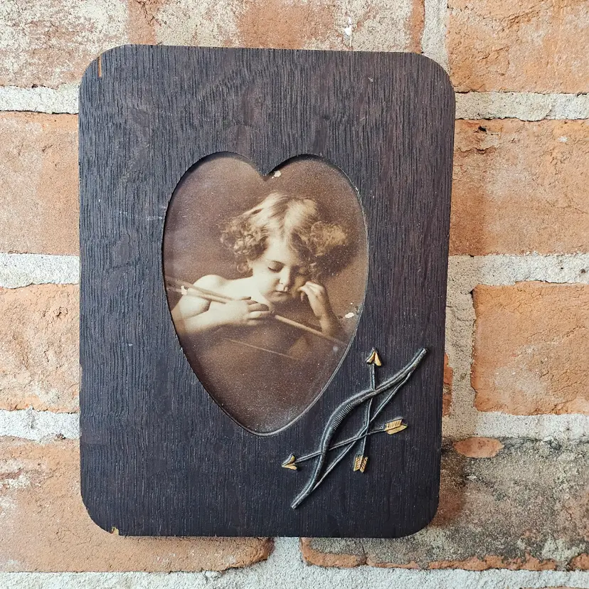 This is a beautiful antique/vintage dark oak wood frame featuring a heart-shaped cutout. Inside is a classic sepia-toned lithograph or print of a young Cupid (Cherub) leaning on his bow. The frame is accented with an applied metal bow and two crossed arrows in the lower right corner.