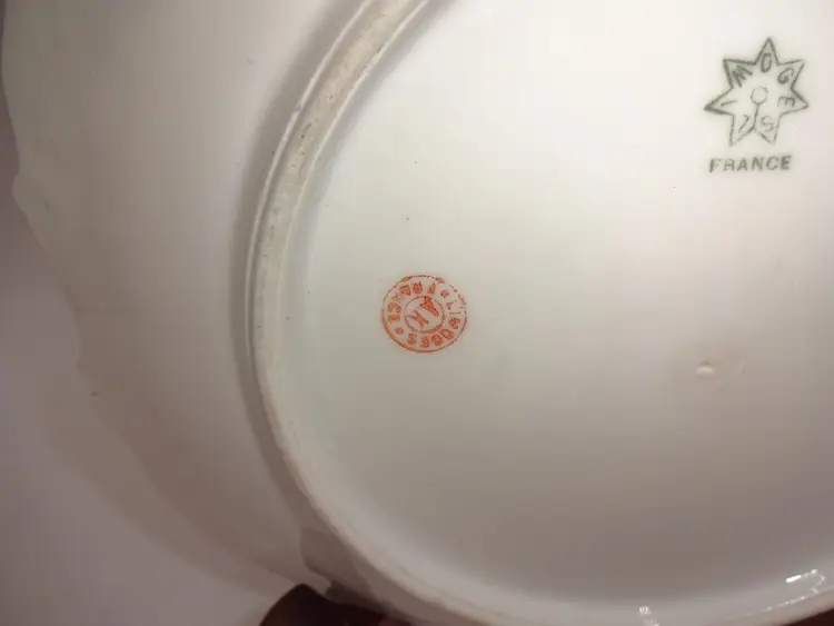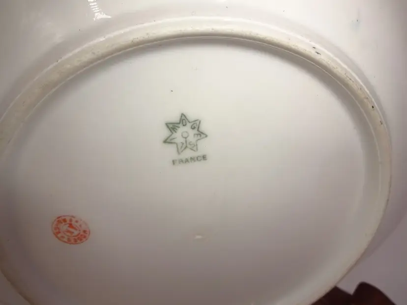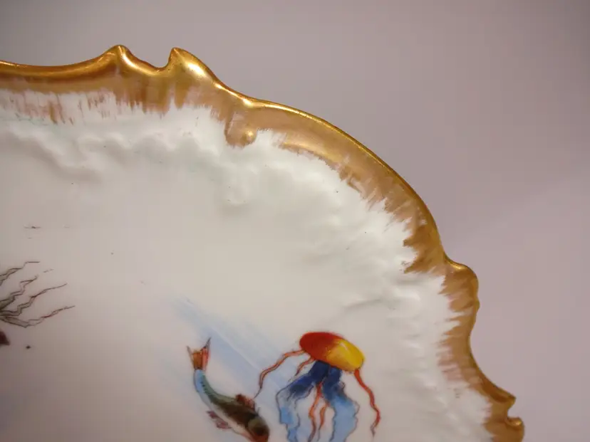 Good to very good pre-owned condition. A round plate with gold tone trim featuring four ocean fish, two jellyfish, and seaweed/sea plants. Made in France. It is approximately 9" x 1-1/4". No chips, cracks or stains. Manufacturer's flaws.