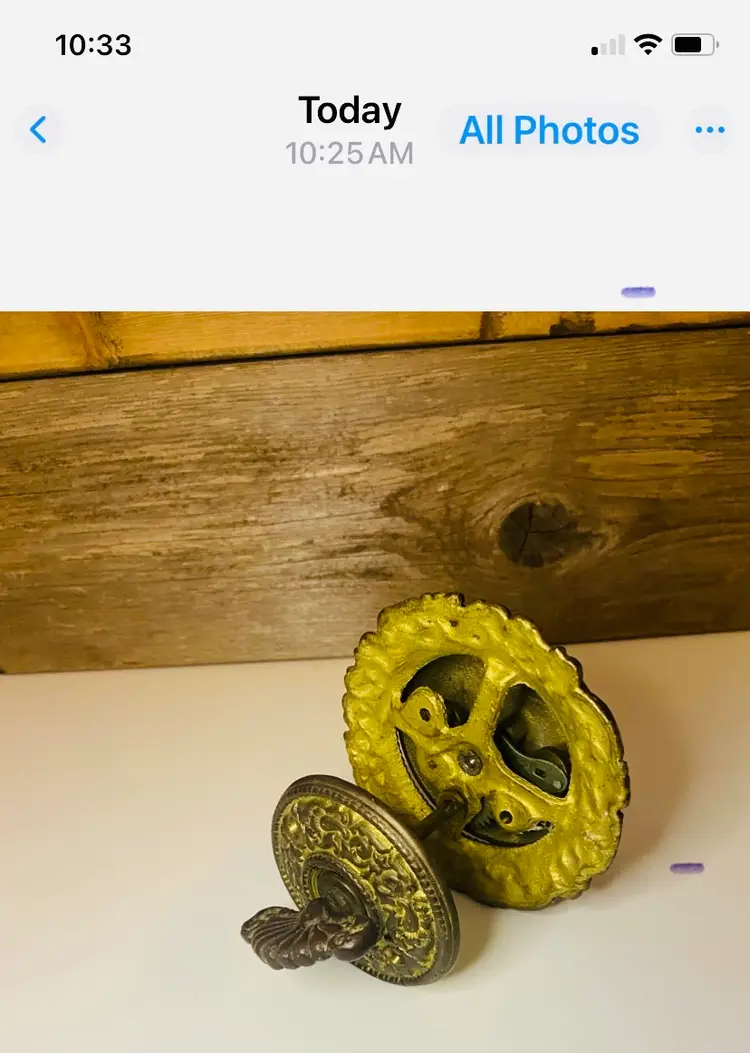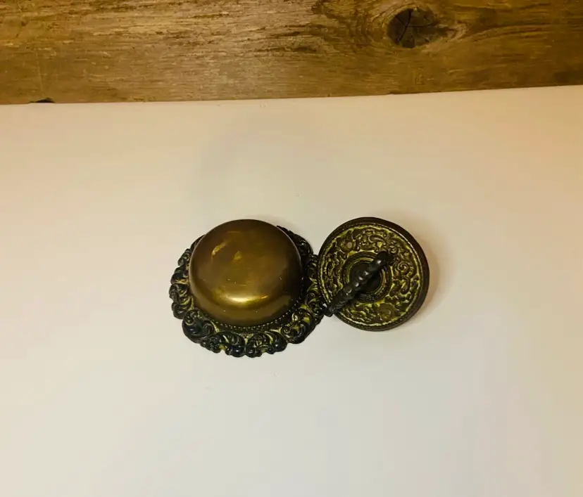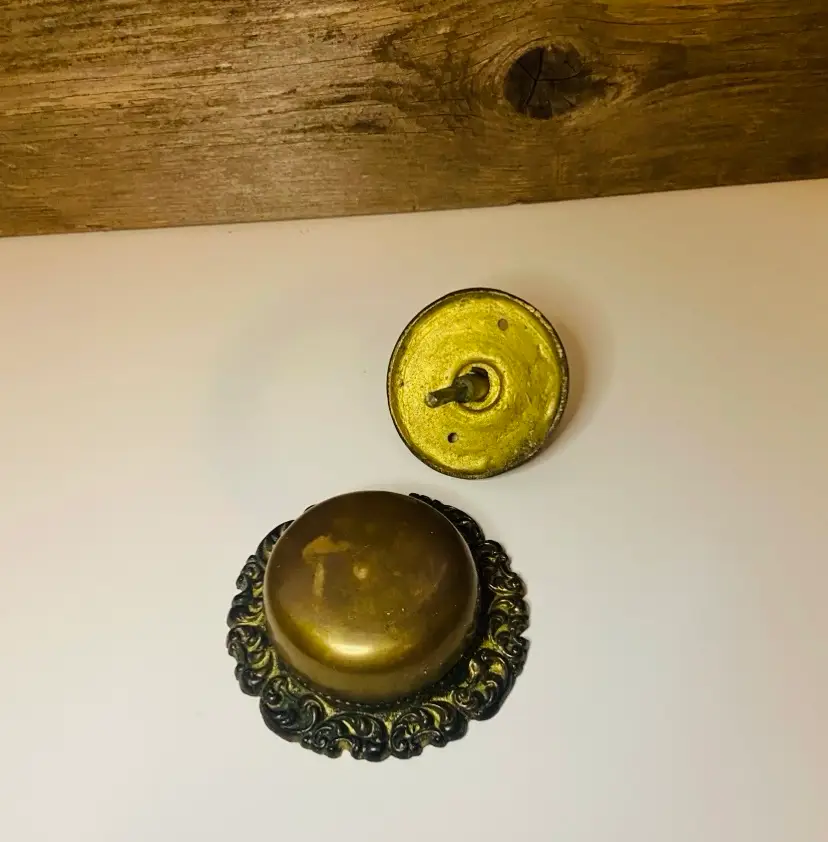 This ornate solid cast brass doorbell assembly from the Victorian era works well and rings. The knob shank attaches easily into the bell assembly and turns smoothly. This bell assembly will fit a door that is 1 ¾" thick which is pretty much a standard size. Great original patina too! In good used condition.