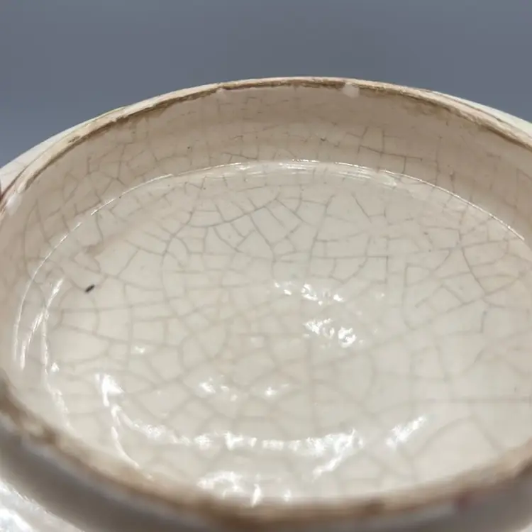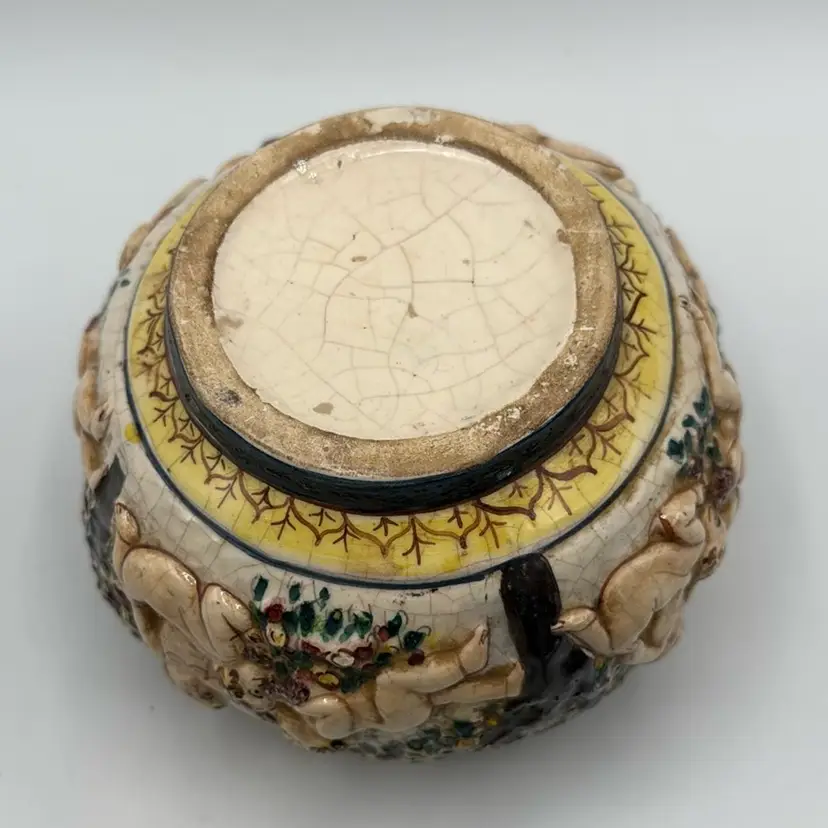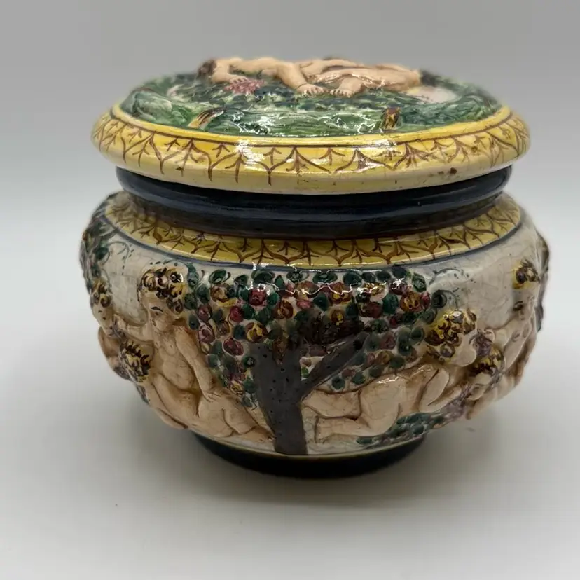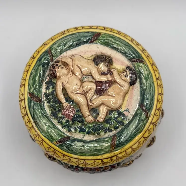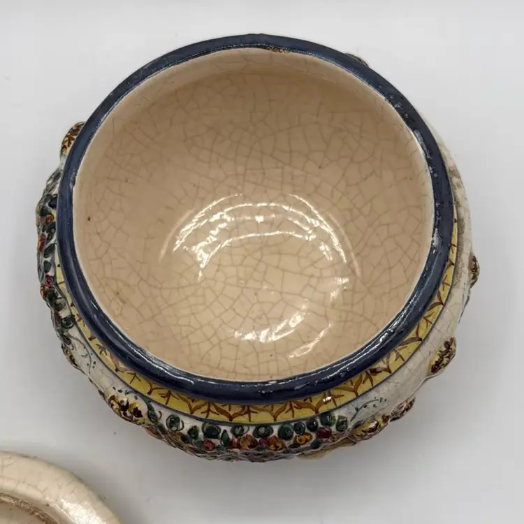 This piece has a lovely aged look, possibly antique. No markings to signify maker or age, although it does resemble Italian Capodimonte pieces. Amazingly there are no major chips or cracks. Minor chipping on inside of lid and glaze bubbles on edge, visible crazing expected with age.