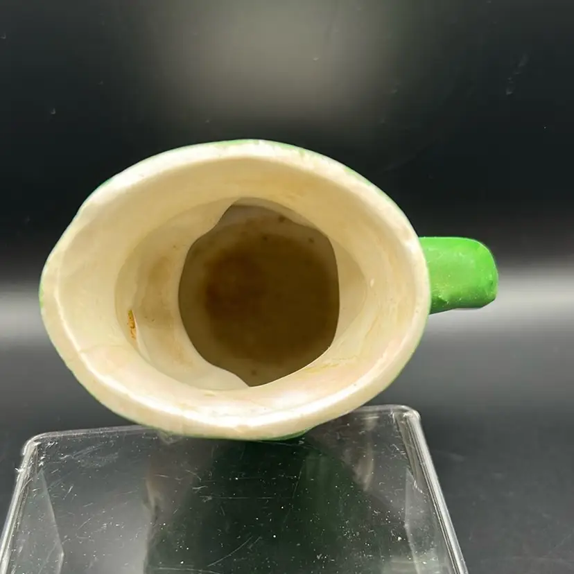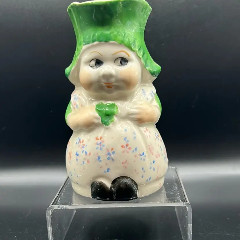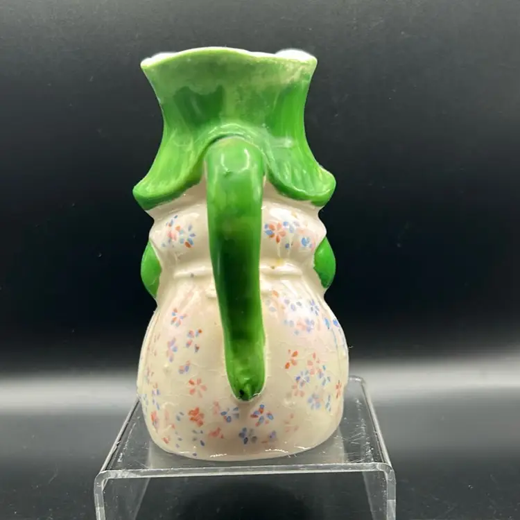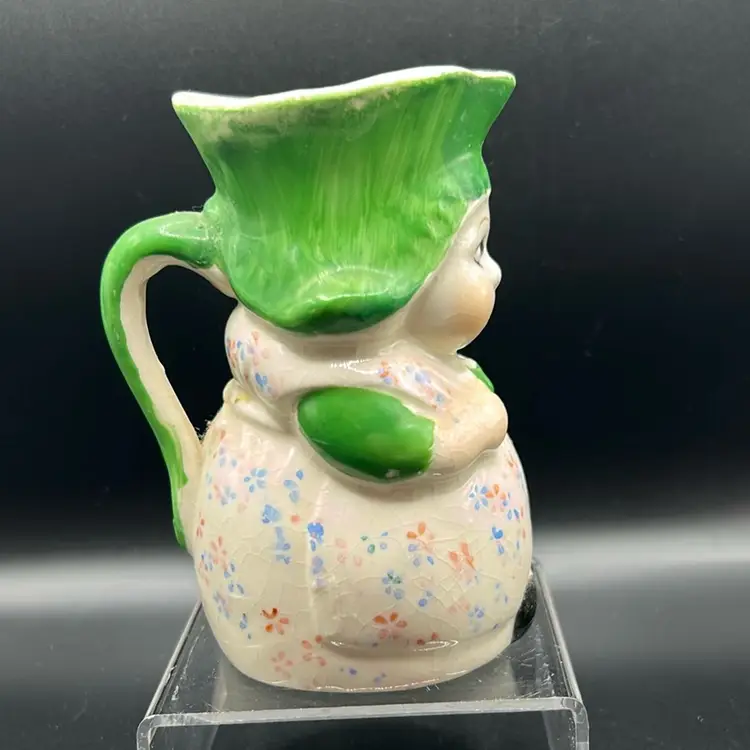 This piece is a Toby style ceramic pitcher with a lady character. She is hand-painted there are no chips or cracks, however, crazy is present. She stands 4 1/2 inches tall and about 2 1/2 inches across.