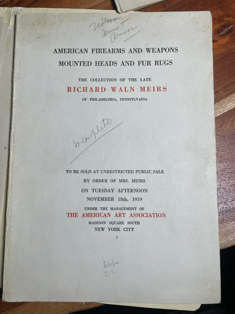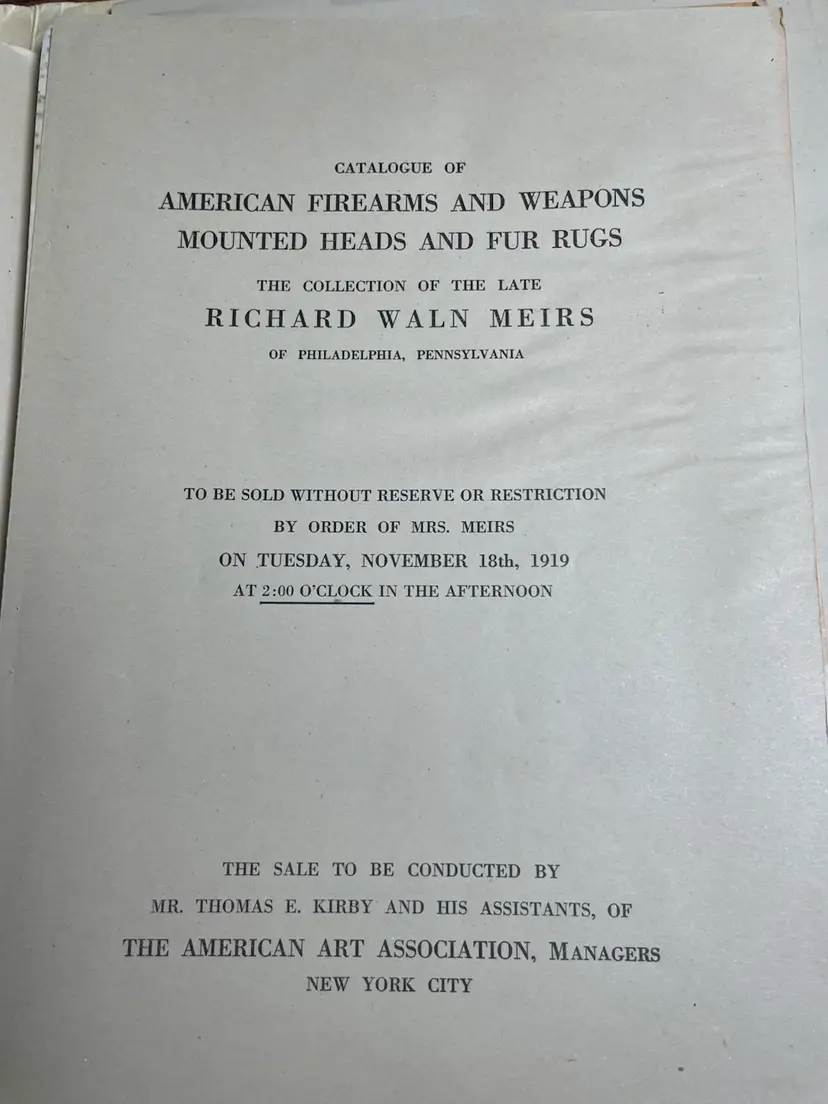 The images shows two auction catalogs from the American Art Association, both dating from 1919. The top catalog is for the collection of Richard Waln Meirs, featuring American firearms, weapons, mounted heads, and fur rugs. The bottom catalog is for the collection of Major-General James Franklin Bell, including arms, weapons, Indian and Philippine baskets, blankets, and curios. Catalog 1: Richard Waln Meirs Collection Items: American firearms, weapons, mounted heads, and fur rugs Date: November 18, 1919 Location: American Art Galleries, New York City Catalog 2: The General Bell Collection (James Franklin Bell) Items: Arms and weapons, Indian and Philippine baskets, blankets, and curios Date: February 14, 1919 Location: American Art Association, New York City