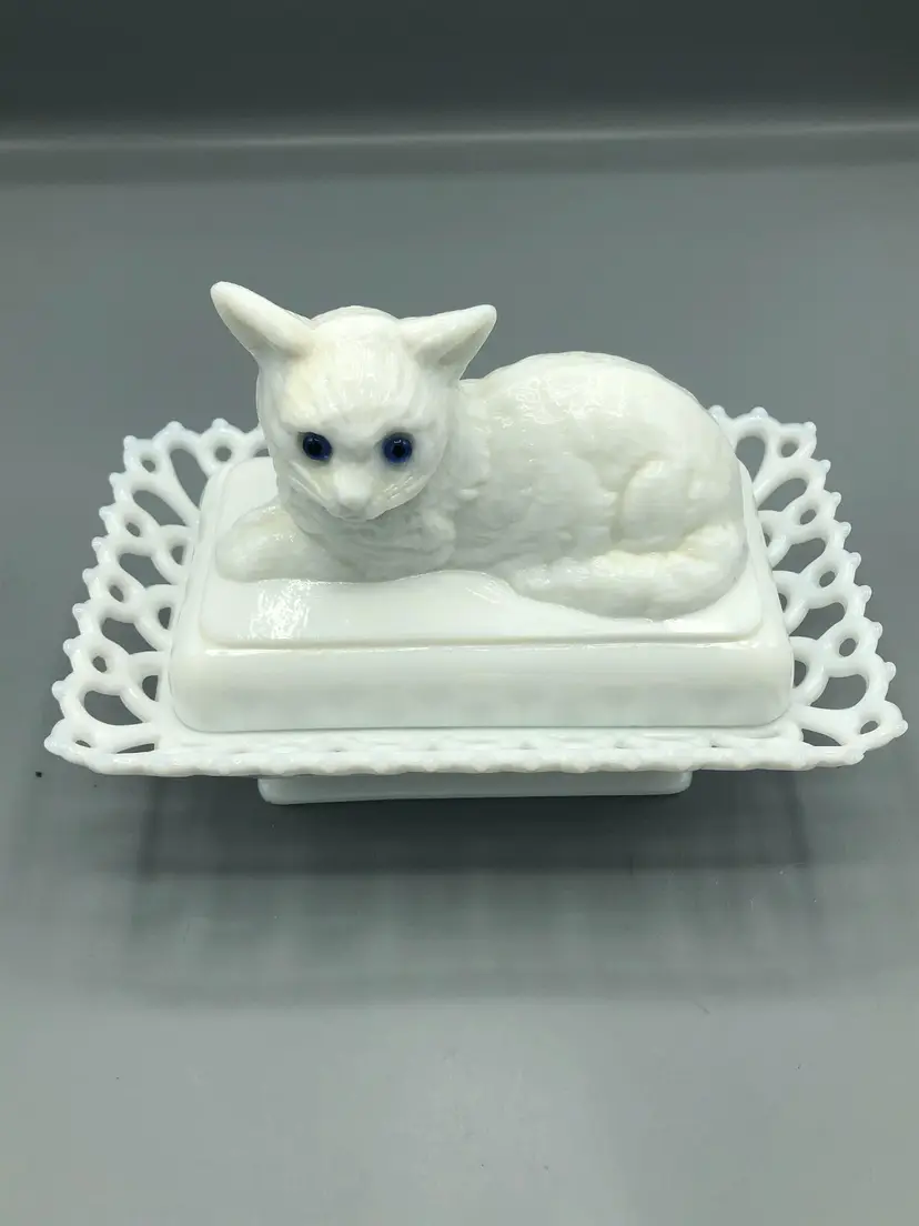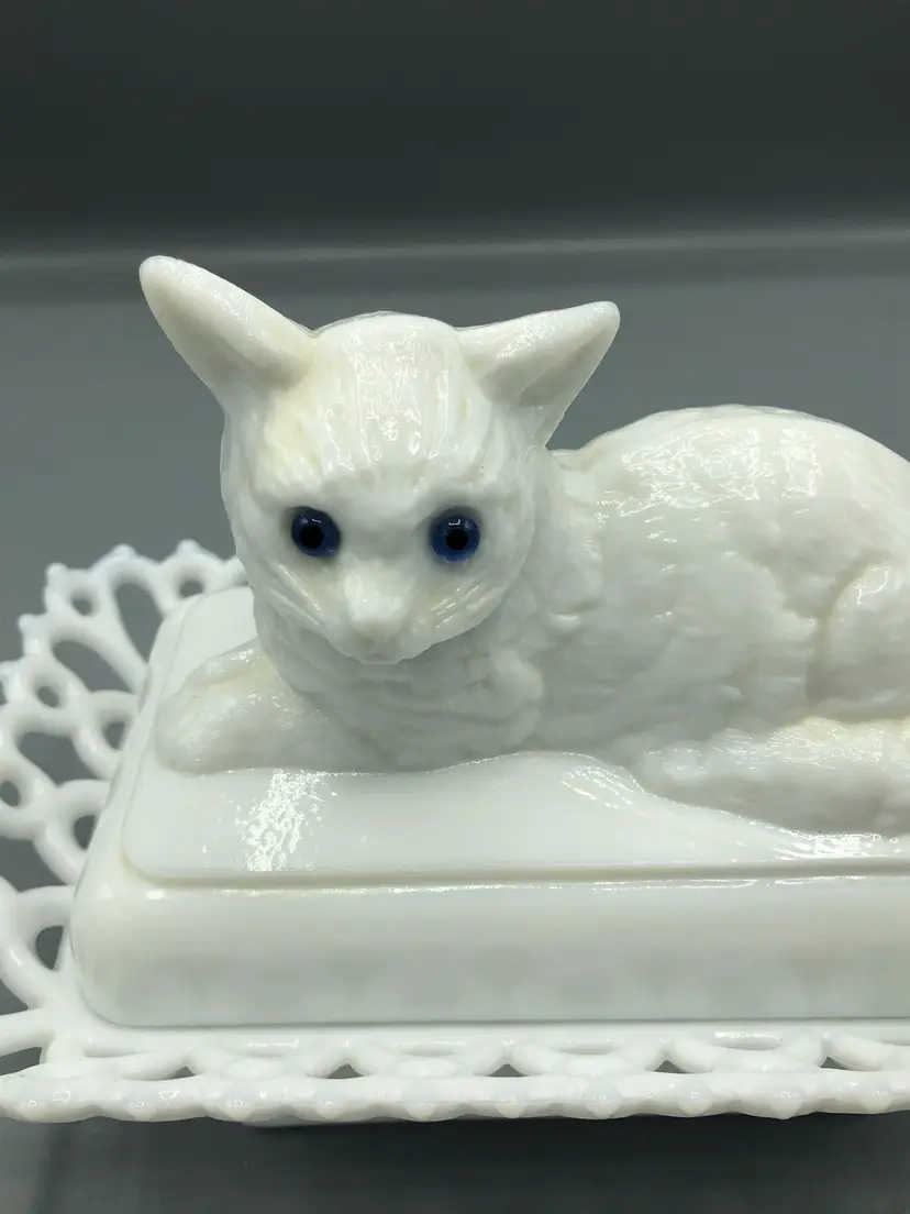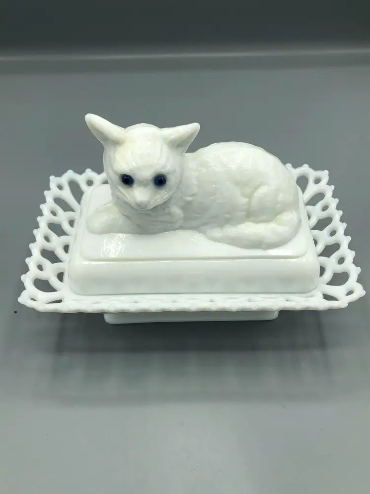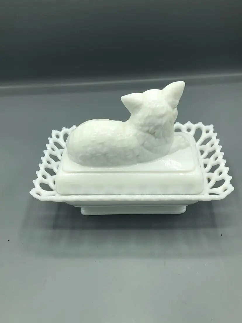 Antique Westmoreland milk glass cat in a basket dish that would make a conversation starter. for any gathering. This has no cracks or chips.