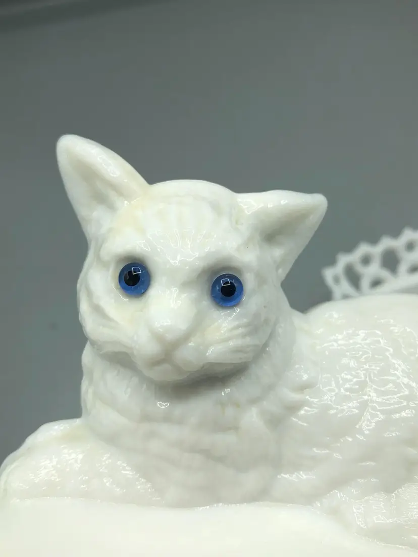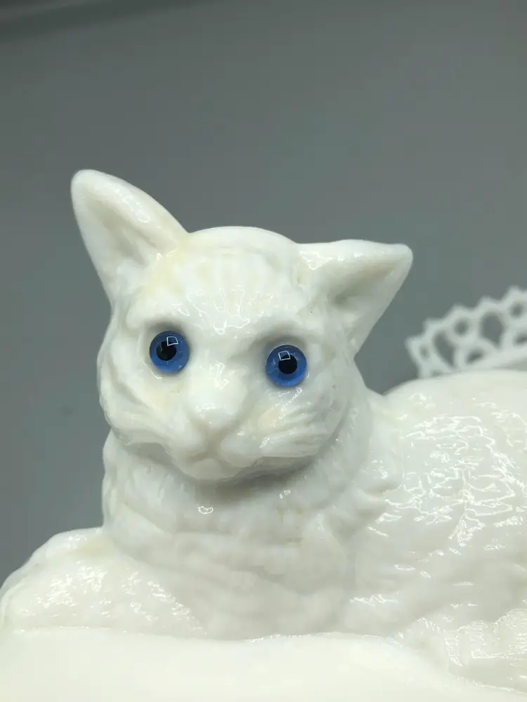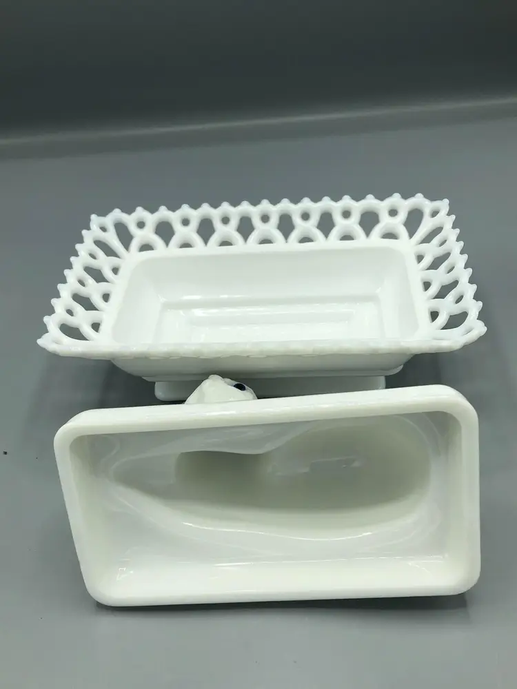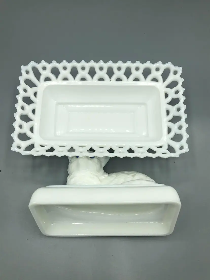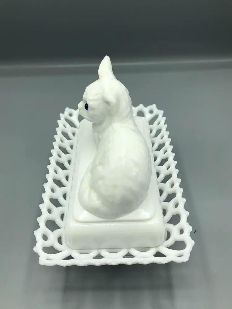 Antique Westmoreland milk glass cat in a basket dish that would make a conversation starter. for any gathering. This has no cracks or chips.