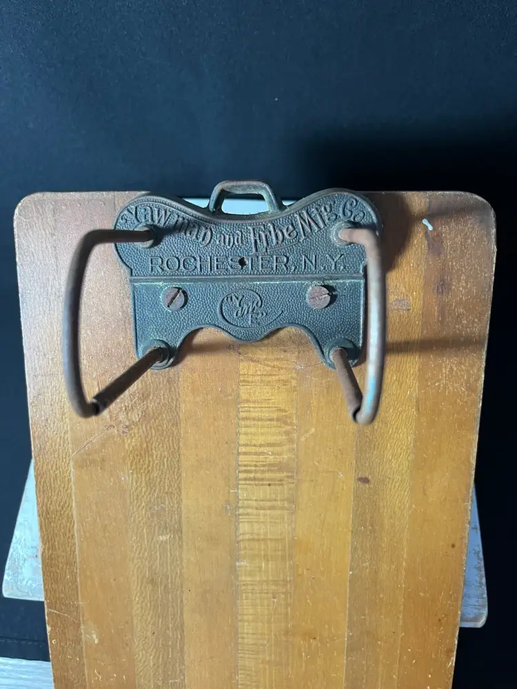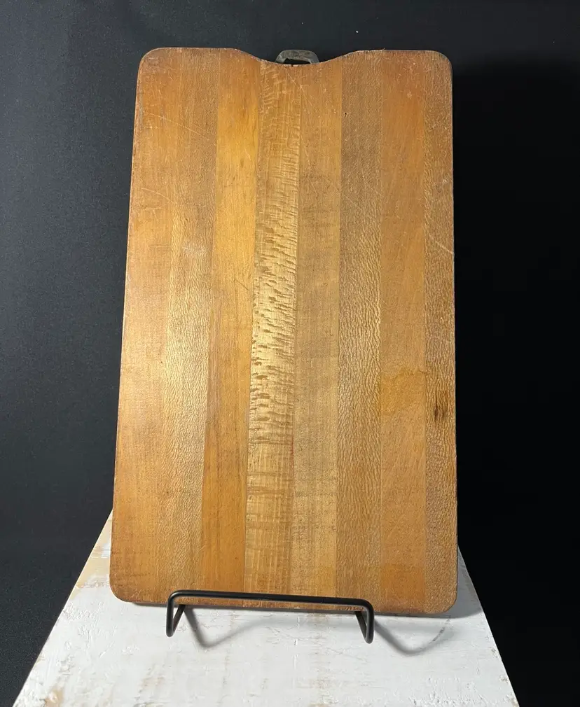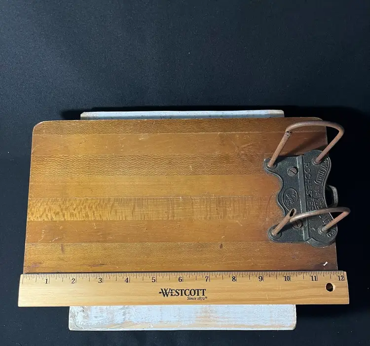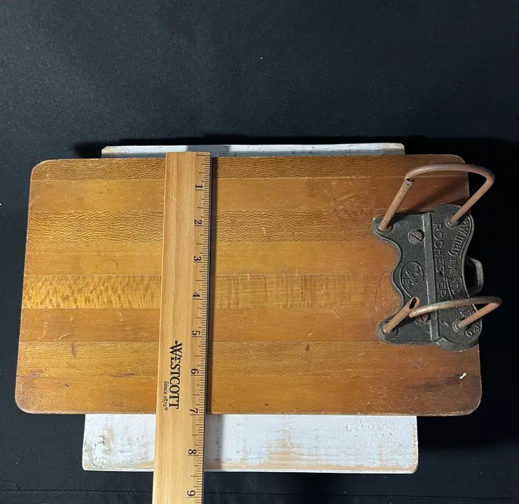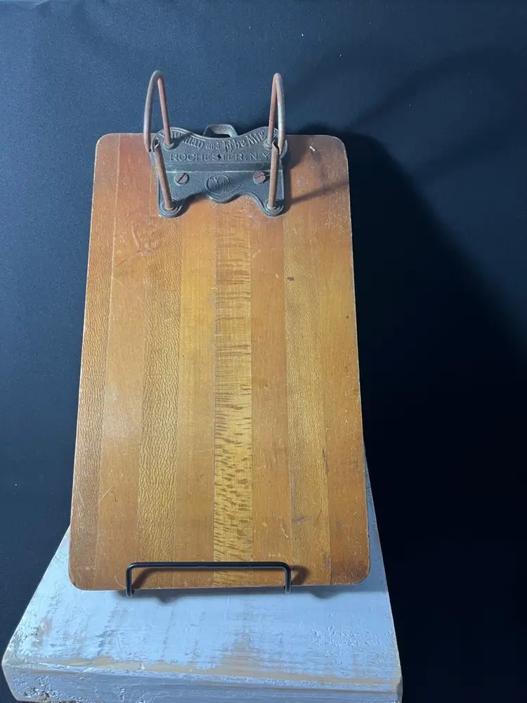 #980 Antique Wood Butcher Block Style Yawman & Erbe Mfg Co Rochester NY Clip Board with metal hardware. Measures 12” x 7”.
