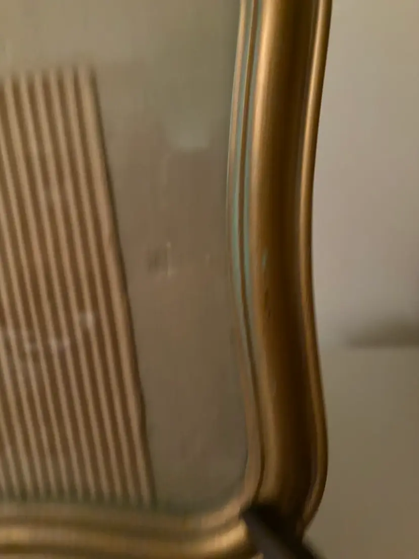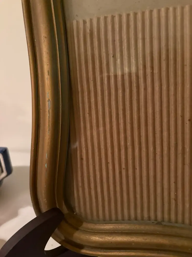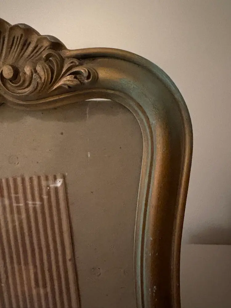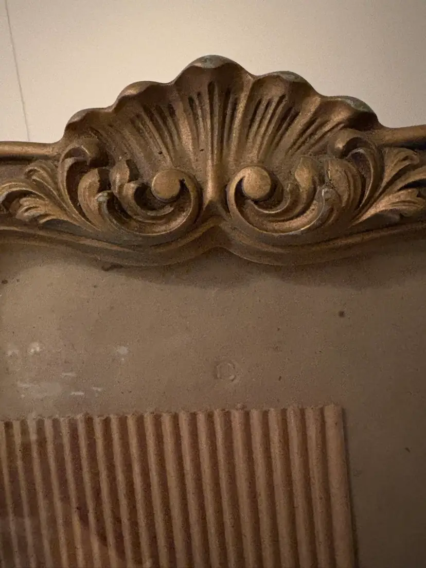 This is a very beautiful antique piece with lovely curves. The back has lost the support for standing but that could easily be replaced. It still has the ability to be hung on a wall. It measures 12 1/2” X 10”.
