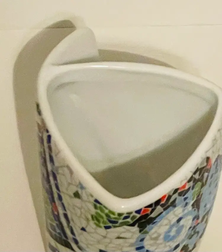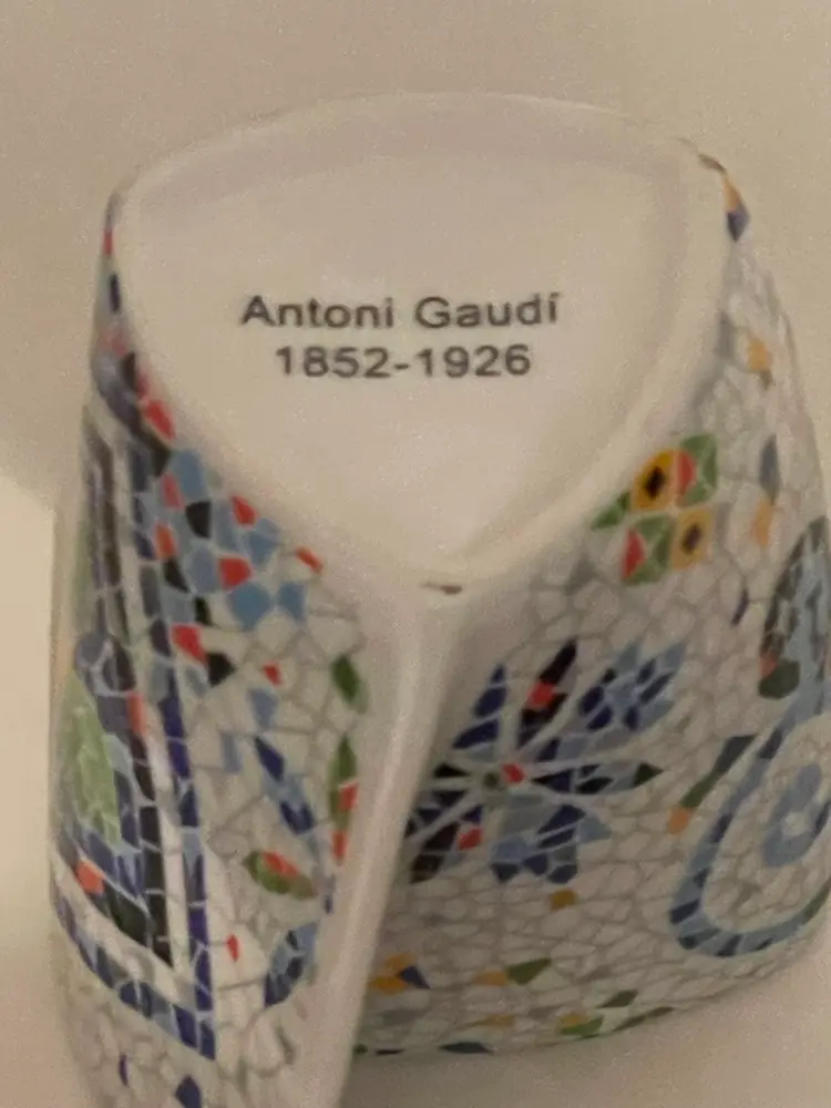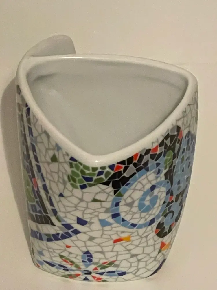 Antoni Gaudi Coffee Mug - Tea Mug. Unique triangle shape with beautiful vibrant mosaic designs. Preowned - in excellent condition with no chips or cracks. Holds 8 oz. of your favorite coffee or tea.
