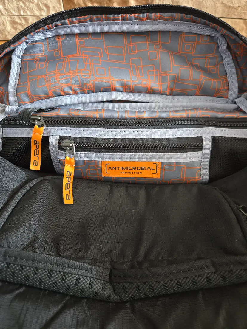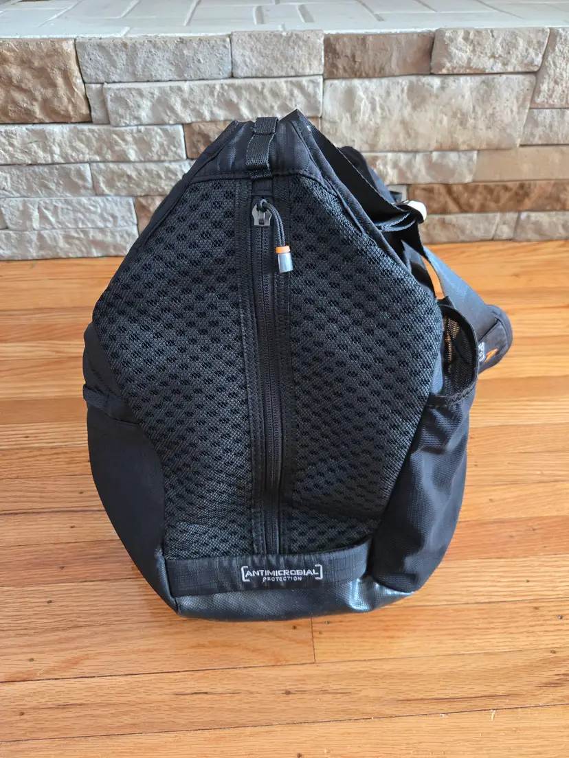 This is a gym bag that's a few years old but still in good condition. Black with orange trim and an orange patten on the interior.