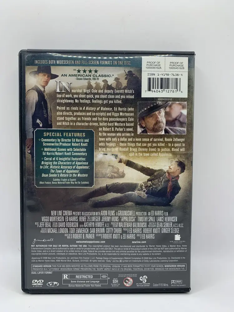 Actor Ed Harris takes only his second stab at directing following the Oscar-winning feature POLLOCK (2000) with this spirited western. Harris draws on a strong cast many of whom have acted with him in previous films to tell the story of two gunfighters attempting to bring peace to the small town of Appaloosa in the late 1800s. Virgil Cole (Harris) and Everett Hitch (Viggo Mortensen) ride into the windswept New Mexico town and are hired to bring vigilante entrepreneur Randall Bragg (Jeremy Irons) to justice. Director: Ed Harris Star: Ed Harris Viggo Mortensen Renie Zellweger Jeremy Irons Special Features: Full Frame - 1.33 Audio: (unspecified) English Audio Commentary - 1. Director Ed Harris 2. Producer Robert Knott Featurette - 1. Bringing the Characters of Appaloosa to Life; 2. Historic Accuracy of Appaloosa; 3. The Town of Appaloosa; 4. Dean Semlers Return to the Western.Size: Unisex OS