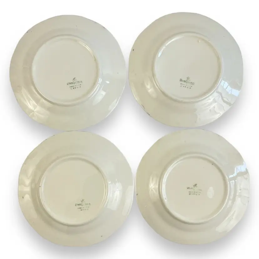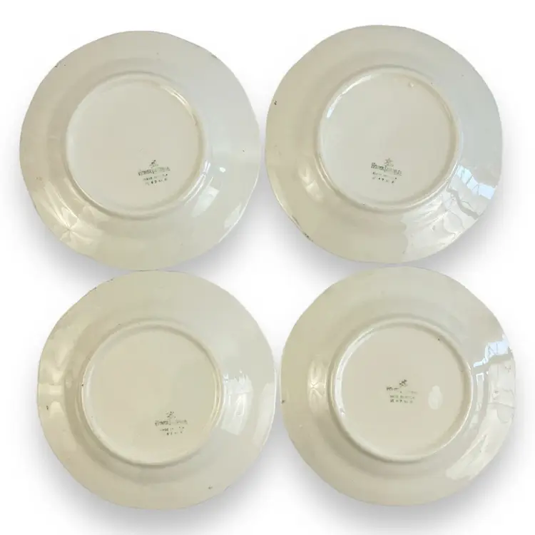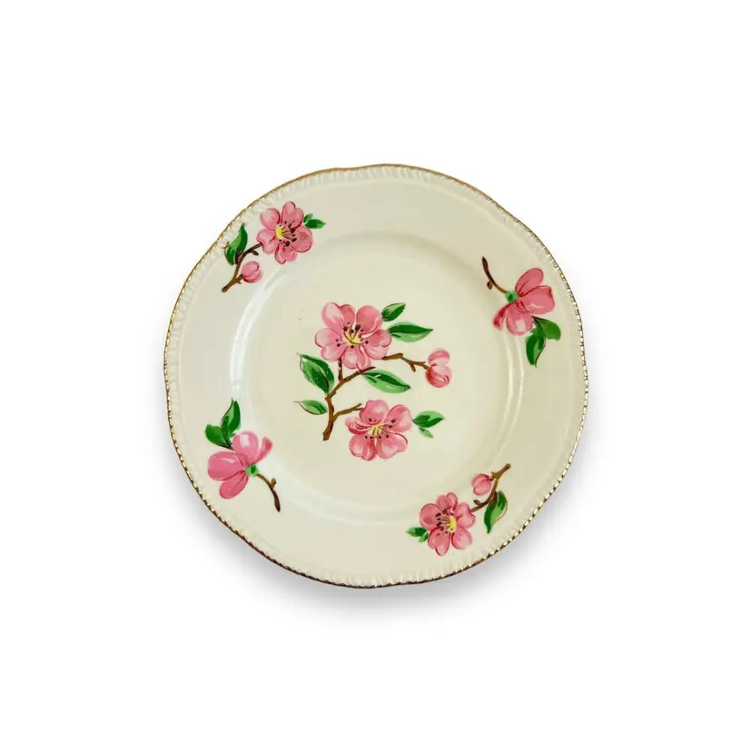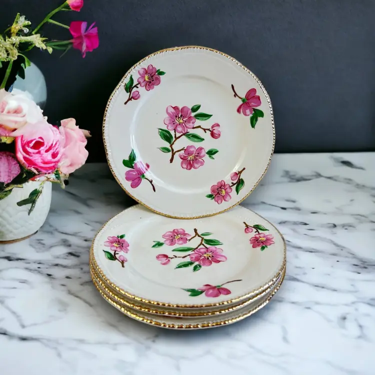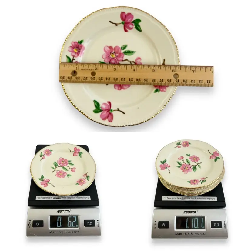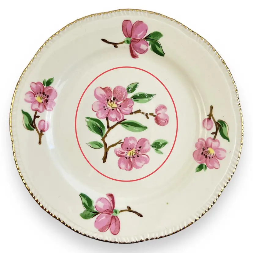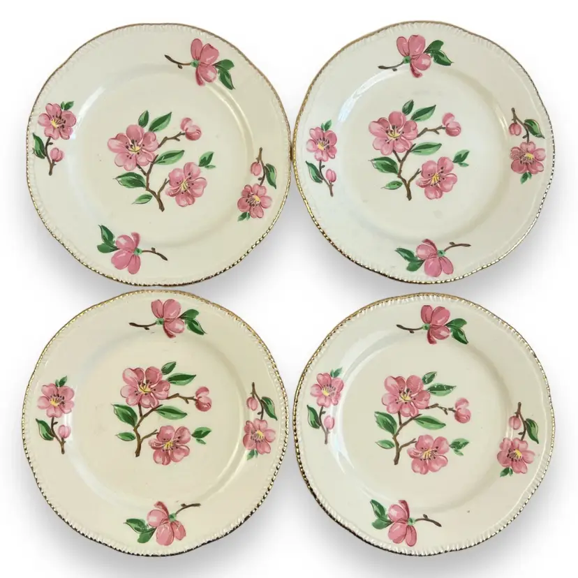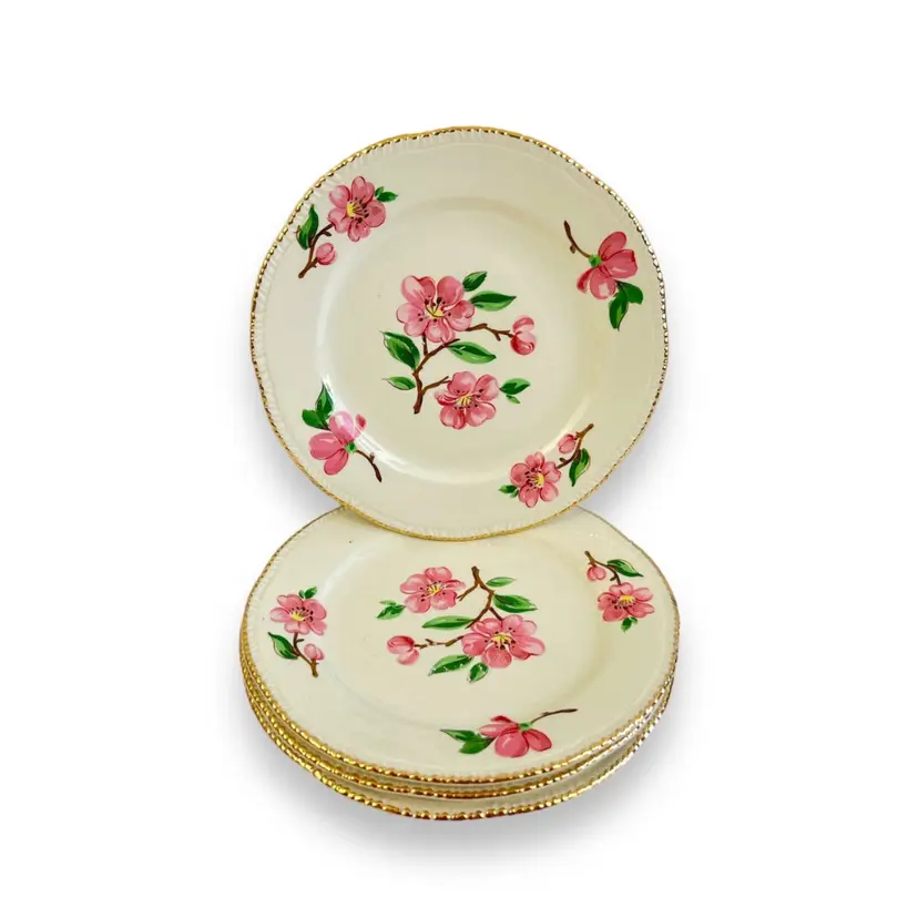Apple Blossom (Liberty) by Homer Laughlin Bread Plate Pink Flowers Gold Rim Set of 4 One of the plate has some minor paint scratches as shown in picture #8 otherwise the is a good vintage condition with no chips cracks or repairs. The pictures represent the item well and should be consulted for additional condition and design details as they are considered to be part of the item's description. All shipments are carefully and professionally packed to arrive in the best possible condition.