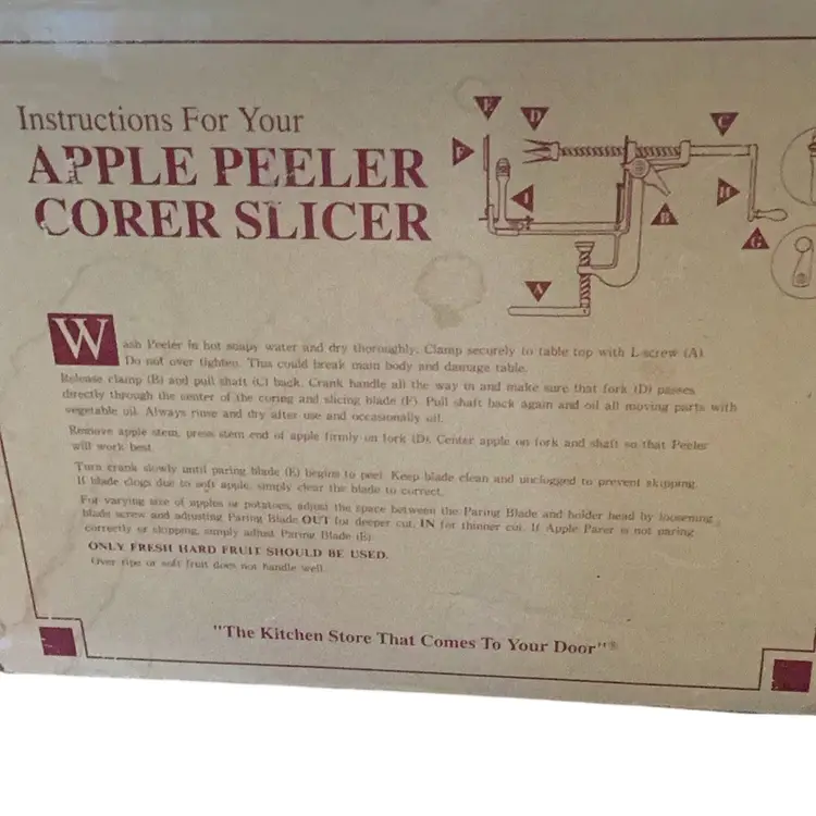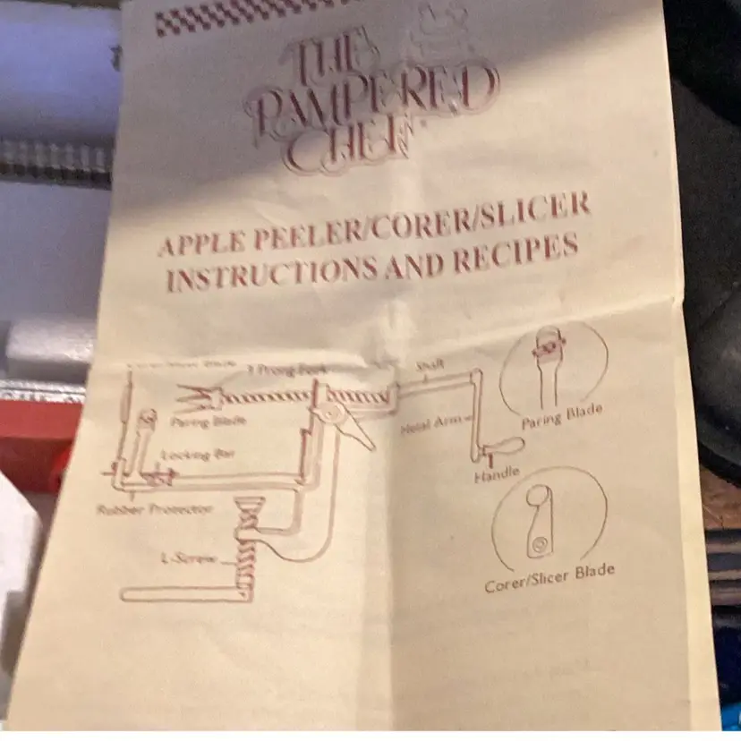 Pampered chef apple peeler core slicer comes with instructions has a couple of recipes. I think there’s a screwdriver and a wrench that’s missing out of the package. I will reimburse for over payment of shipping.