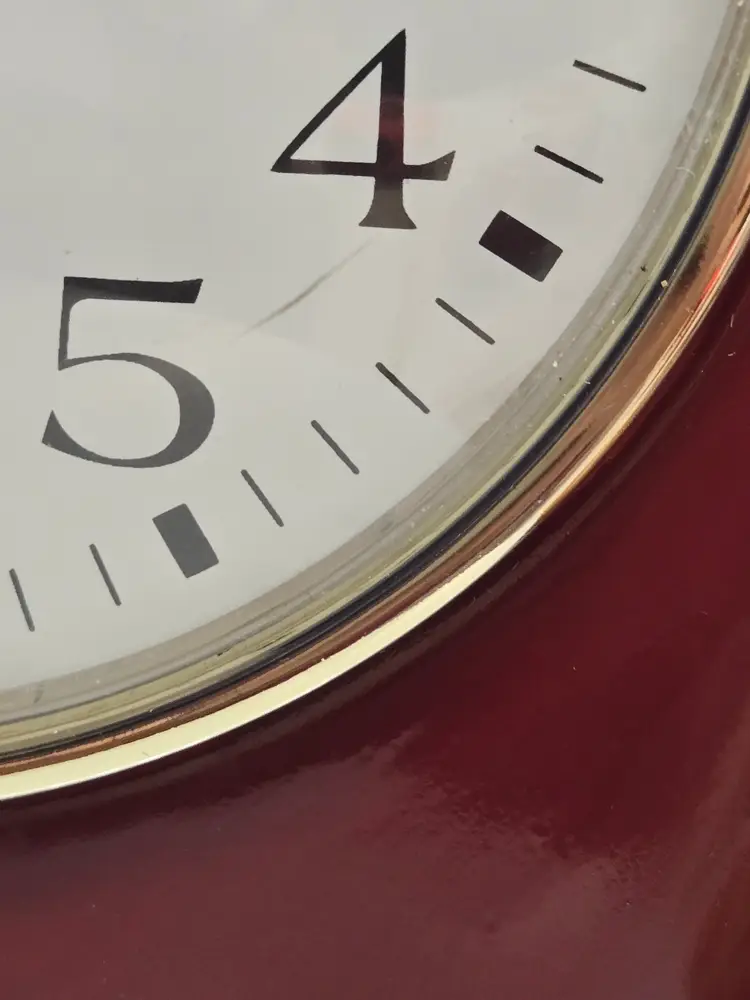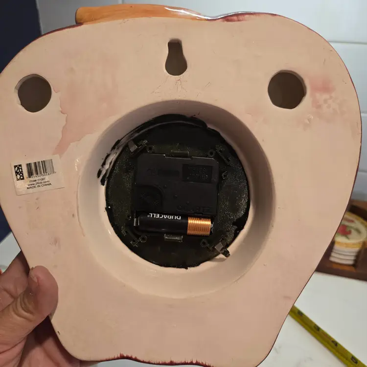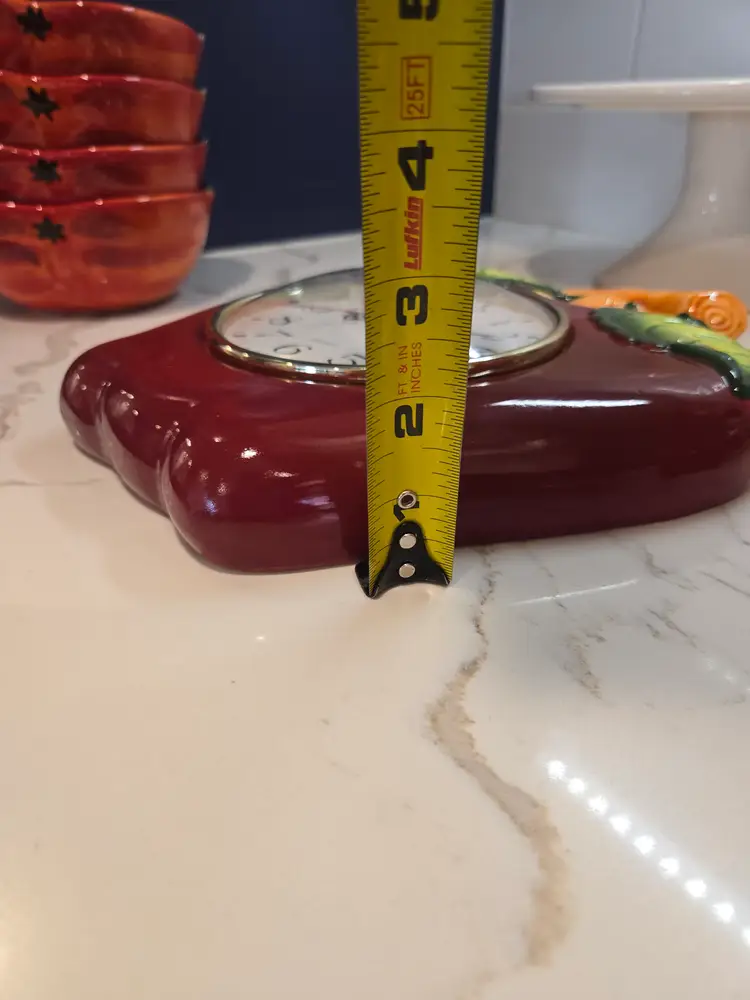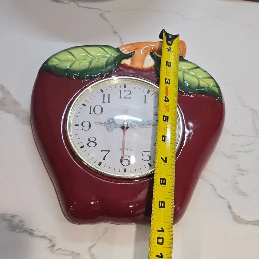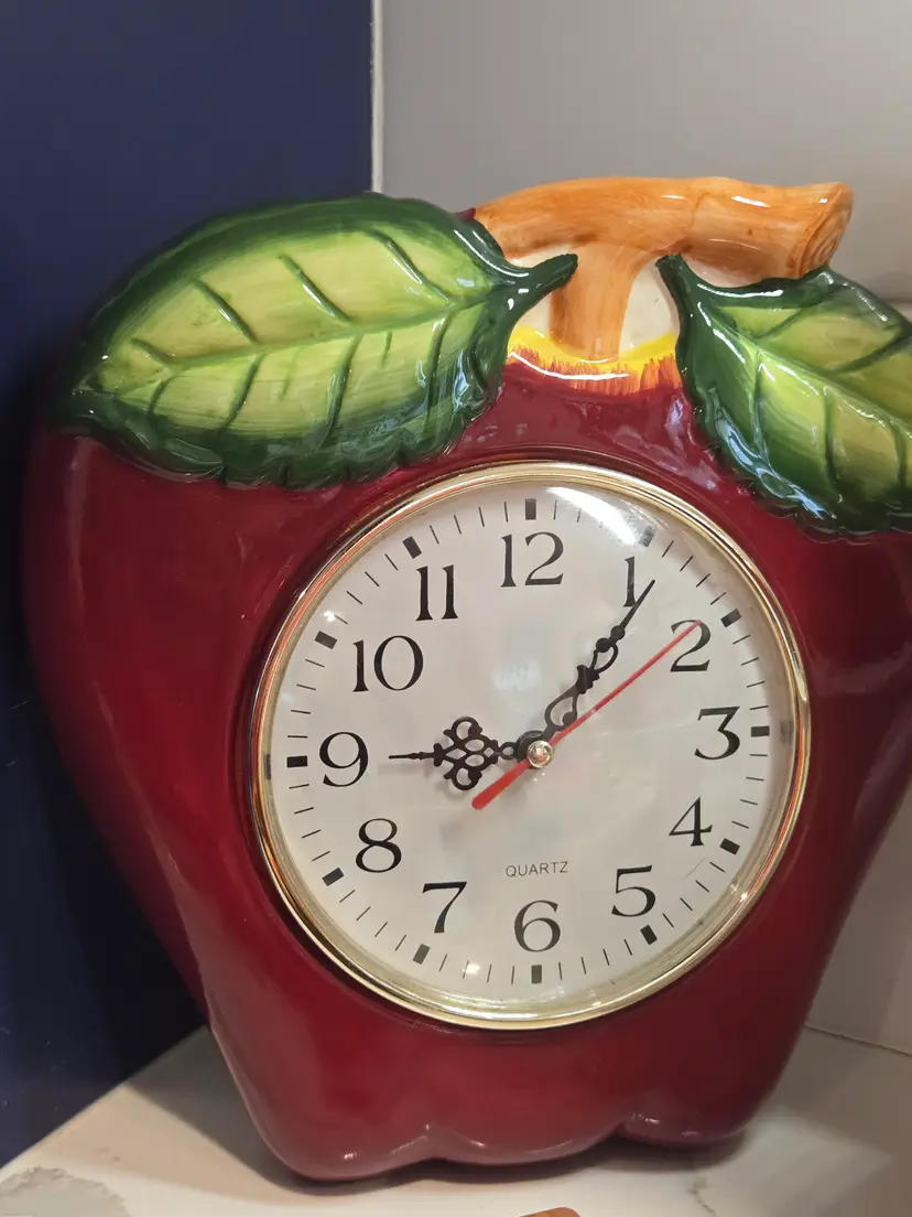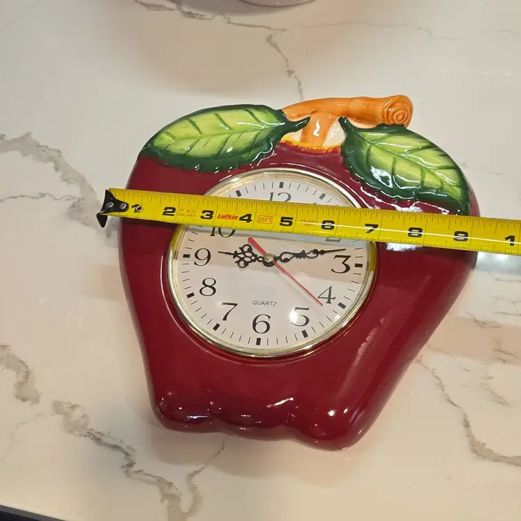 Such a happy apple red. The quiet, steady tic, tic, tic of this clock takes me back! This 3 dimentional clock is ceramic, a Quartz movement that works, takes a AA battery (new, included), and has a convex lens.