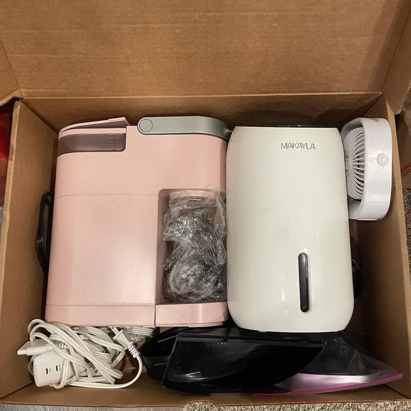 selling as untested as is. There’s a full Keurig unit, a number of OEM parts from the Keurig K50. A Remington razer shaver, an oem cord to mainstays electric heating robe blanket, a makayla dehumidifier, and a small fan.