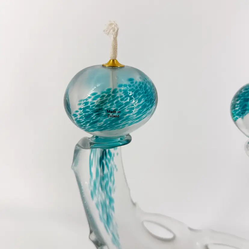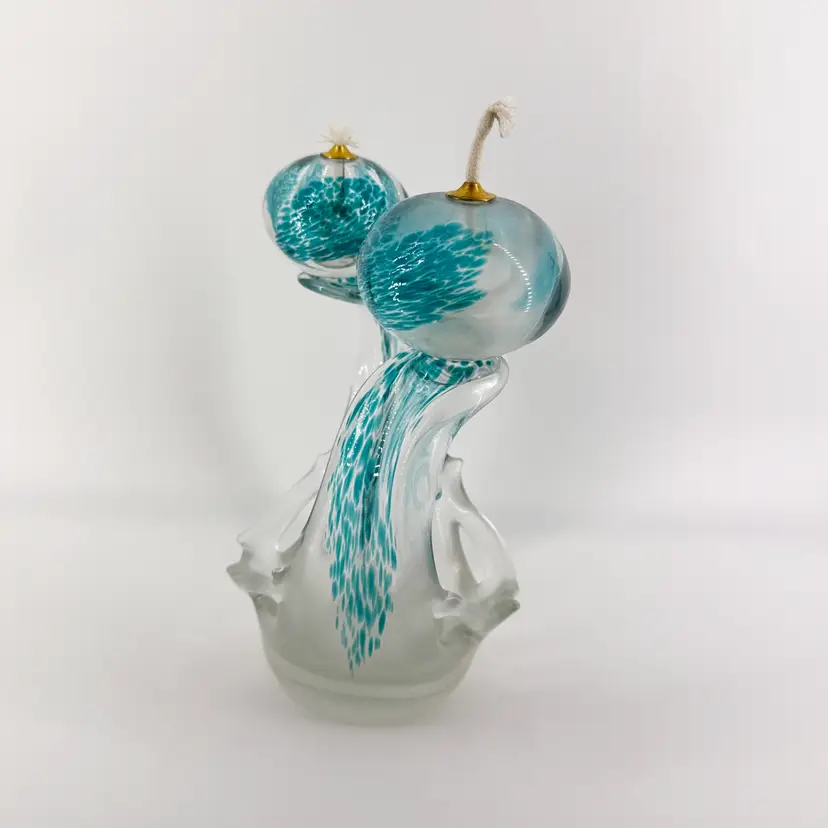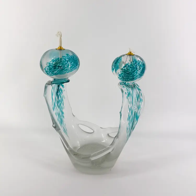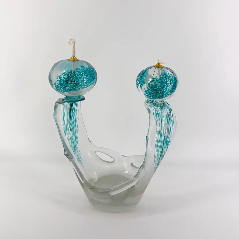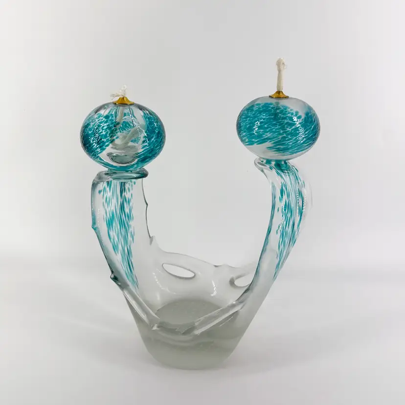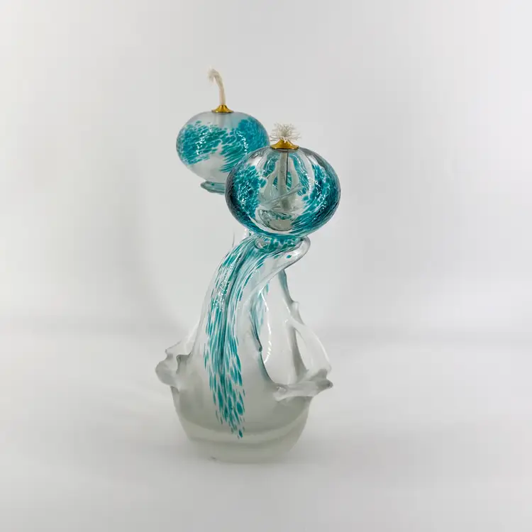 It is 10" tall and measures 8.5"5.5". It is in excellent condition. There are no cracks, breaks, chips or repairs. The glass is clear on one side and morphs into a frosted appearance on the other side. Therefore the oil holders look different.... One clear and one frosted.