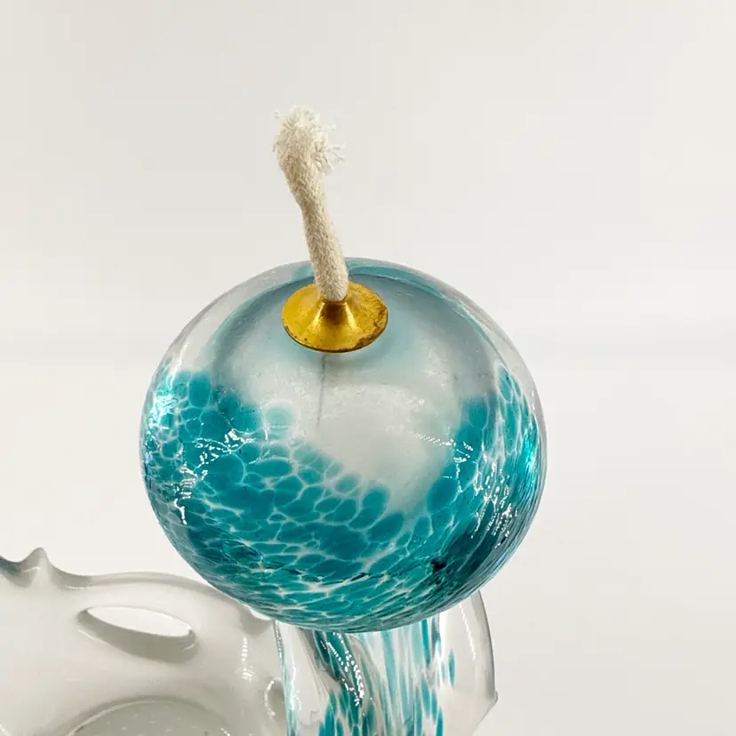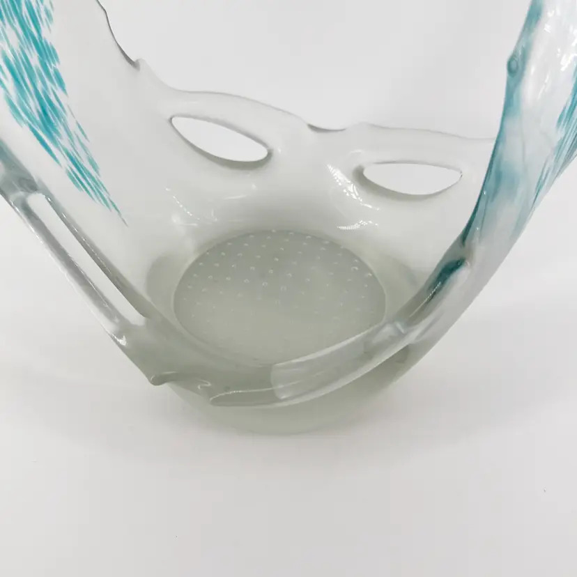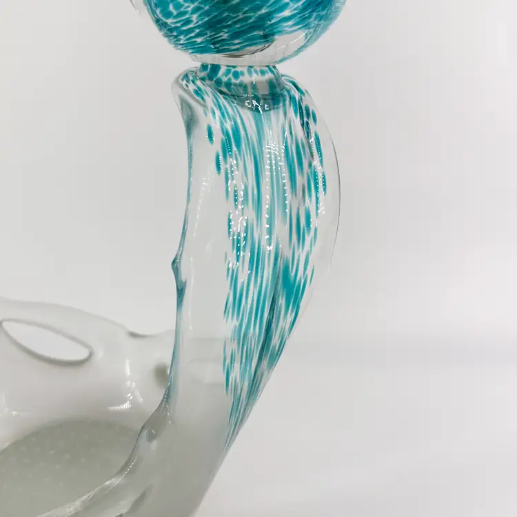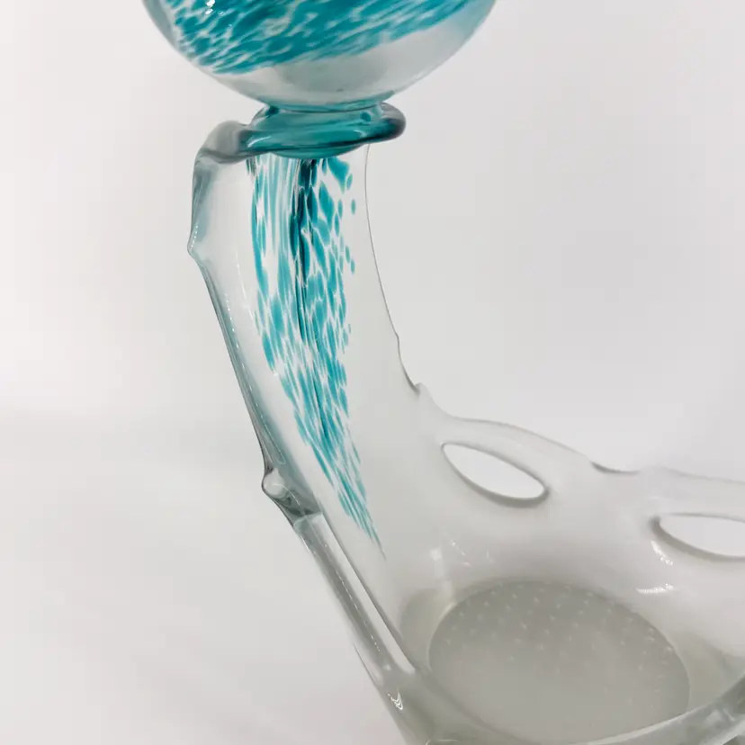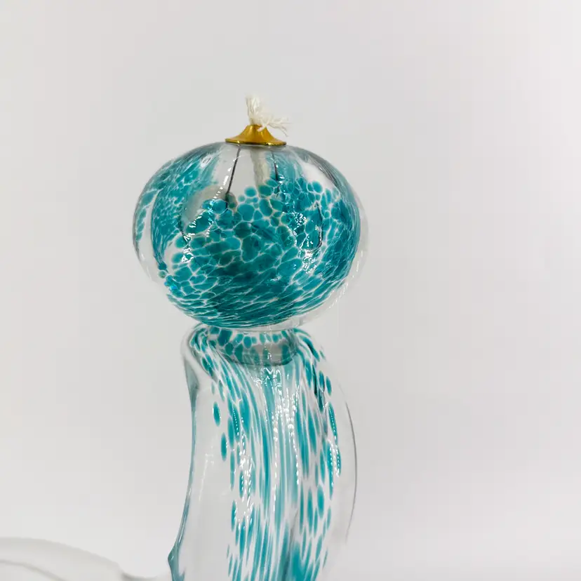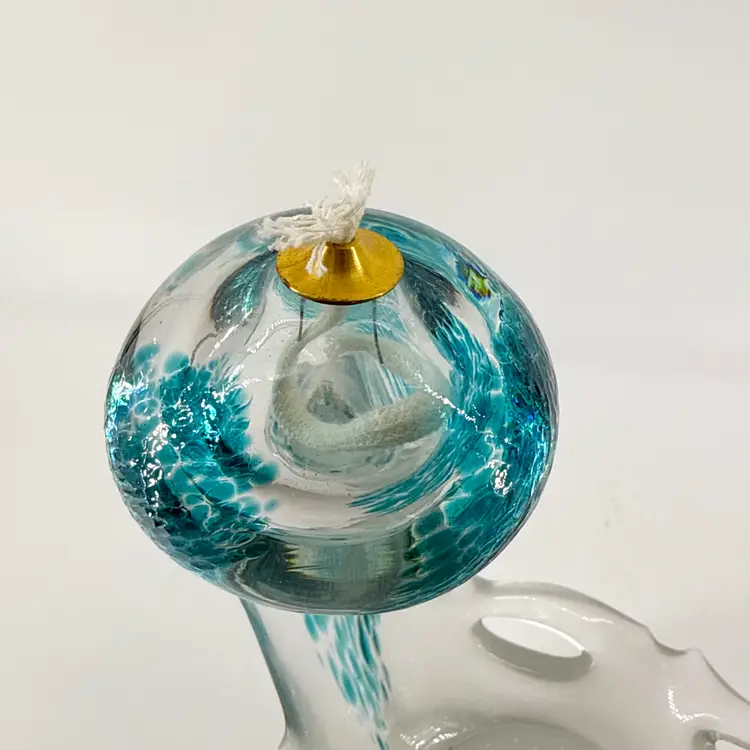 It is 10" tall and measures 8.5"5.5". It is in excellent condition. There are no cracks, breaks, chips or repairs. The glass is clear on one side and morphs into a frosted appearance on the other side. Therefore the oil holders look different.... One clear and one frosted.