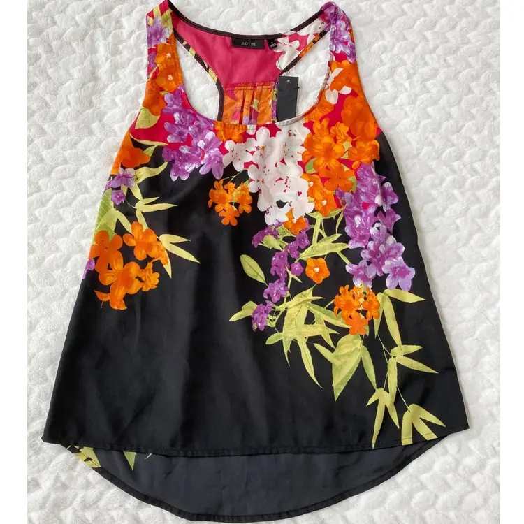 BNWT Apt 9 Floral Racerback Tank Woven tank with back pleats, hi - low top (back is longer than front Bright pink background shifts to black with orange, white purple and green vibrant tropical flowers, lightweight, great for Spring, Summer, beach vacation, tropical getaway