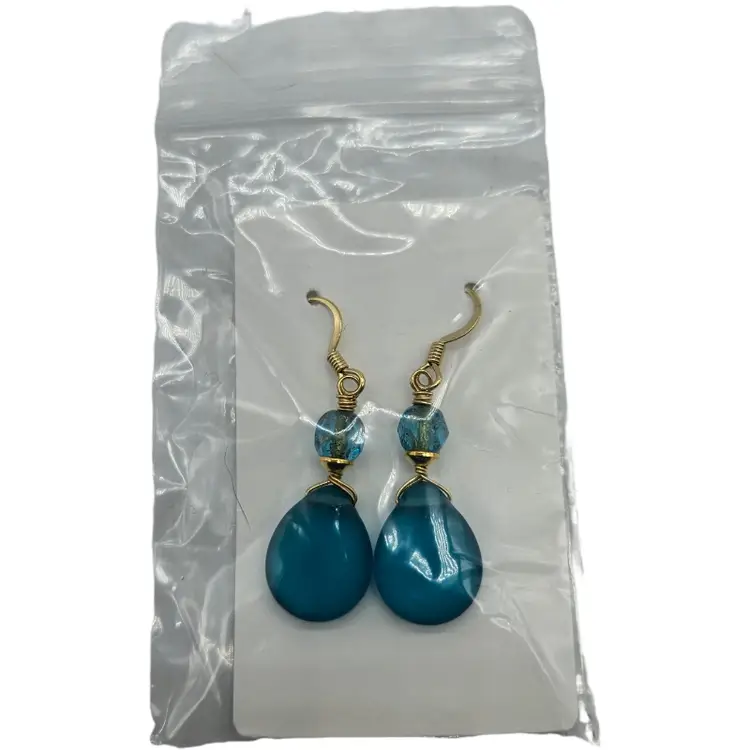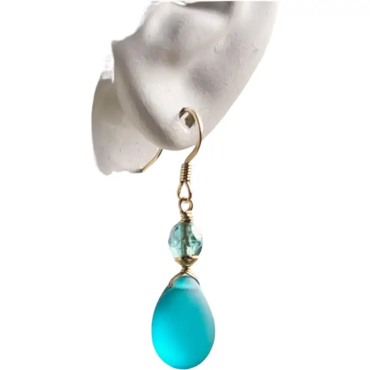 These exquisite earrings feature smooth, translucent glass drops in a captivating blue hue, complemented by gold-toned findings. The teardrop design adds a touch of elegance, making them perfect for any occasion.