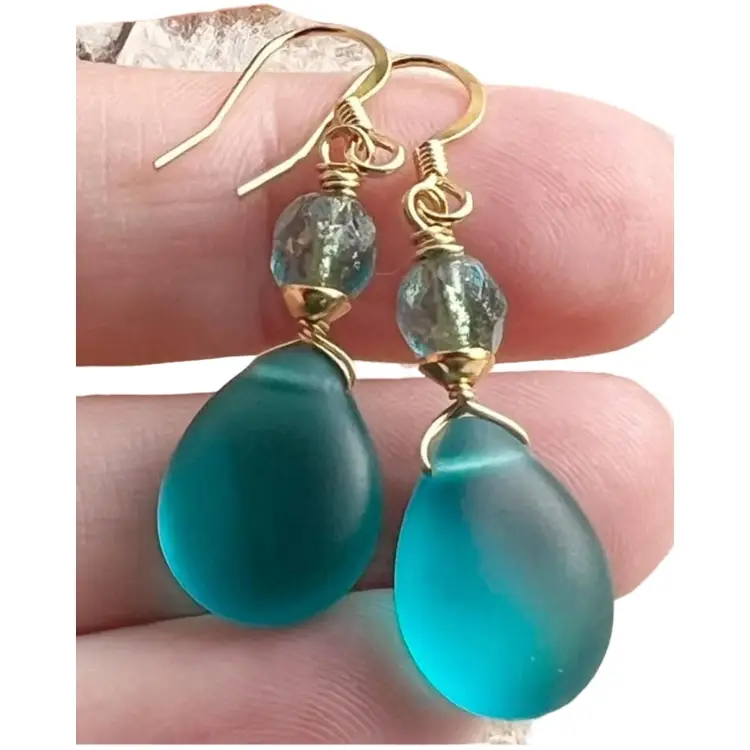 Frosted glass drops in deep aqua with gritty gold flecked nugget toppers. Gold plated hooks.