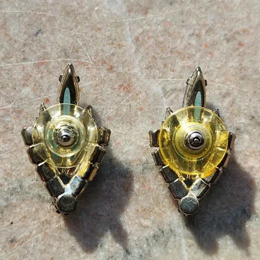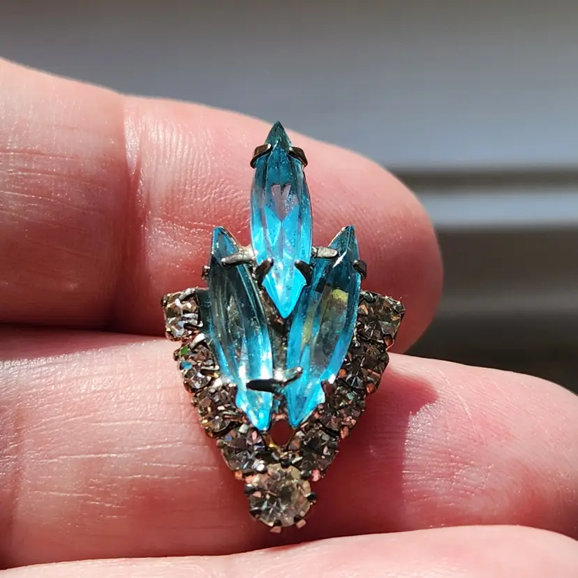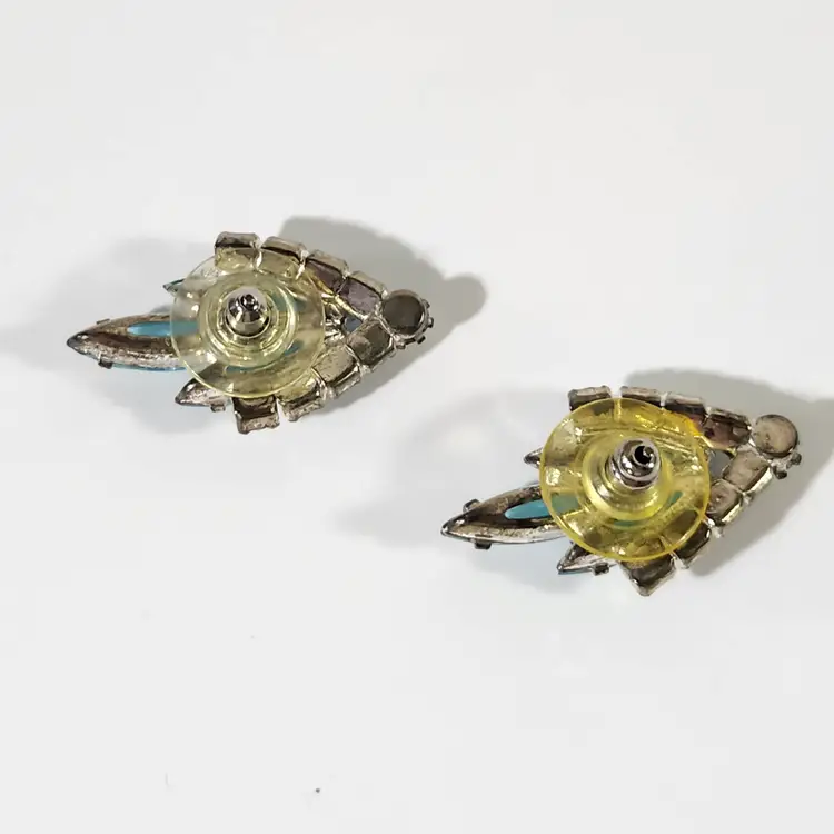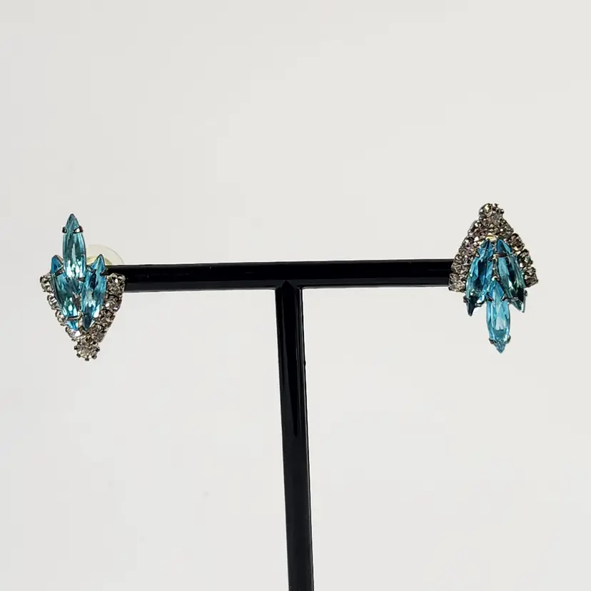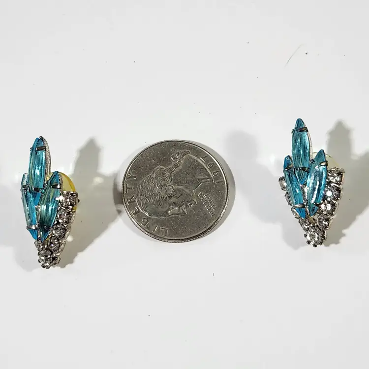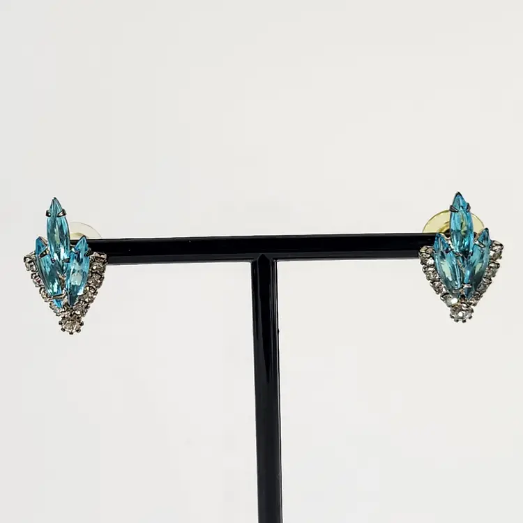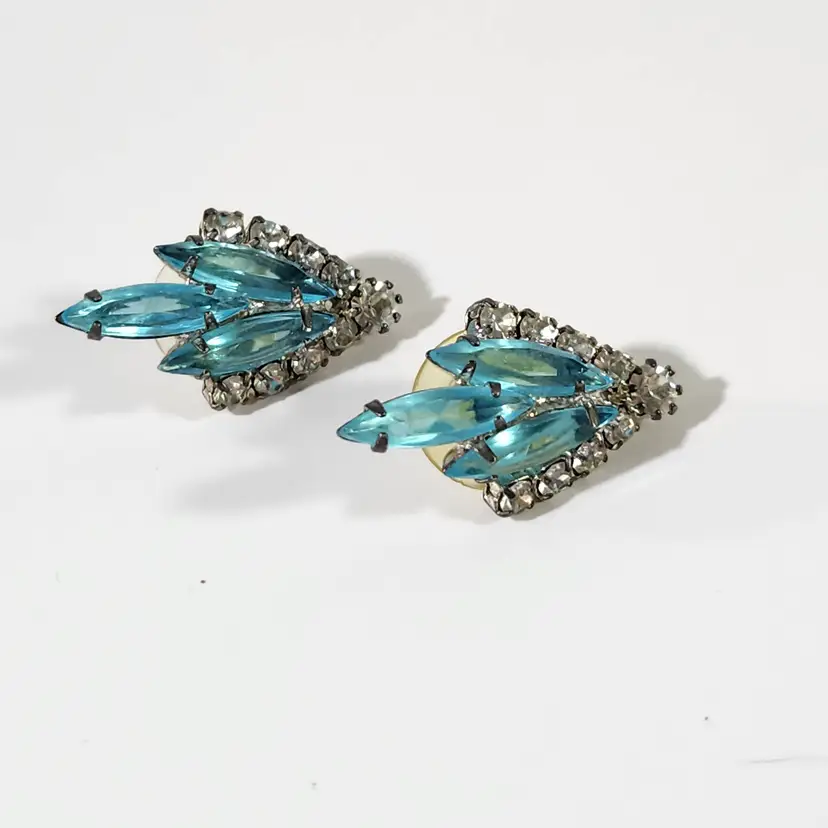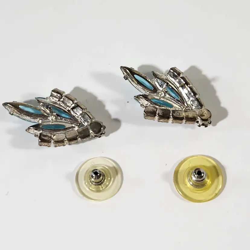 Brilliant intense aqua color in these Art Deco style crystal & rhinestone earrings. Silver tone and oh so sparkly in person, looks like a bit of old Hollywood glam. Perfect bit of bling for holiday parties, New Years & other events. The post is in the center of the earring back so these can be worn pointing up or down. Comes in a new gift box, great for storage or for gifting, box size varies.