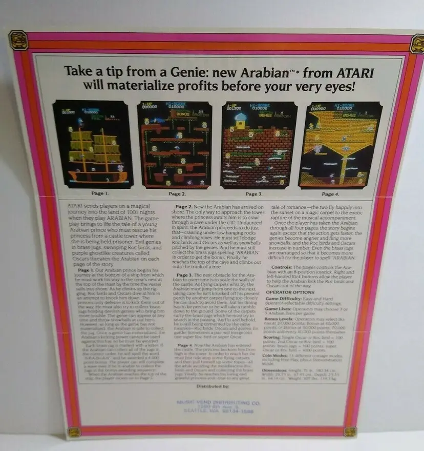 Arcade: Flyer Theme: Retro Gaming Modified Item: No Country/Region of Manufacture: United States Original/Reproduction: Original Year: 1983 Game Title: Arabian Brand: Atari
