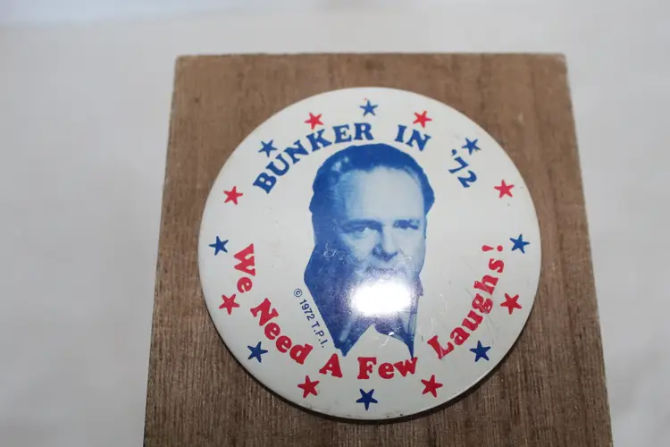 The product is a nostalgic 1972 political pin button featuring Archie Bunker as a candidate for President, with the theme of bringing more laughs to the political arena. Made in the United States, this collectible item falls under the category of Campaigns, Elections, and Politics, with a focus on pinbacks and lunchboxes. This unique piece serves as a humorous reminder of a bygone era in American political history, offering a quirky perspective on political campaigns and elections.