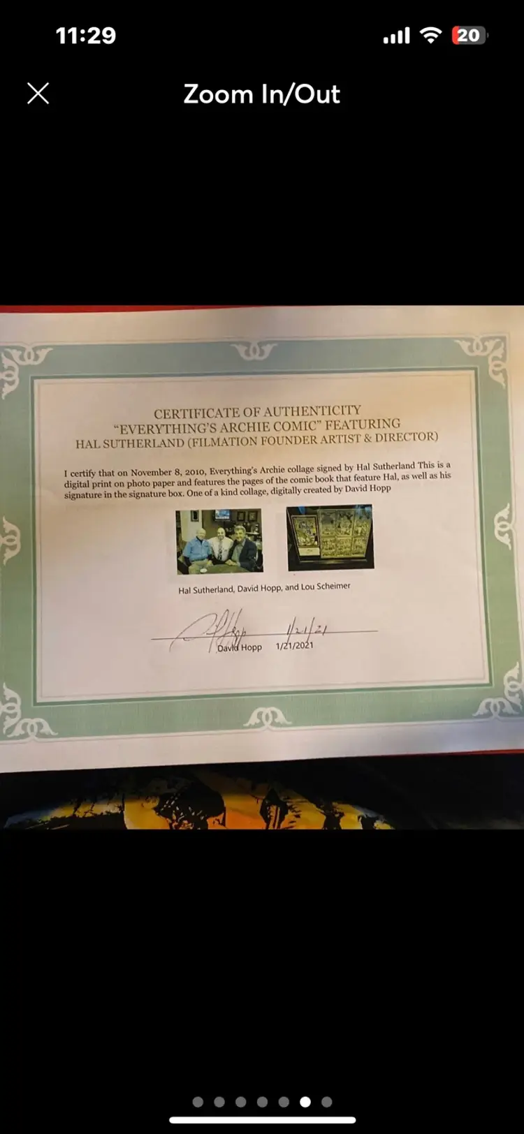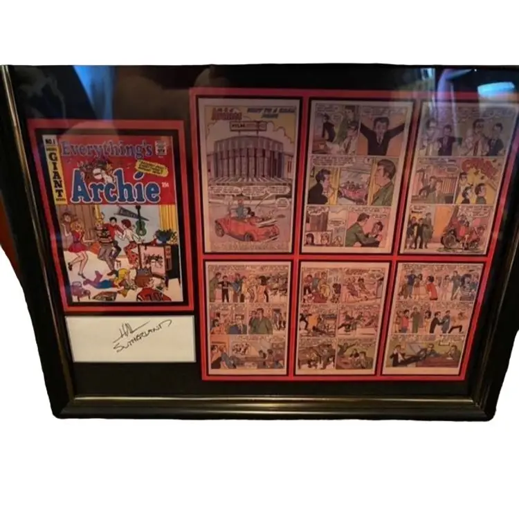 I had the privilege of working in the retirement home where Hal Sutherland lived before his passing. This is a digital print on regular paper. Collage made by me and signed by Hal This listing is for the framed autographed print. I have created a COA as this was obtained by me( in the pink shirt with the picture of a Lou Scheimer and Hal) in person at Hal’s residence. You can compare the signatures to any other out there and see these are legit. I also had them sign a now and then picture. (Those other pics in the listing are just to show you that I’m legit.) happy to answer any questions. Item is framed In a black frame. You will only receive the framed archie print and coa, other photos and business cards not included.
