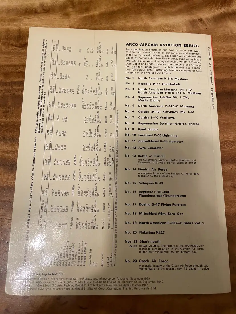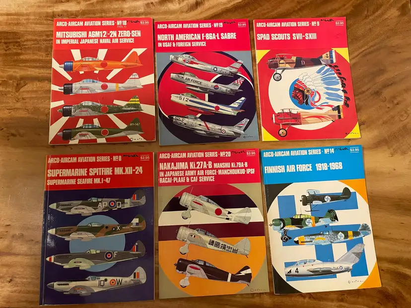 Arco Aircam Aviation Series Ospey No. 8 9 14 18 - 20 Book Lot of 6 1970's. Light general wear, has a persons name written on top of front cover on each and some on the last page some writing. Vol 8 has some wear on back bottom and some tape on the back.