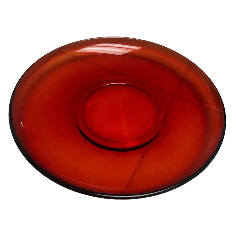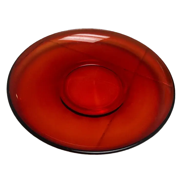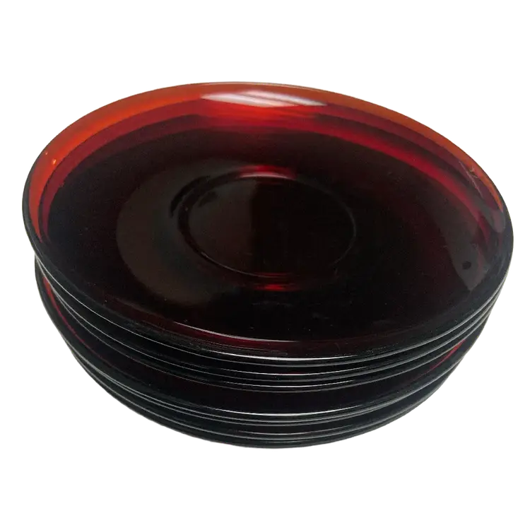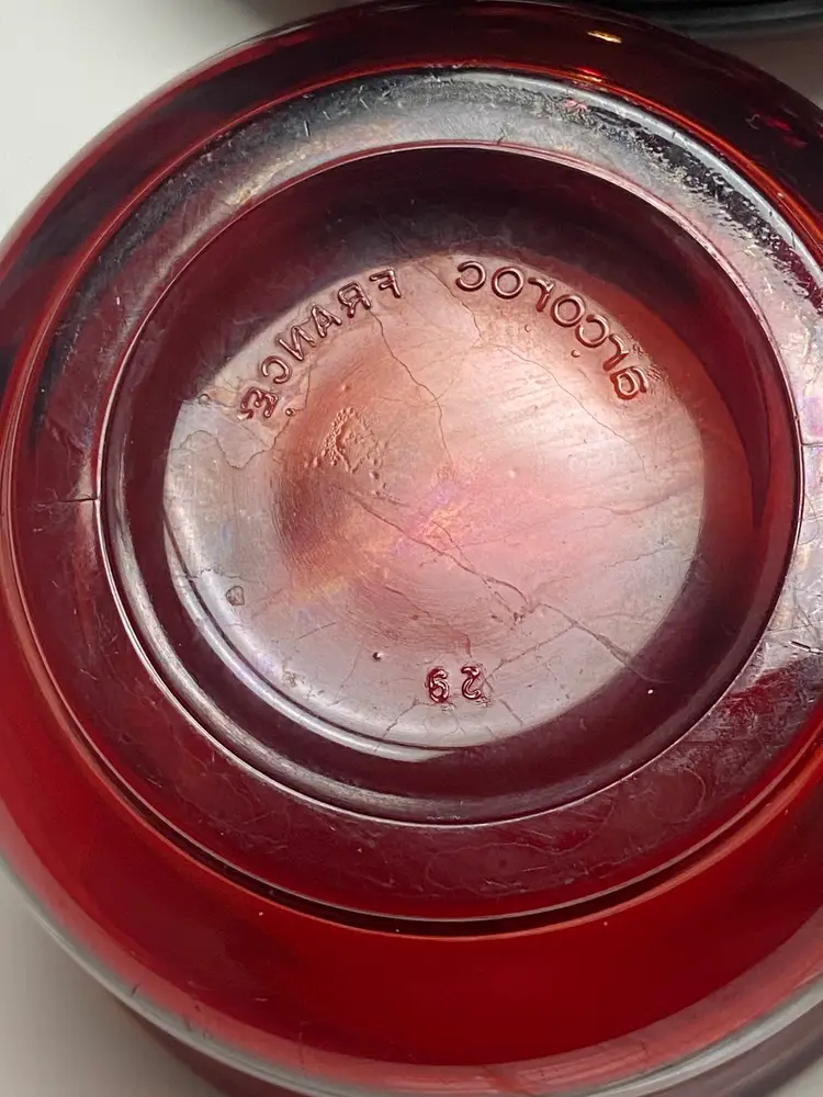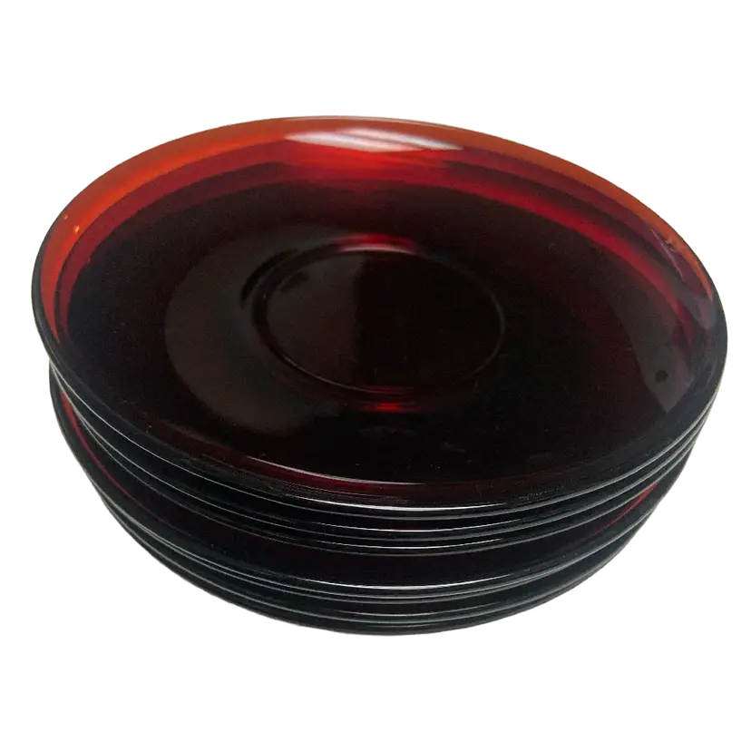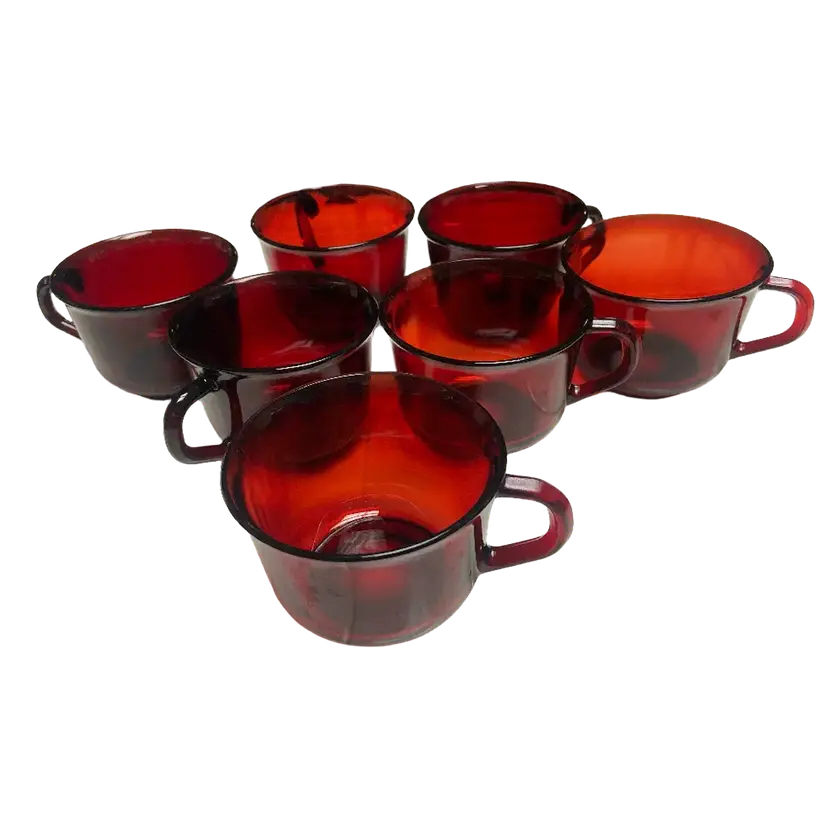 The Arcoroc Classique Glass Ruby Red Cup & Saucer Set of 7, made in France in the 1970s, exudes a vintage charm with its mid-century modern design. The round, glossy finish cups and saucers are crafted from ruby glass, adding a touch of elegance to any dining occasion. With the brand's signature incised backstamp, this original production set is a timeless piece that perfect for all occasions.