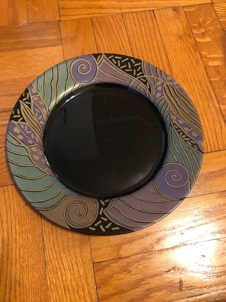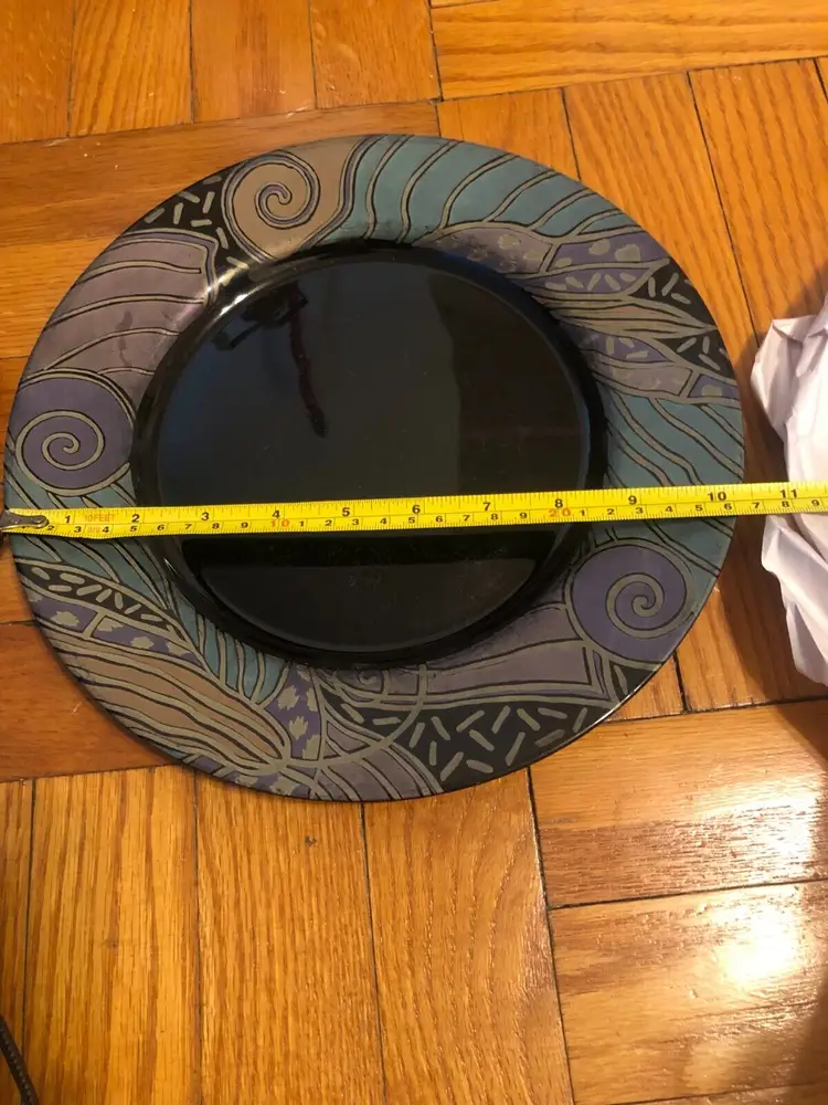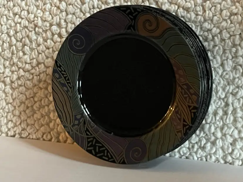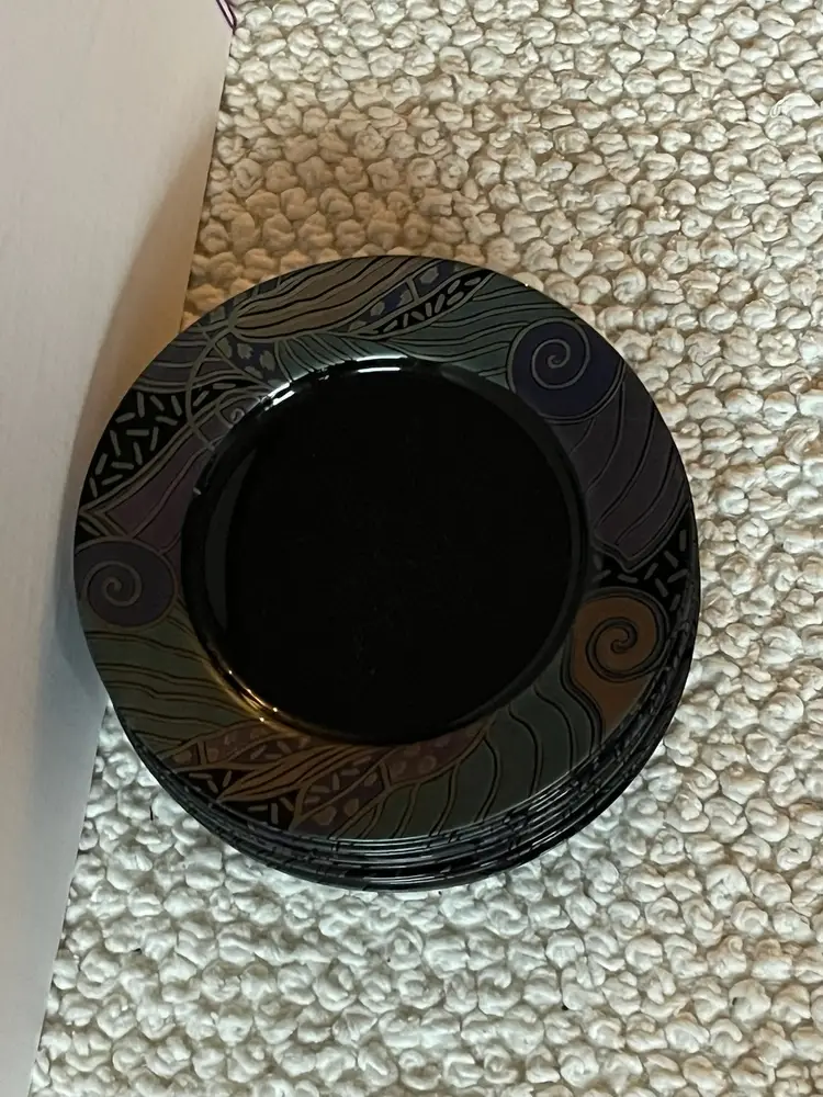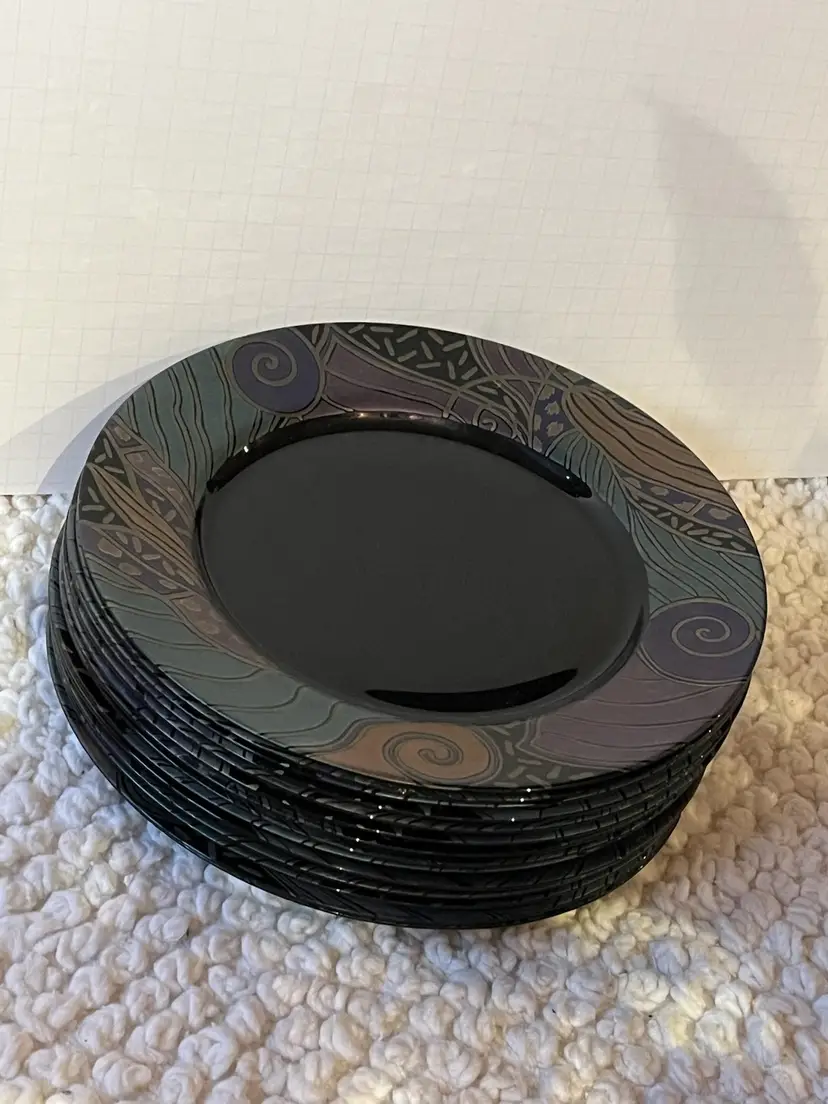 Pre owned set of 14 Arcoroc "Tampico" salad plates is a stylish addition to any table setting. 6 of the plates have silght chips at the side features a vibrant, multi-color green purple African design on round glass plates Crafted in France, these plates bear the Arcoroc brand name and are original, contemporary creations. ideal for serving salads and other main course dishes made of high-quality glass excellent condition, with some scratches