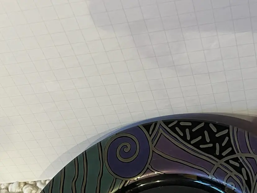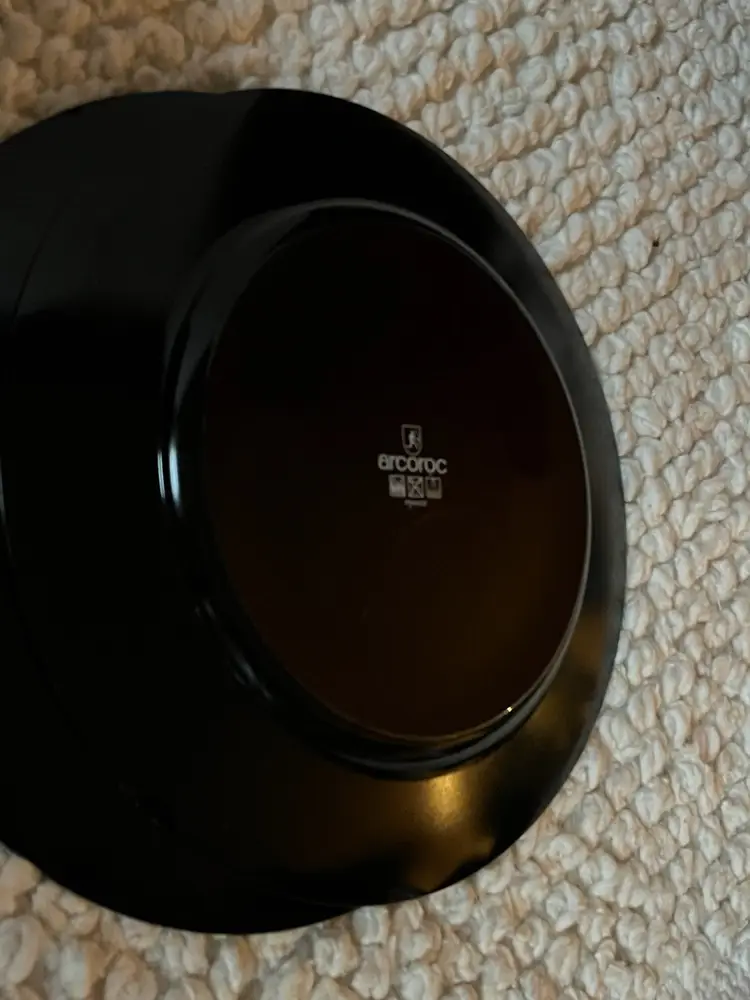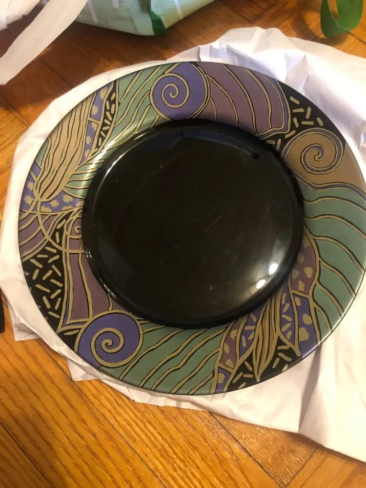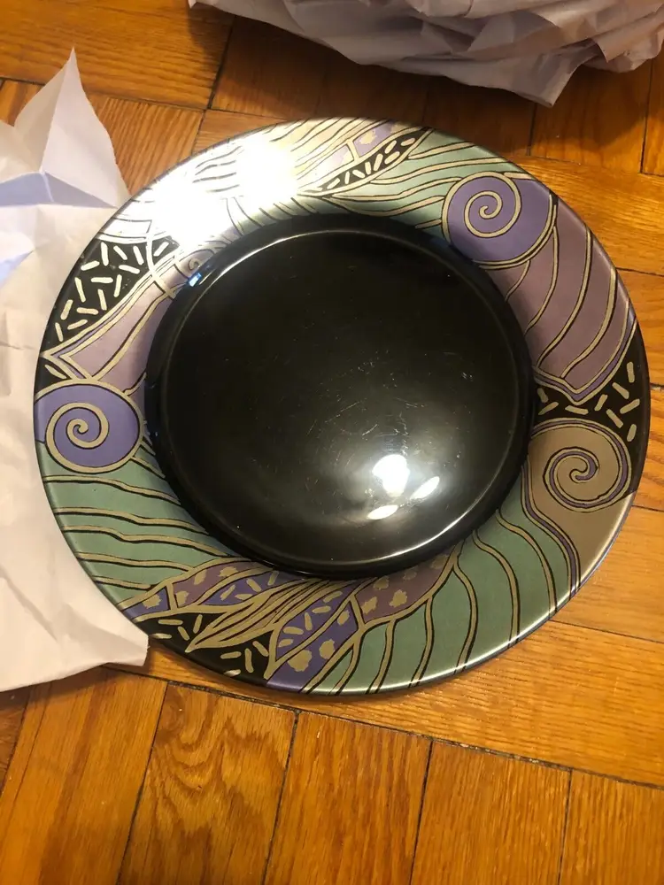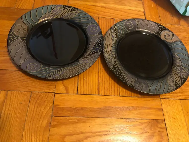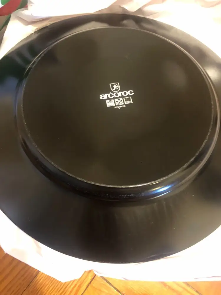 Pre owned set of 14 Arcoroc "Tampico" salad plates is a stylish addition to any table setting. 6 of the plates have silght chips at the side features a vibrant, multi-color green purple African design on round glass plates Crafted in France, these plates bear the Arcoroc brand name and are original, contemporary creations. ideal for serving salads and other main course dishes made of high-quality glass excellent condition, with some scratches