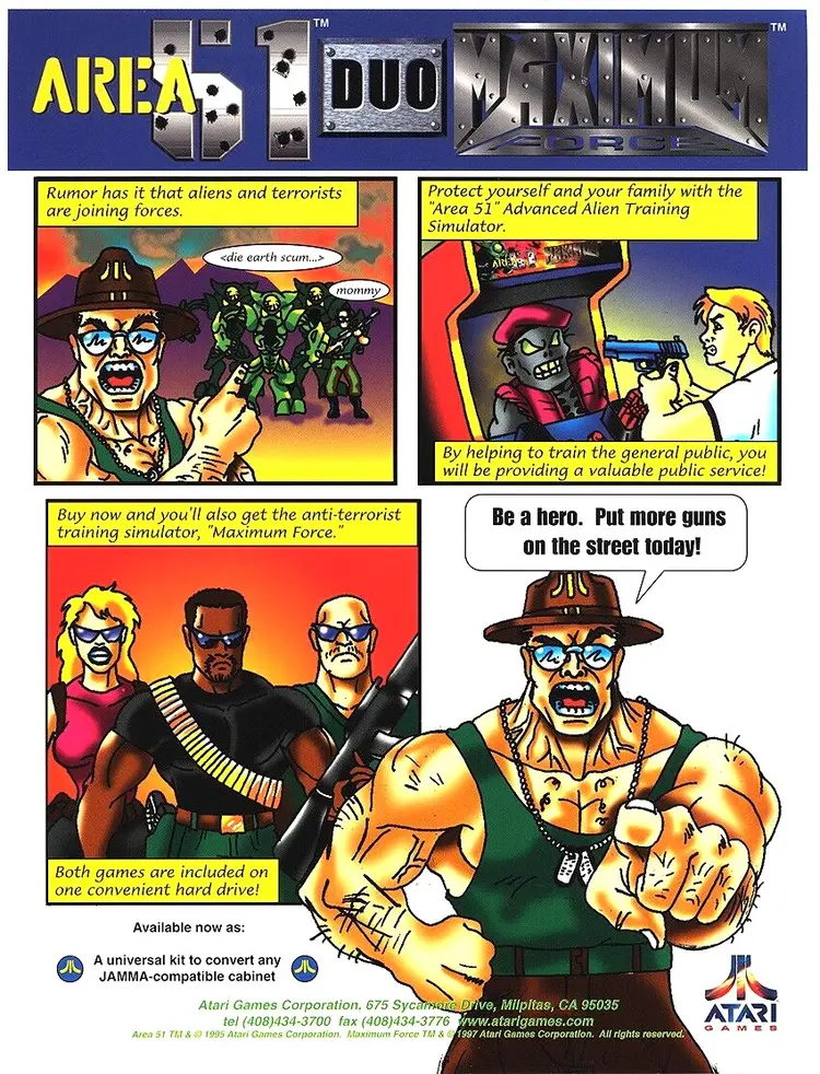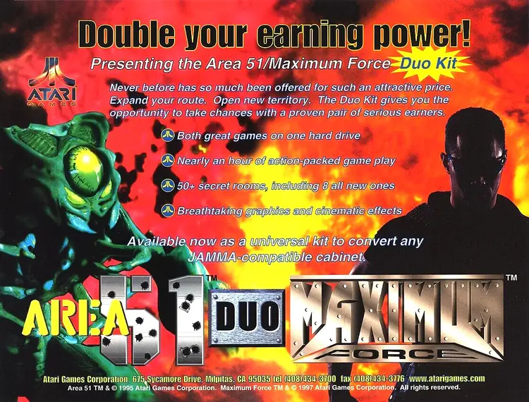 Brand: Atari Year: 1997 Game Title: Area 51 Duo Maximum Force Theme: Fantasy Original/Reproduction: Original Country/Region of Manufacture: United States Modified Item: No Arcade: Flyer