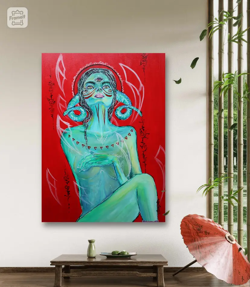 Acrylic on canvas painting. 24 x 31.5 in. The warrior goddess. Acrylic on canvas, painted in 2019. A treasured piece. This piece brings a fiery inspiration and protection.