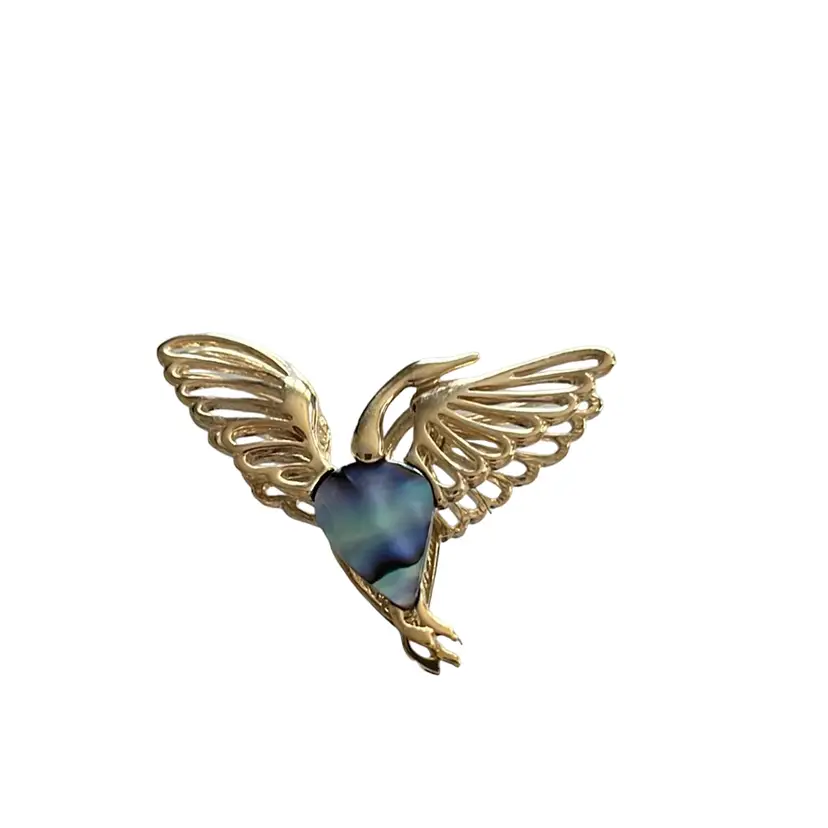 This exquisite Ariki Paua Shell Bird Brooch is a stunning piece of jewelry that will add a touch of elegance to any outfit. Crafted in New Zealand, this brooch features a beautiful iridescent main stone made of natural shell material. The brooch is signed by the designer and is perfect for those who love birds and unique, vintage jewelry. It will make a great addition to any collection and is sure to impress.