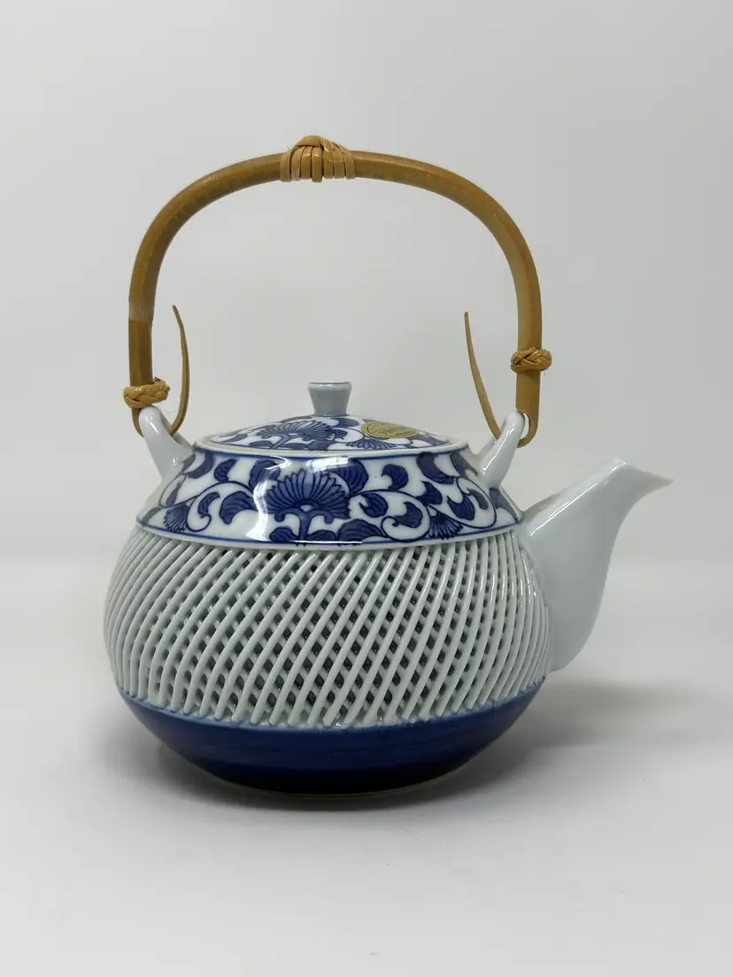 Experience serene elegance with this vintage Arita Yaki porcelain teapot set featuring a hand-painted blue chrysanthemum lattice design. Crafted in the 1980s in Arita, Japan, this exquisite tea set includes a round teapot with bamboo handle and five matching cylindrical cups—ideal for authentic Japanese tea ceremonies or adding cottagecore charm to your home décor.