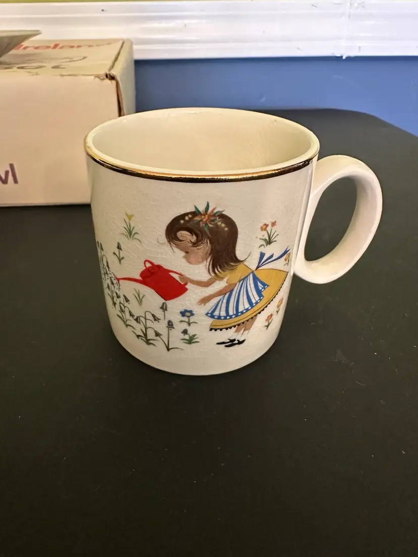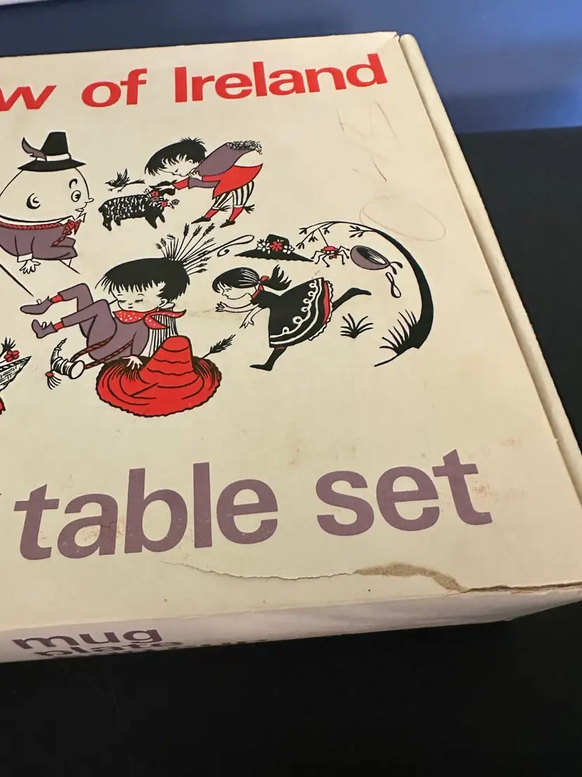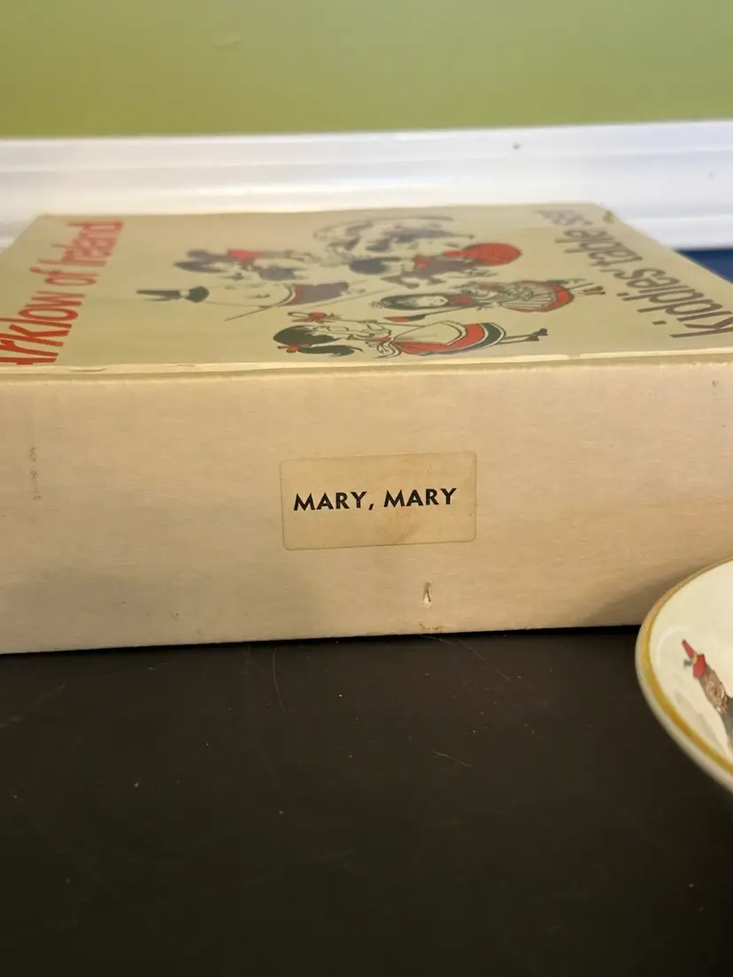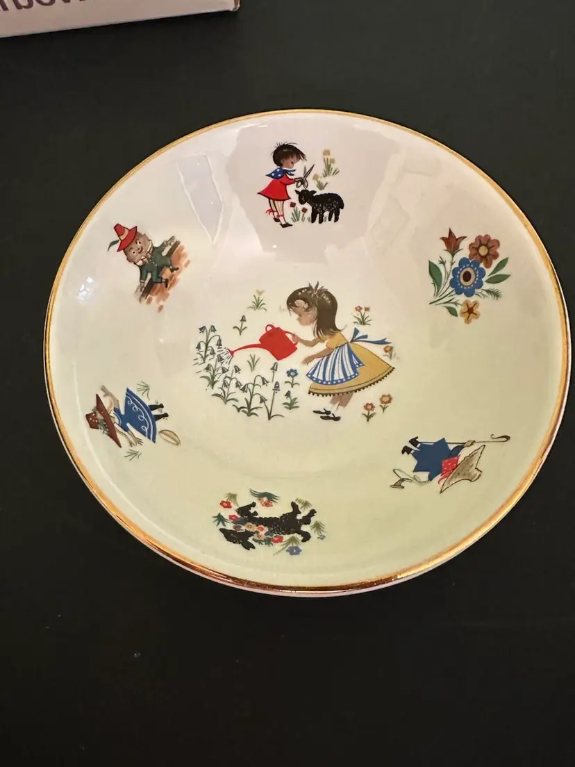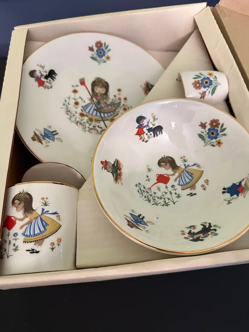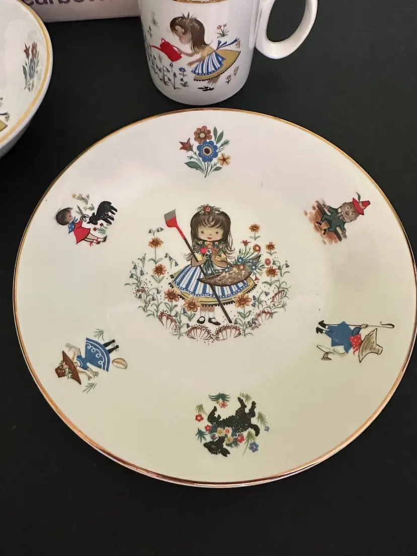 Preowned- set includes mug, plate, egg cup, cereal bowl featuring Mary Mary Quite Contrary with other nursery rhyme characters along edges of bowl. Set does have crazing and box has wear from storage. Plate has a manufacturer flaw. Please review all pictures.
