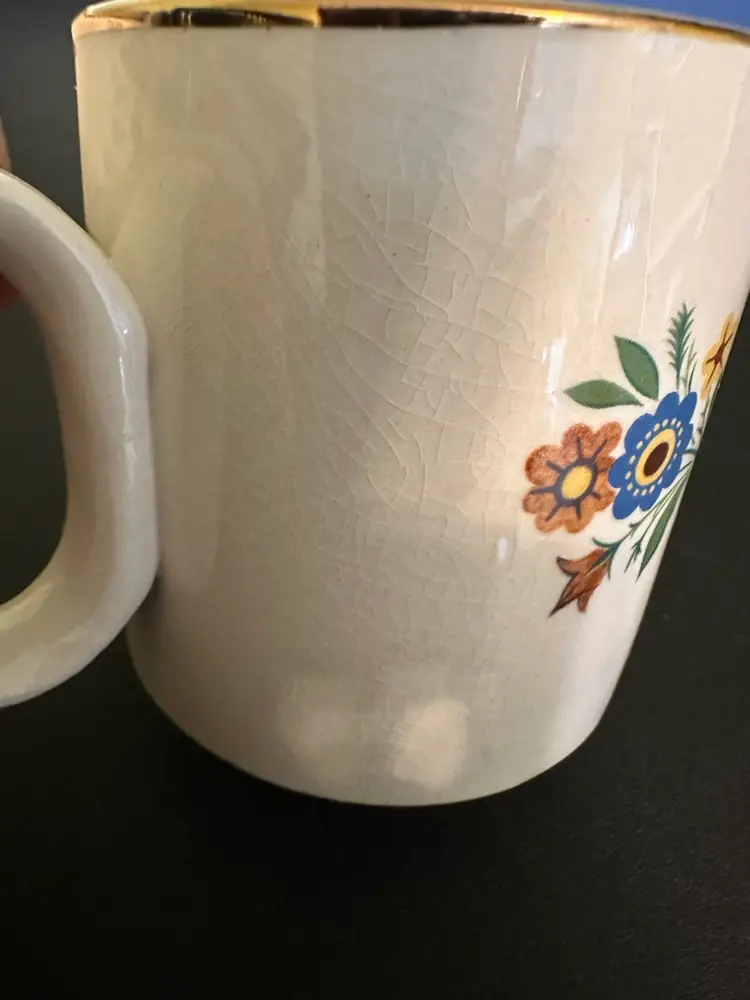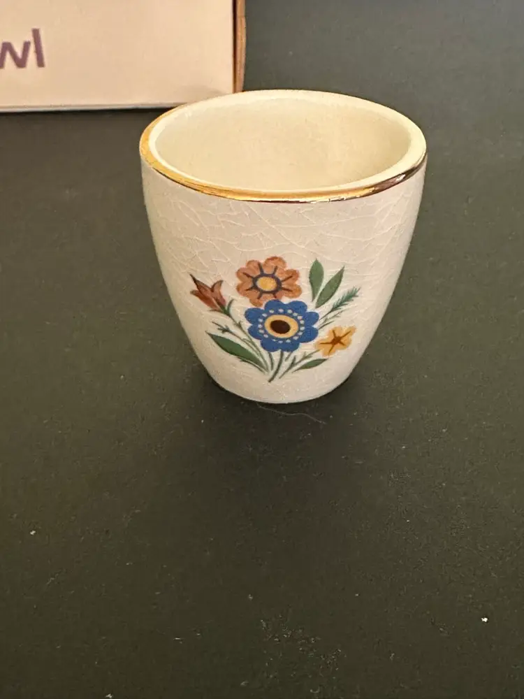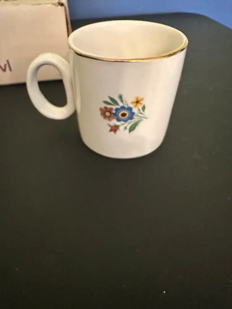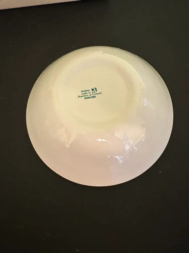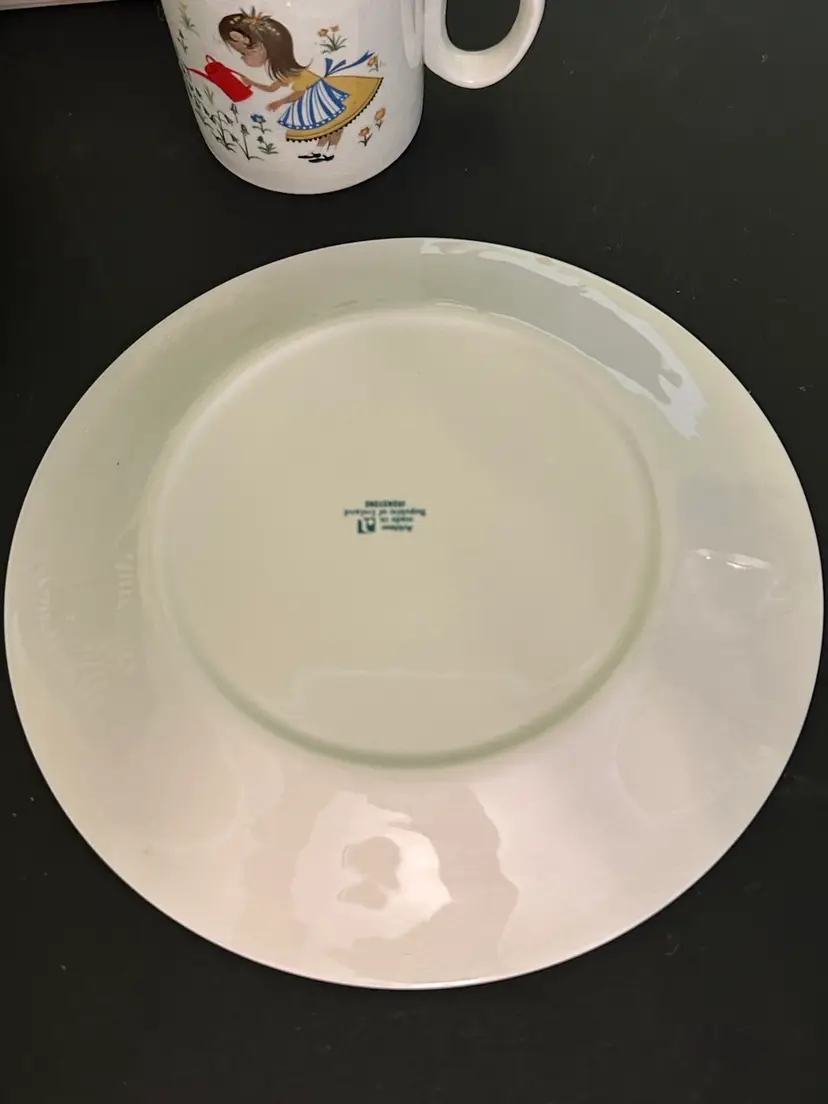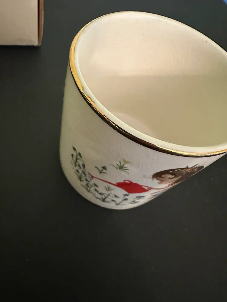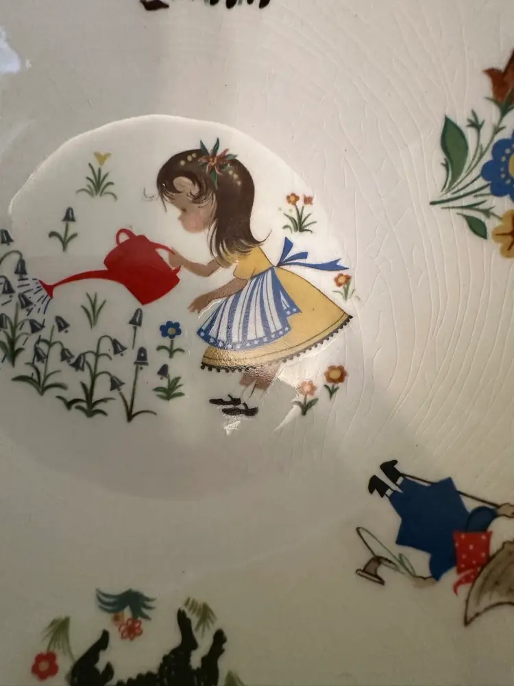Preowned- set includes mug, plate, egg cup, cereal bowl featuring Mary Mary Quite Contrary with other nursery rhyme characters along edges of bowl. Set does have crazing and box has wear from storage. Plate has a manufacturer flaw. Please review all pictures.