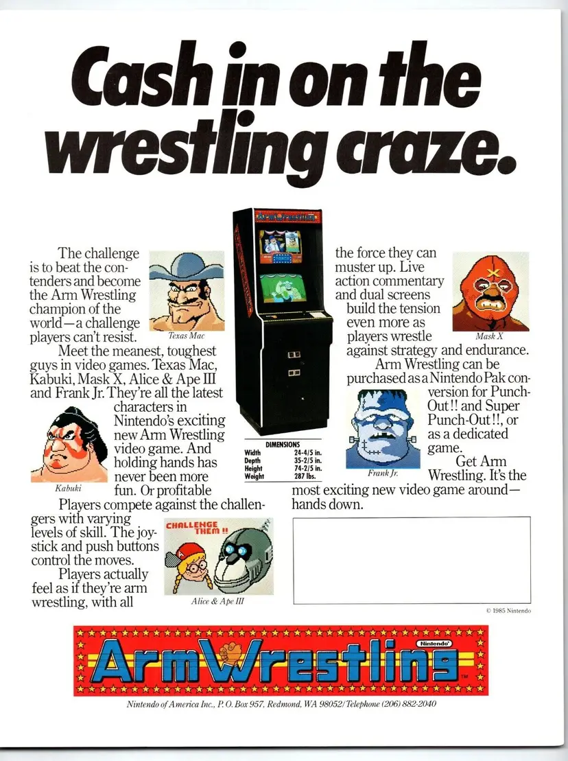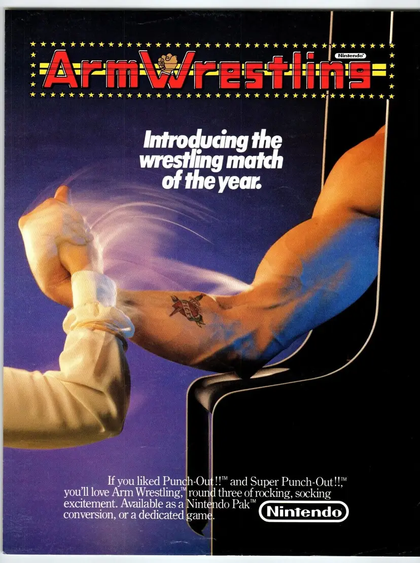Brand: Nintendo Year: 1985 Game Title: Arm Wrestling Theme: Sports Original/Reproduction: Original Country/Region of Manufacture: United States Modified Item: No Arcade: Flyer
