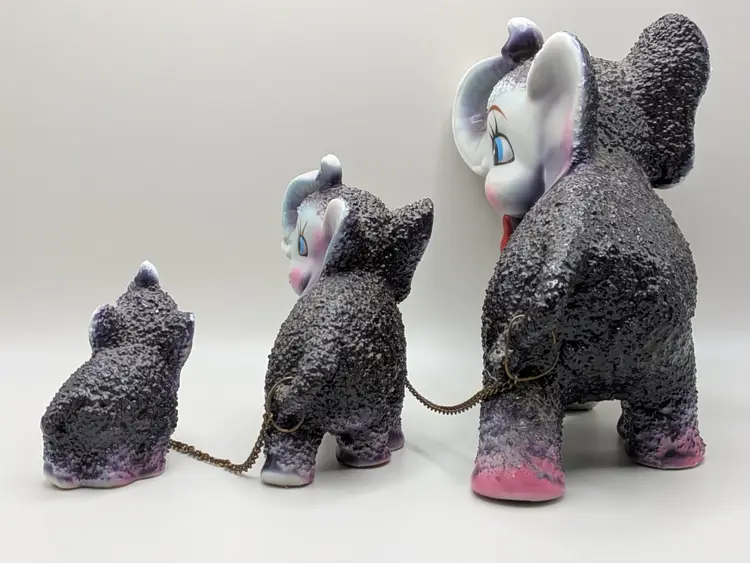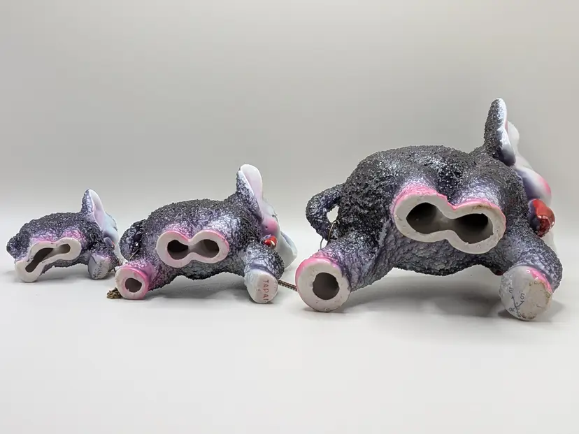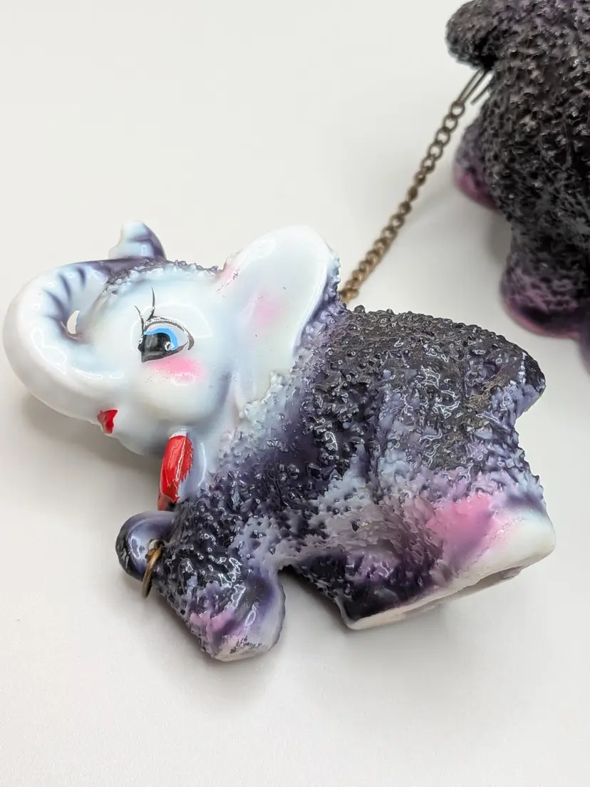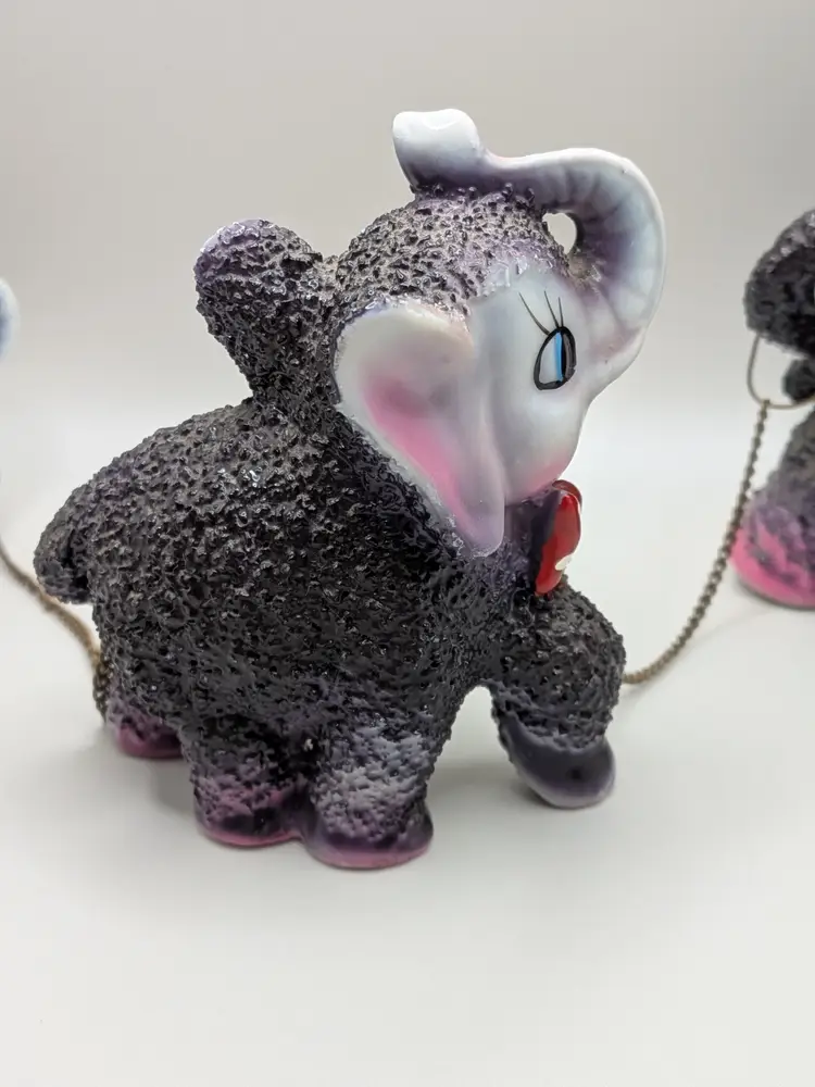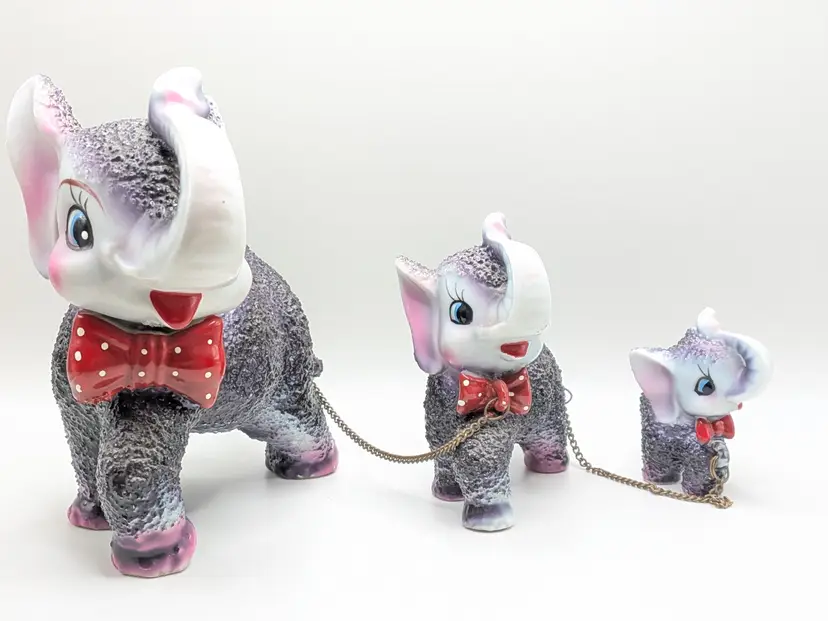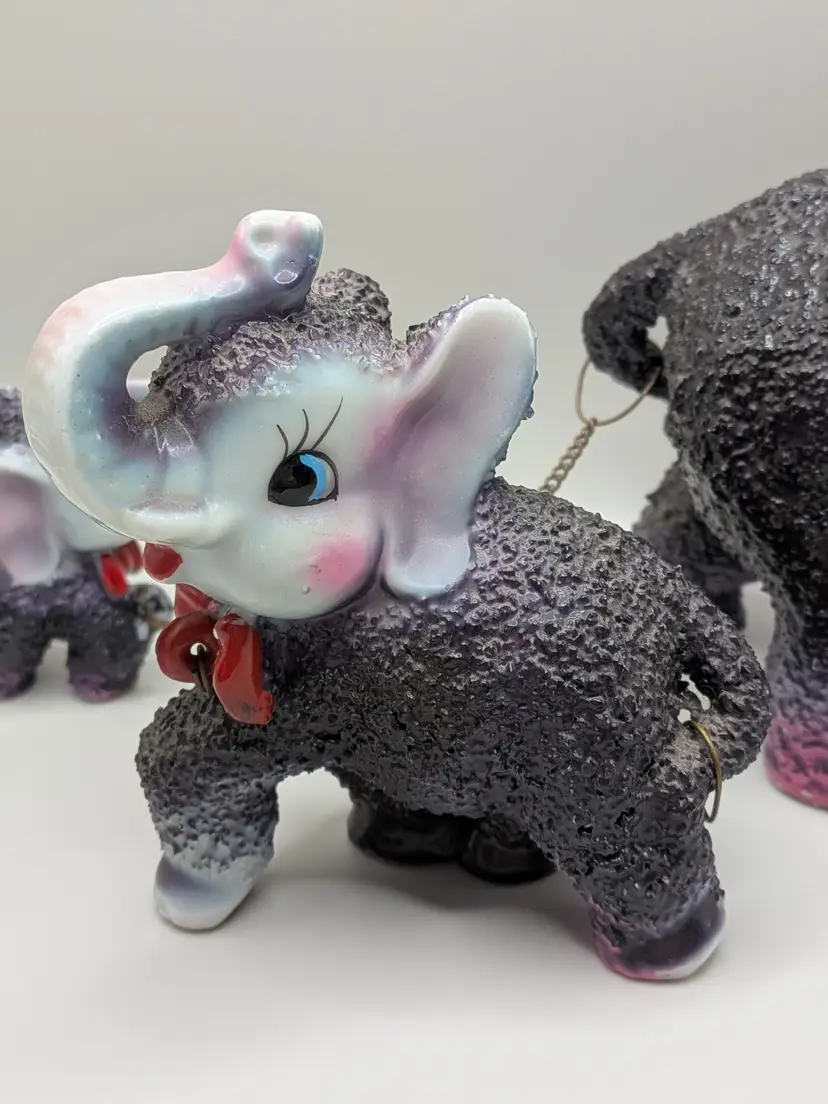 This three-piece set of Anthropomorphic Kitsch Sugar Coated Elephants comes with the momma and two (2) chained babies. Made by Arnart (marked on base) in Japan, this is a rare and unique collectible from the 1950s. Made of ceramic featuring a sugar coated glazed finish, these figurines are decorated in pink, purple, red, and blue colors. The textured design adds the perfect kitschy touch! These figurines will be well packaged for safe delivery, making them a delightful addition to any collection of decorative sculptures and figurines.