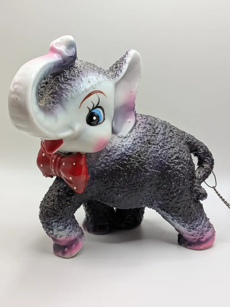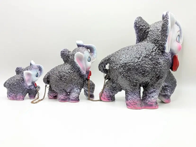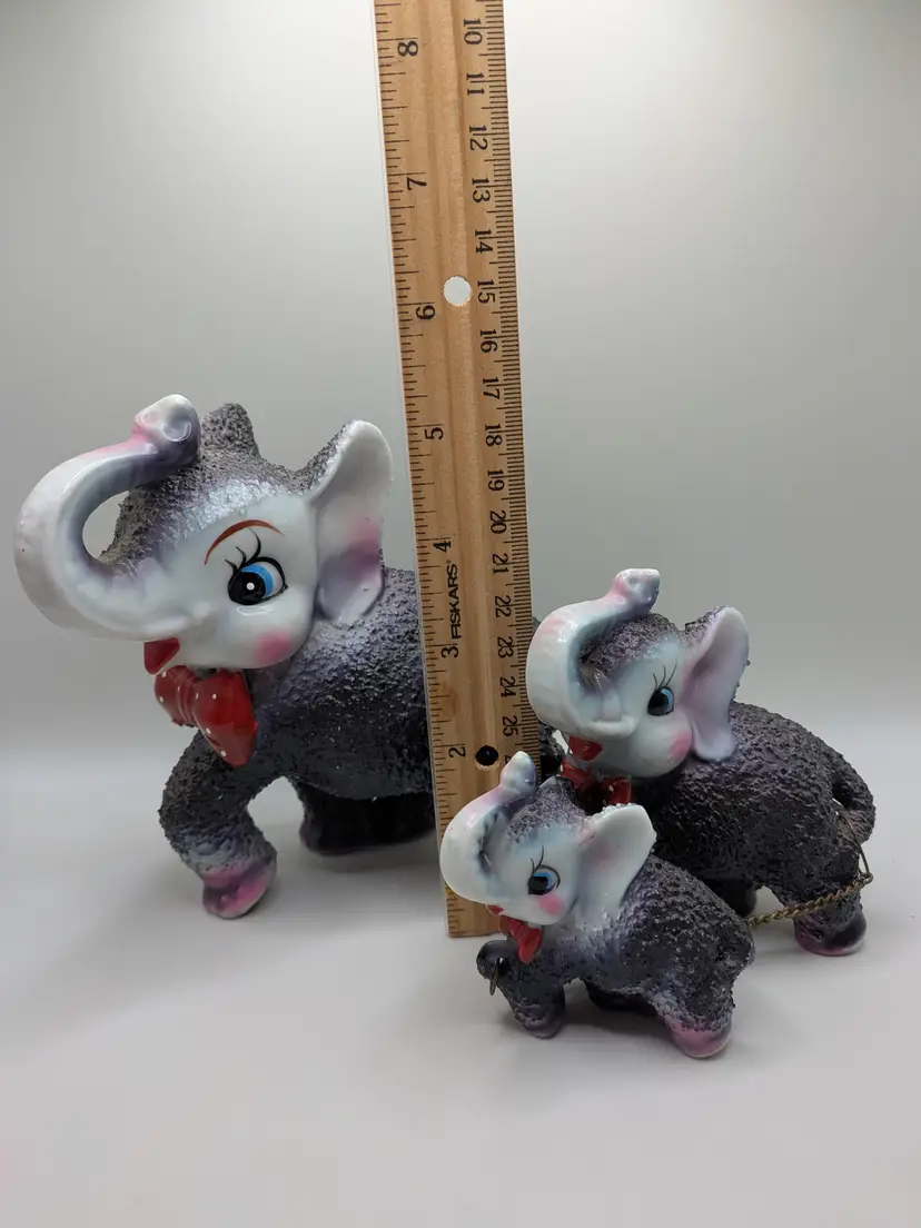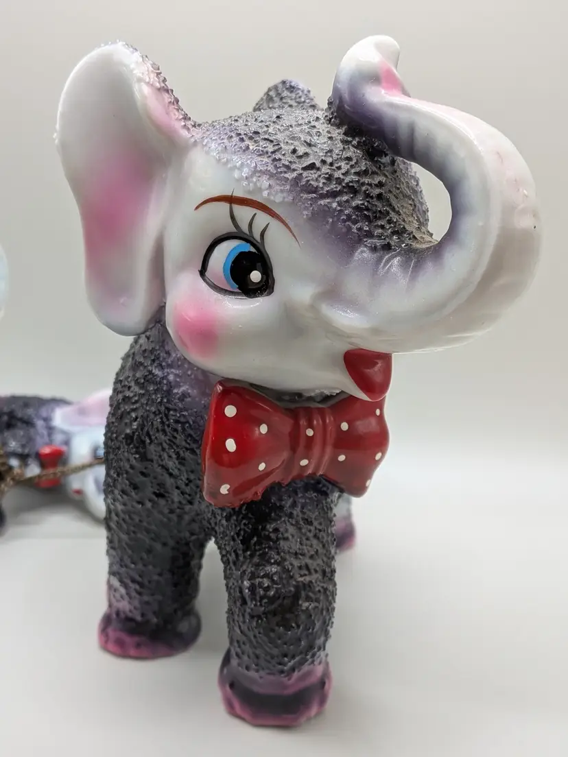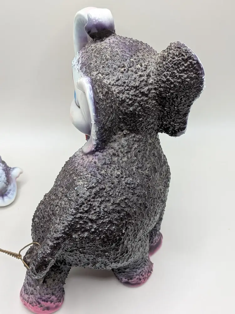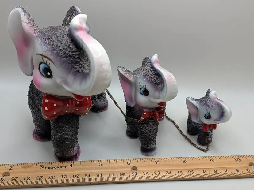 This three-piece set of Anthropomorphic Kitsch Sugar Coated Elephants comes with the momma and two (2) chained babies. Made by Arnart (marked on base) in Japan, this is a rare and unique collectible from the 1950s. Made of ceramic featuring a sugar coated glazed finish, these figurines are decorated in pink, purple, red, and blue colors. The textured design adds the perfect kitschy touch! These figurines will be well packaged for safe delivery, making them a delightful addition to any collection of decorative sculptures and figurines.