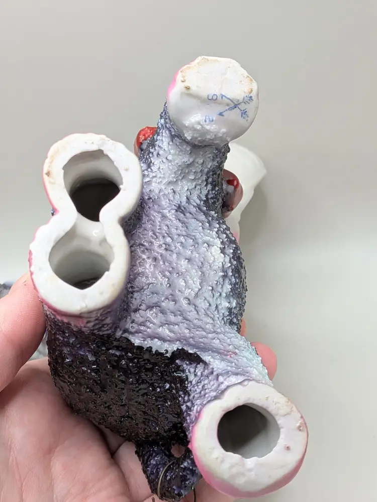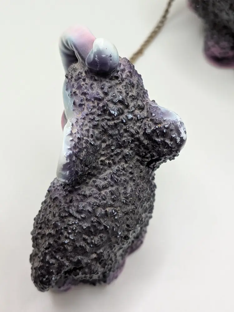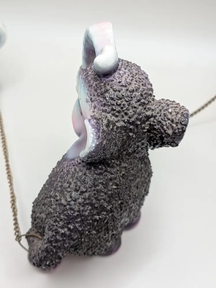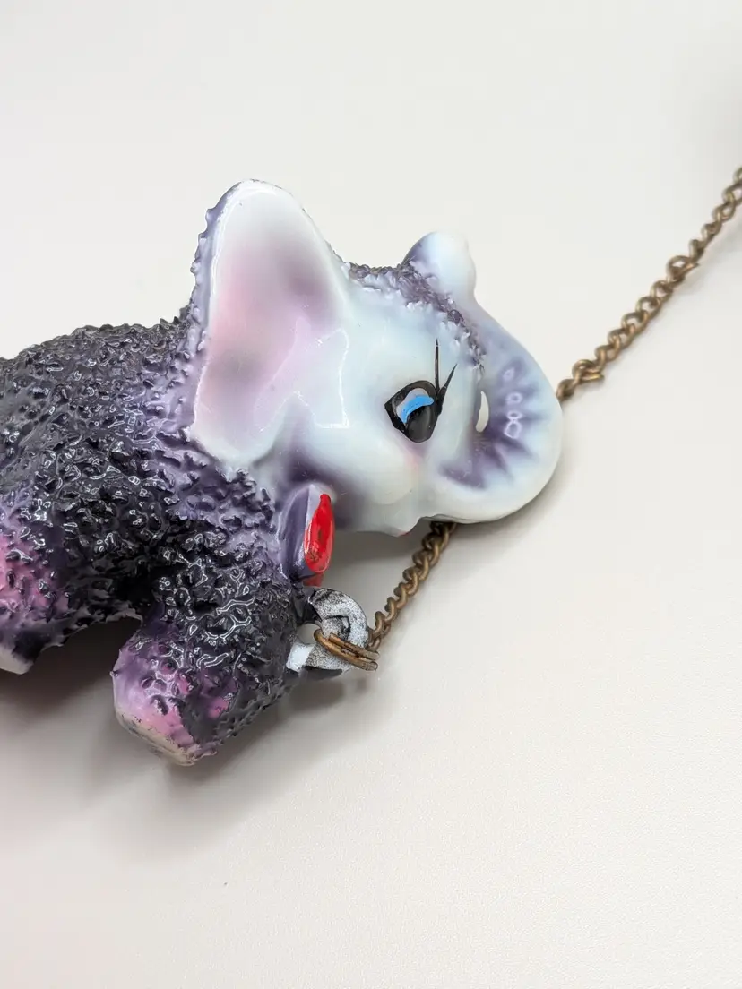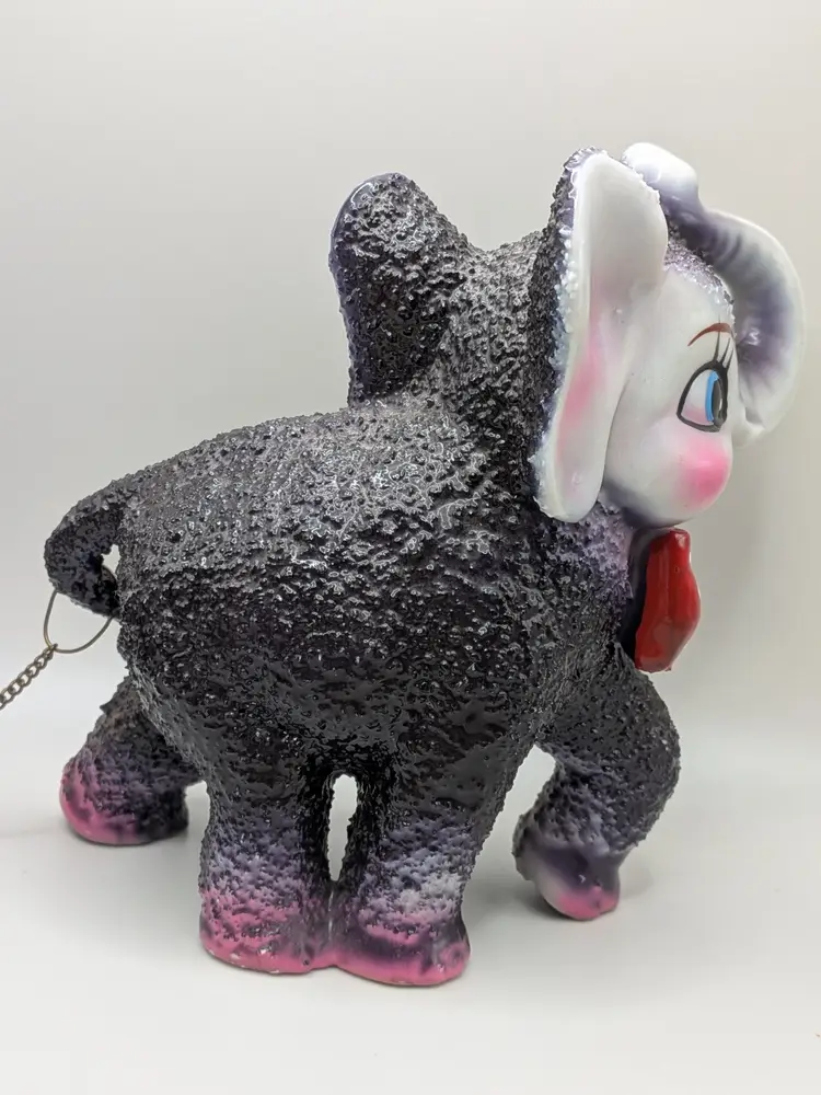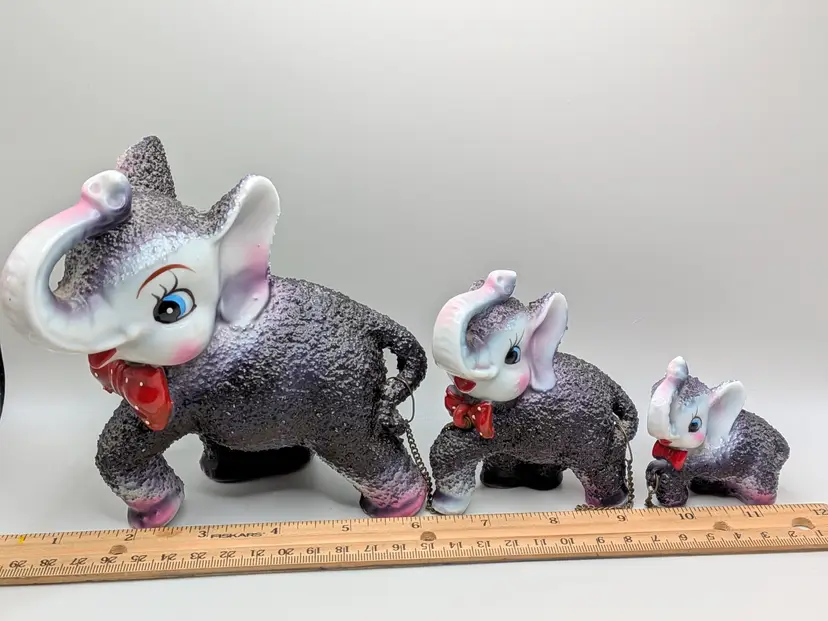 This three-piece set of Anthropomorphic Kitsch Sugar Coated Elephants comes with the momma and two (2) chained babies. Made by Arnart (marked on base) in Japan, this is a rare and unique collectible from the 1950s. Made of ceramic featuring a sugar coated glazed finish, these figurines are decorated in pink, purple, red, and blue colors. The textured design adds the perfect kitschy touch! These figurines will be well packaged for safe delivery, making them a delightful addition to any collection of decorative sculptures and figurines.