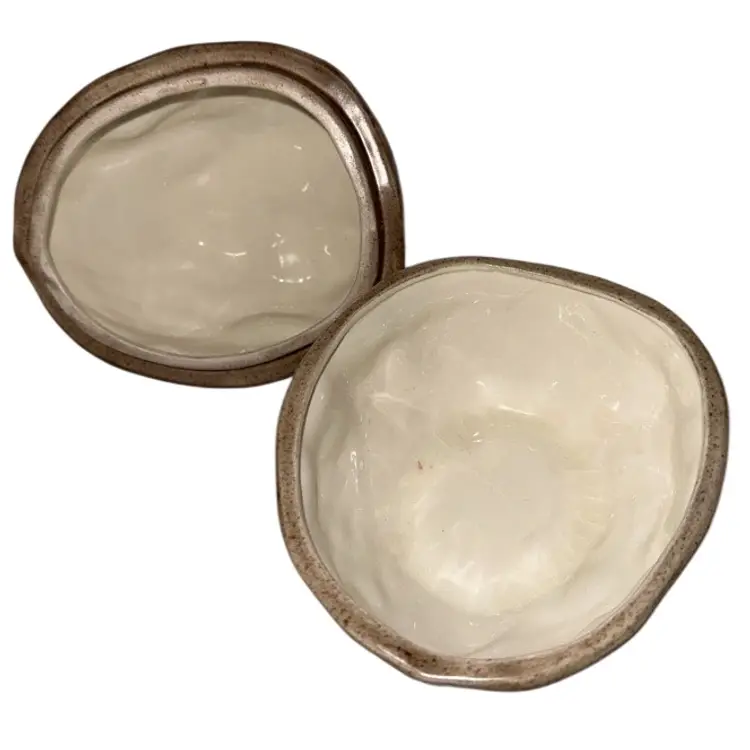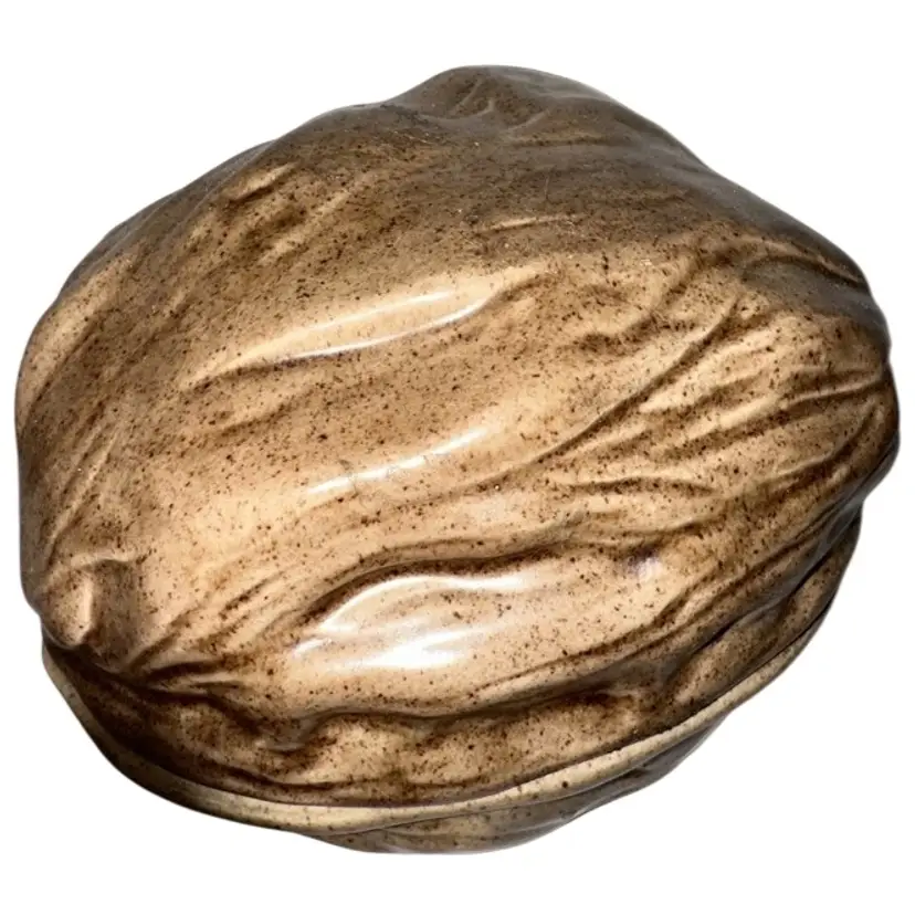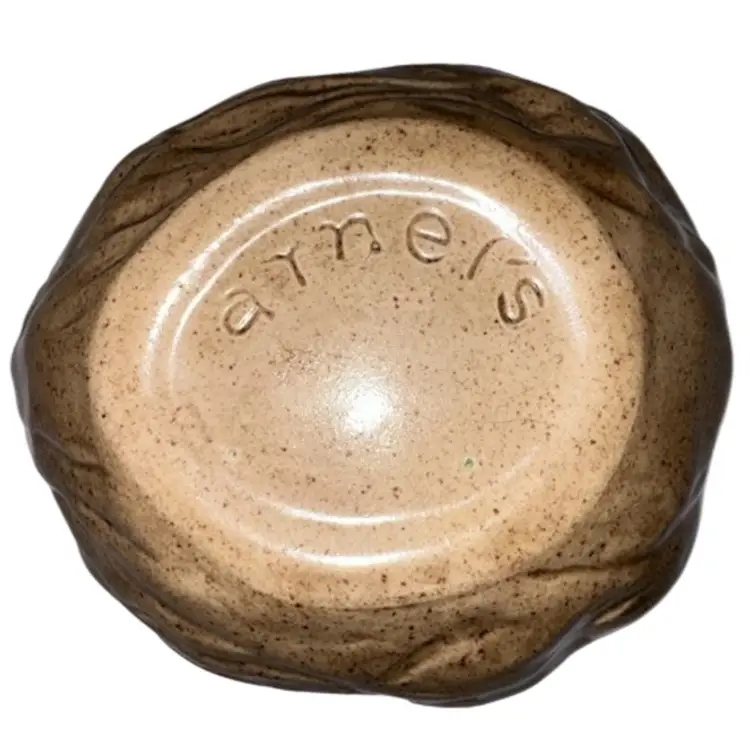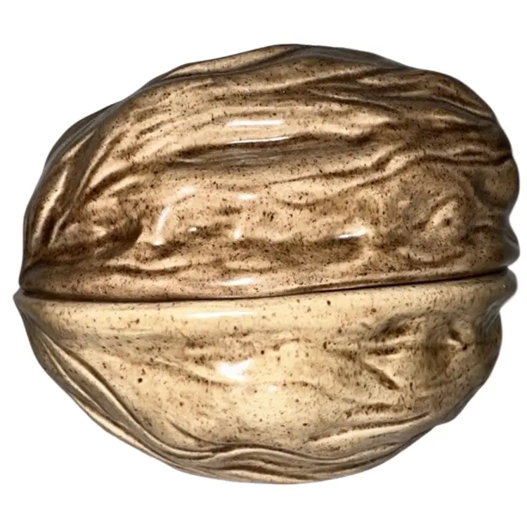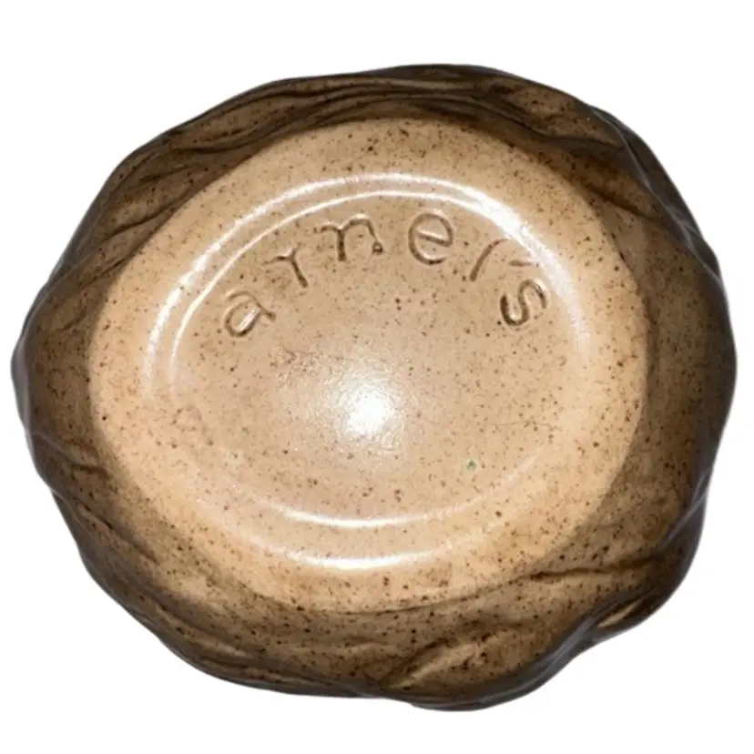 Arnel's Walnut Bowl 5" Lidded Brown Glazed Nut Bar Decor Whimsical 1971 Vintage 5” tall x 6” x 5” No chips or cracks but some slight areas of discoloration on inside bottom and some light crazing on inside bottom.